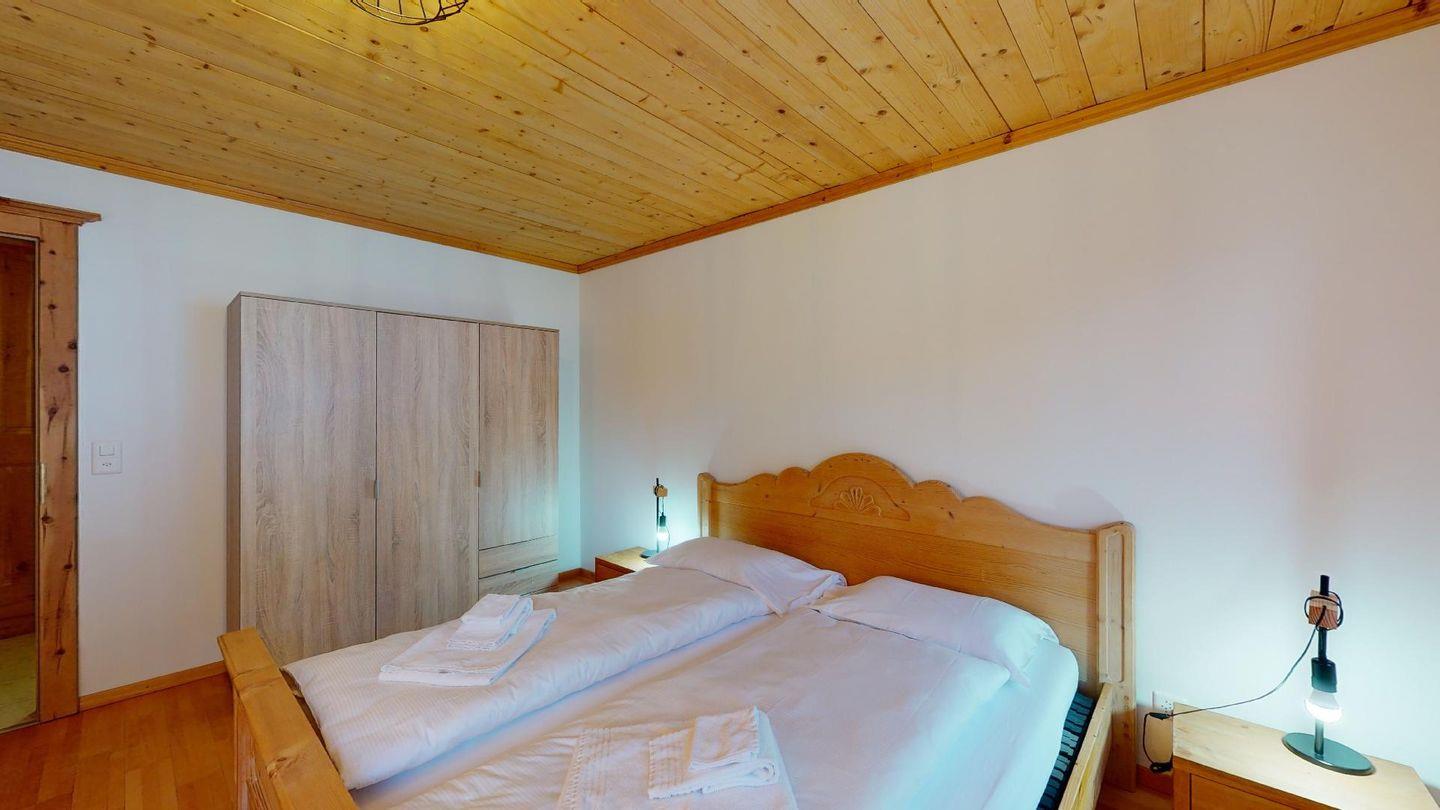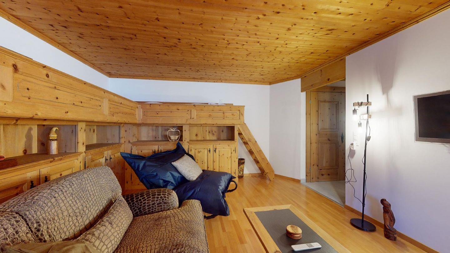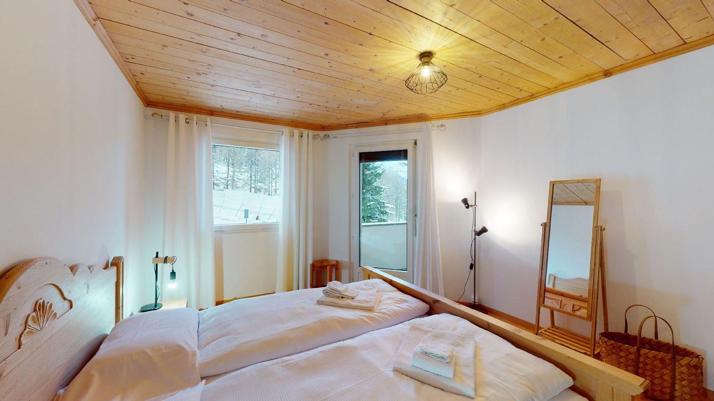 2 ½ Zimmerwohnung im 1. Obergeschoss. Entrée mit Garderobe. Wohn-/Esszimmer mit 3 eingebauten Hochbetten und Ausgang auf den Balkon. Geschlossene Küche mit Ausgang auf den Balkon. Ein Doppelschlafzimmer mit Ausgang auf den Balkon. Dusche/WC/Lavabo. Garagenplatz. Gemeinschaftliche Waschküche.