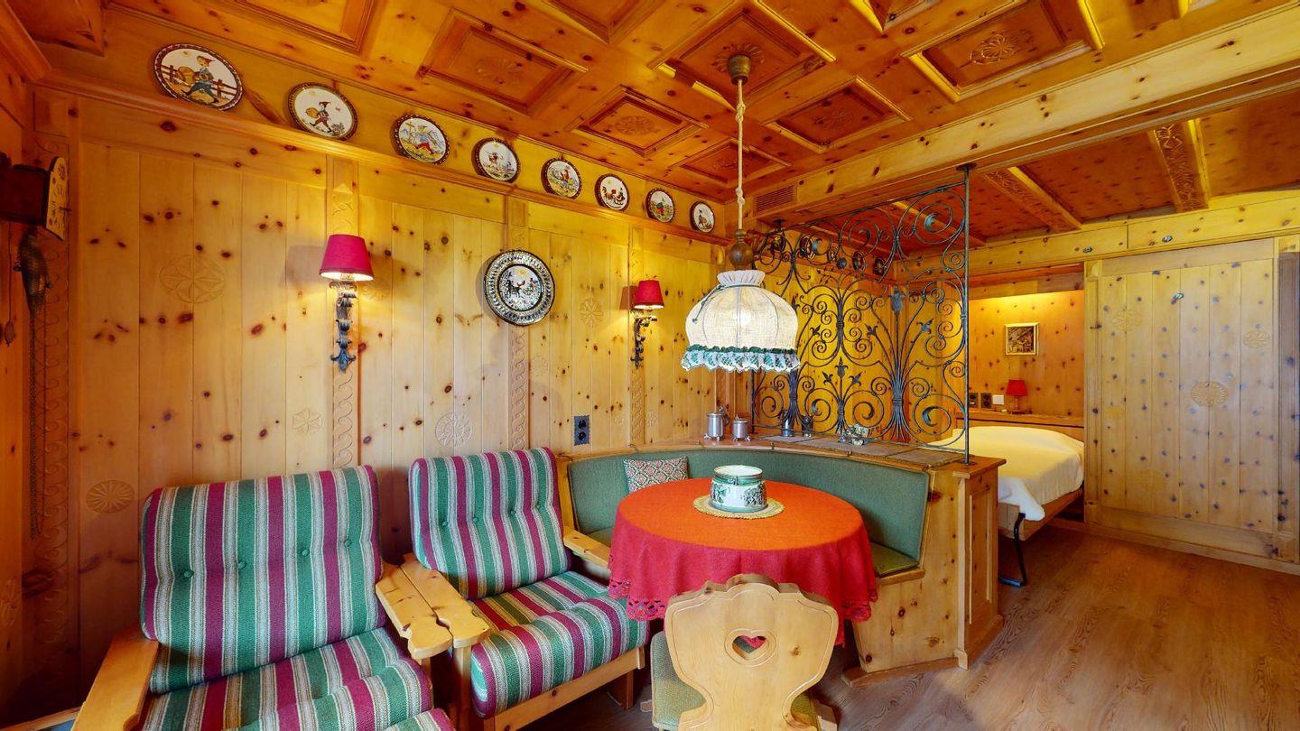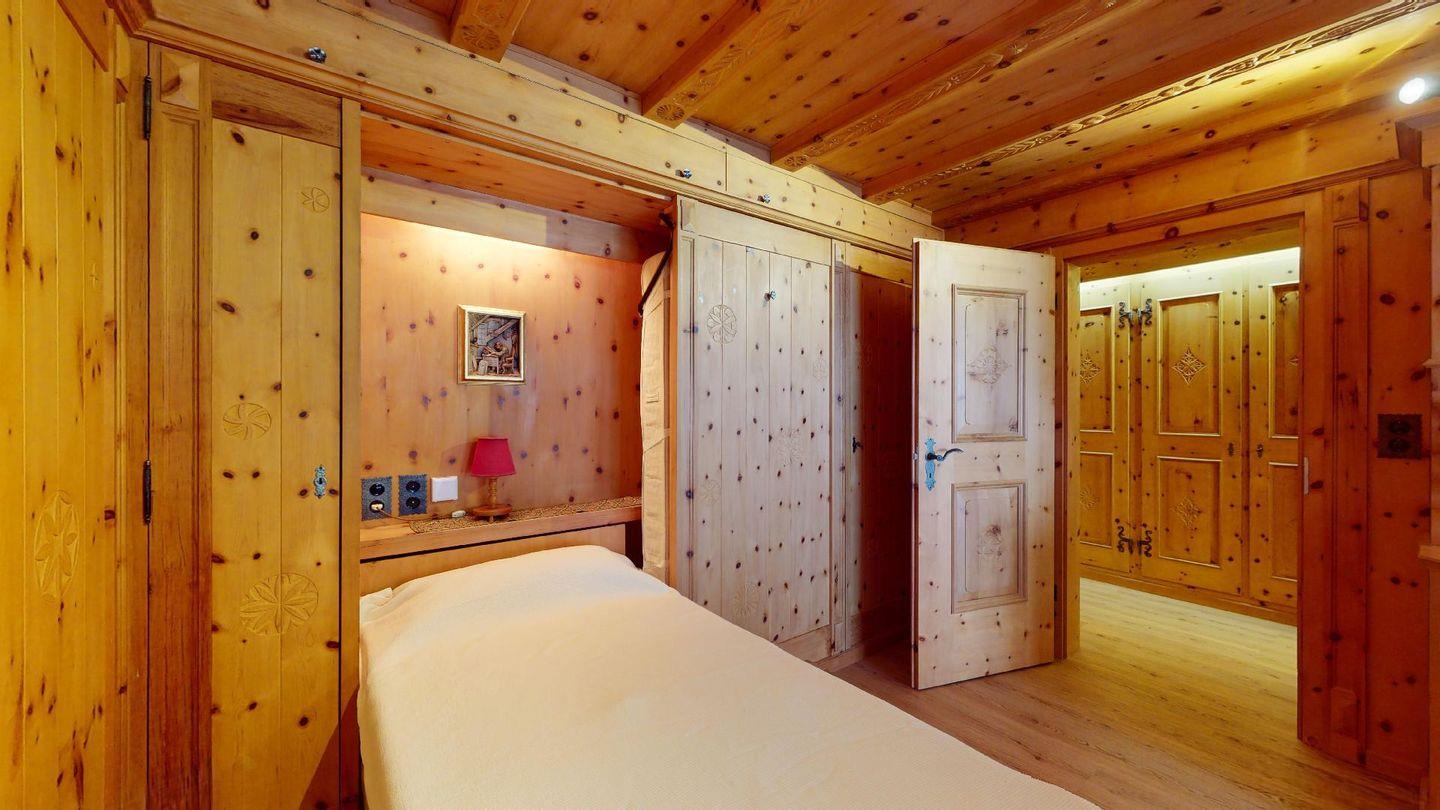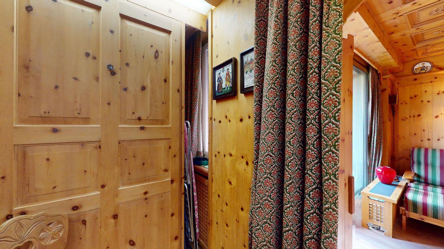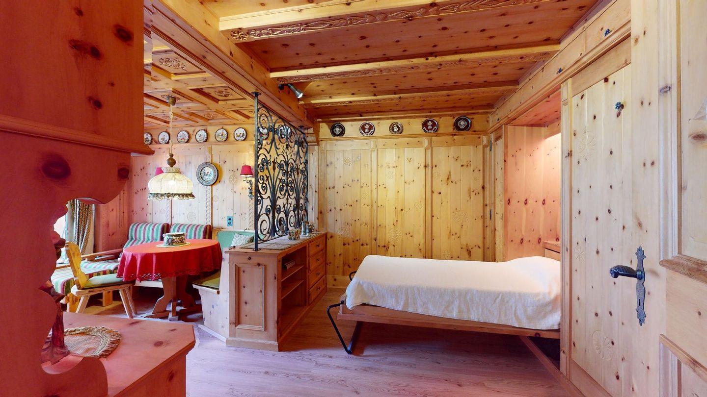 Hochwertig mit Holz verkleidete 1-Zimmerwohnung im 2. Stock für 2 Personen. Eingang mit Garderobe. Wohnzimmer mit Wohn- und Essbereich mit Ausgang auf den Balkon. 2 Schrankbetten. Geschlossene Küche. Separates Badezimmer mit Dusche/WC/Lavabo. Radio, TV und Internet. Aussenparkplatz. Haustiere sind nicht erlaubt. Nichtraucherwohnung.