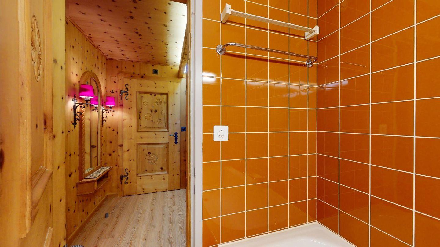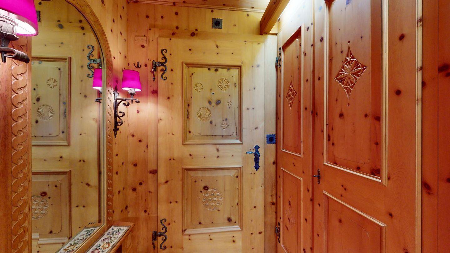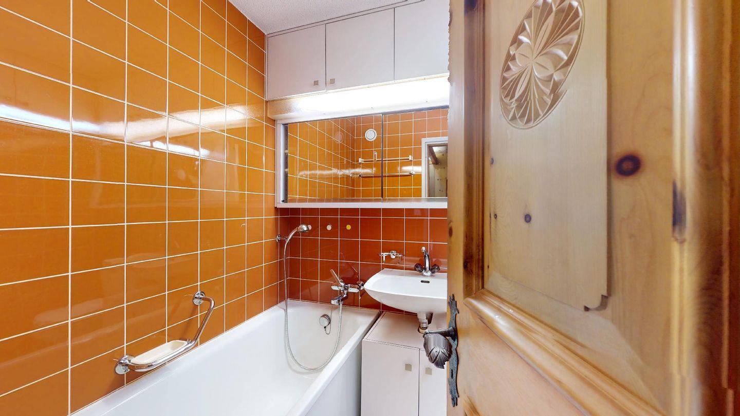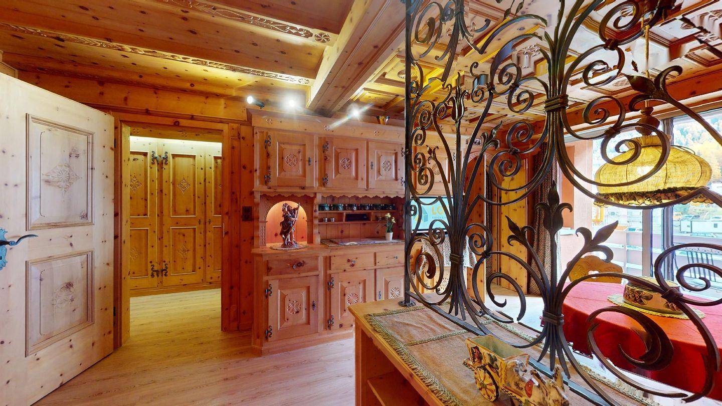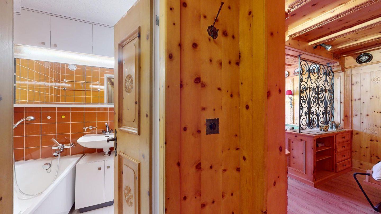 Hochwertig mit Holz verkleidete 1-Zimmerwohnung im 2. Stock für 2 Personen. Eingang mit Garderobe. Wohnzimmer mit Wohn- und Essbereich mit Ausgang auf den Balkon. 2 Schrankbetten. Geschlossene Küche. Separates Badezimmer mit Dusche/WC/Lavabo. Radio, TV und Internet. Aussenparkplatz. Haustiere sind nicht erlaubt. Nichtraucherwohnung.