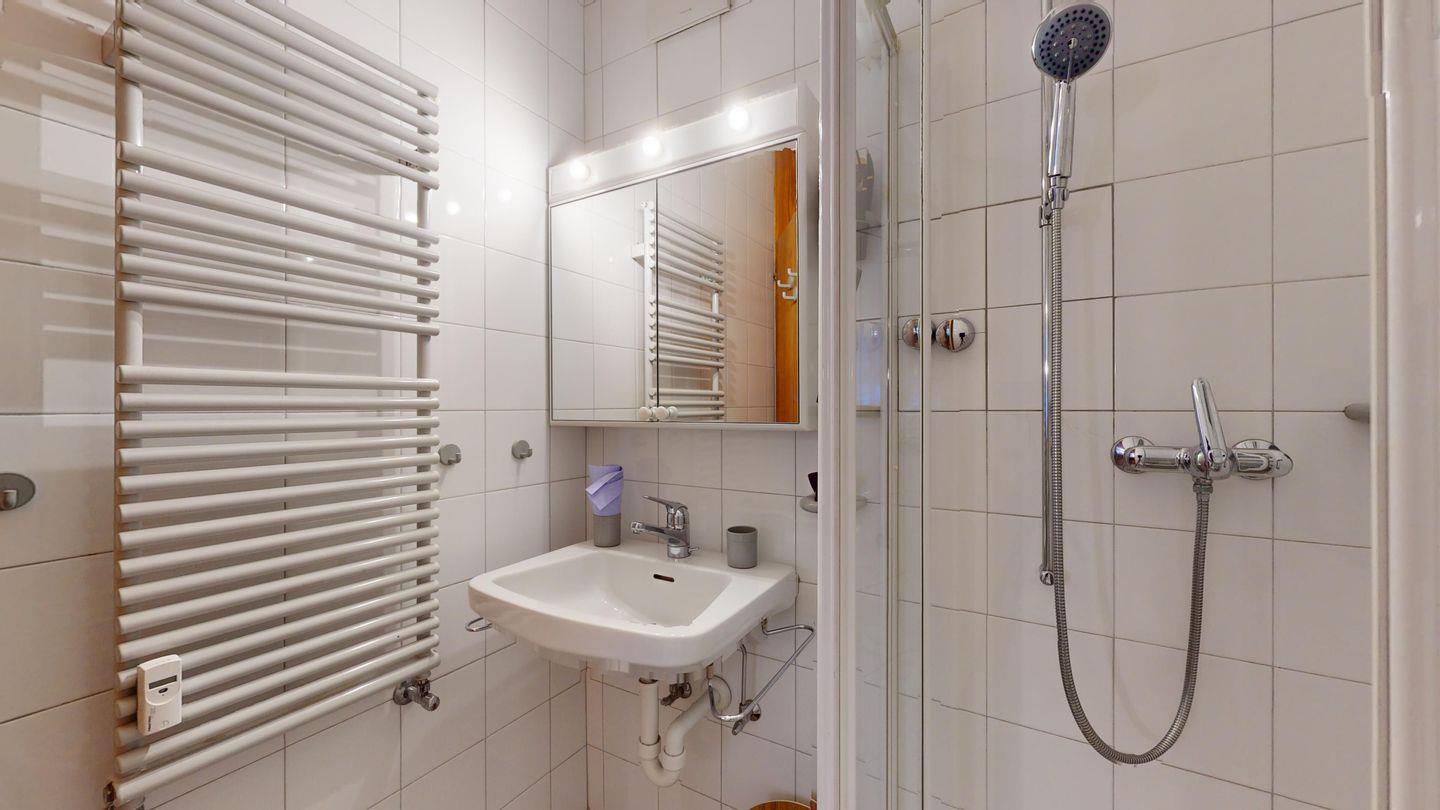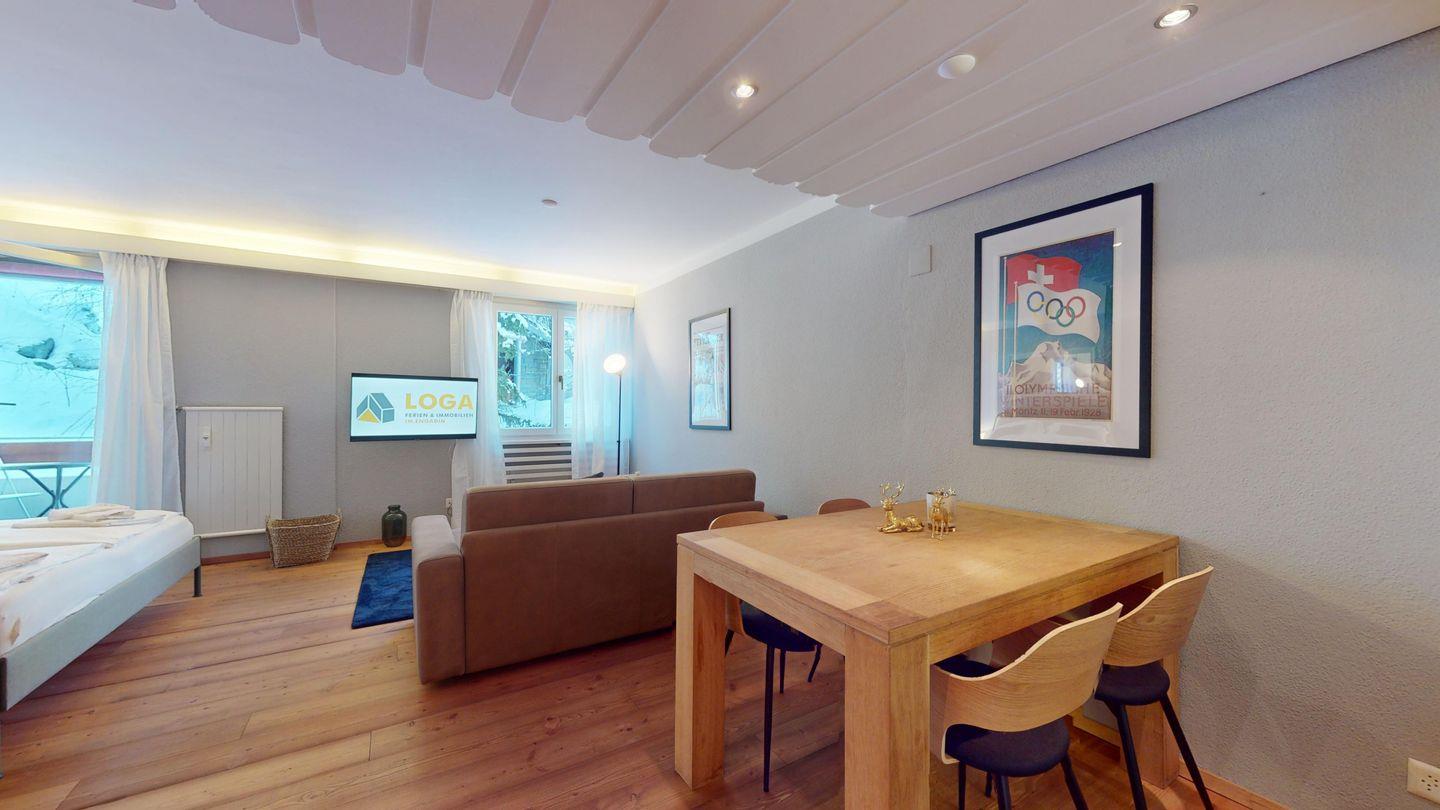 1-Zimmerwohnung im 3. Obergeschoss. Eingang mit Garderobe. Wohnzimmer mit Wohn- und Schlafbereich mit Ausgang auf den Balkon. Schlafecke mit Doppelbett (2 x 90cm x 200cm) und Verdunkelungsmöglichkeit. Offene Küchenzeile mit Herd (2 Platten), Geschirrspüler, Mikrowelle und Chicco d'Oro Kaffeemaschine. Esstisch für vier. Separates Badezimmer mit Dusche/WC/Lavabo. Nach Verfügbarkeit Aussenparkplatz (kann nicht reserviert werden). Haustiere sind nicht erlaubt. Gemeinschaftliche Waschküche. Skiraum in der Wohnung. Kein Veloraum.