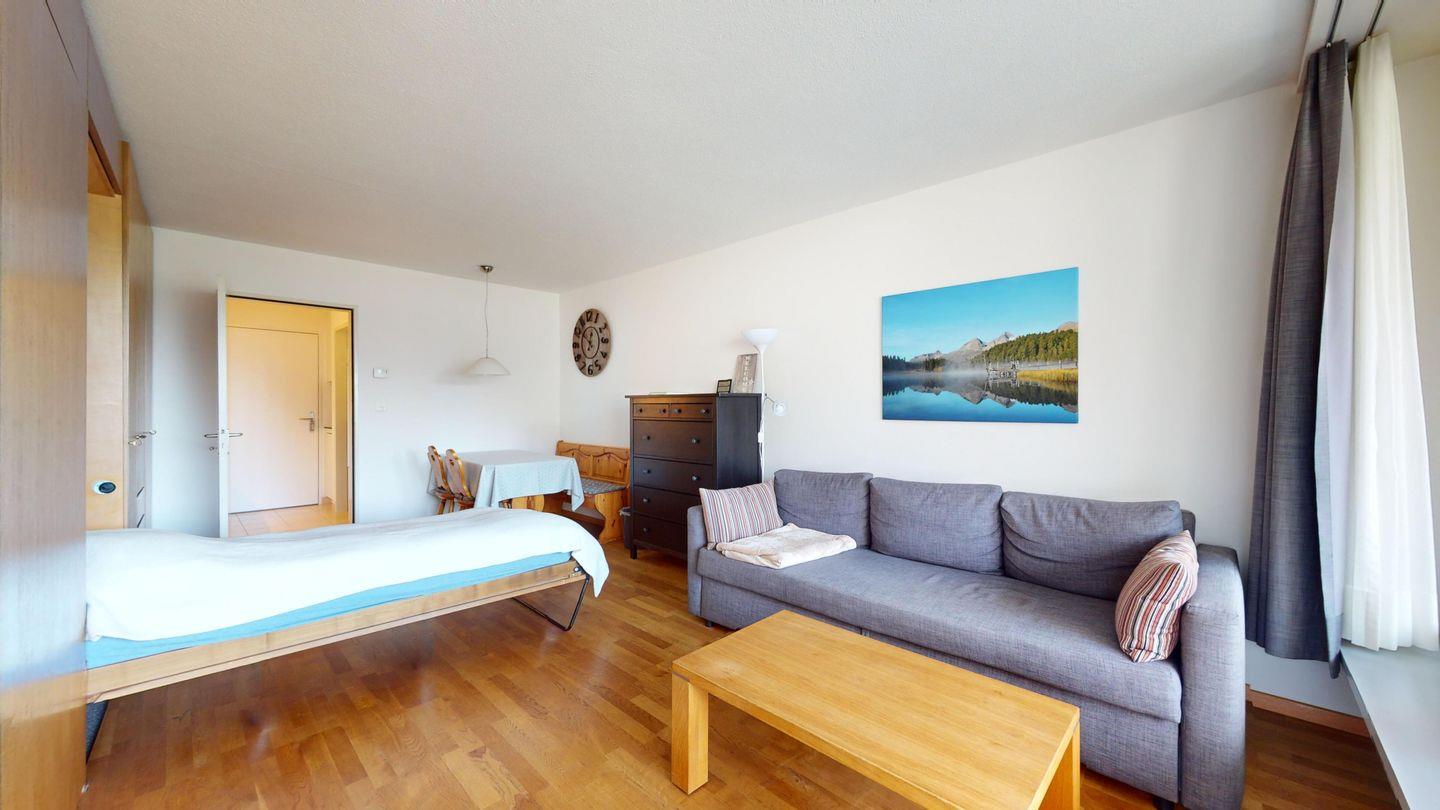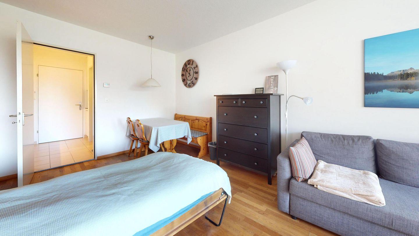 1-Zimmerwohnung im 3. Stock für 2 Personen. Eingang mit Garderobe. Wohnzimmer mit Wohn- und Essbereich mit Ausgang auf den Balkon. 2 Schrankbetten. Geschlossene Küche im Eingangsbereich mit 4-Platten Kochfeld, Geschirrspüler, Kaffeemaschine, Kühlschrank. Separates Badezimmer mit Dusche/WC/Lavabo. TV und Internet. Aussenparkplatz. Nichtraucherwohnung.