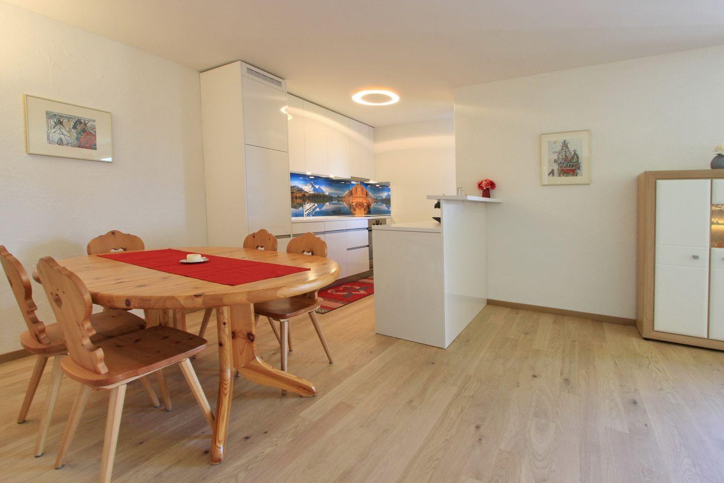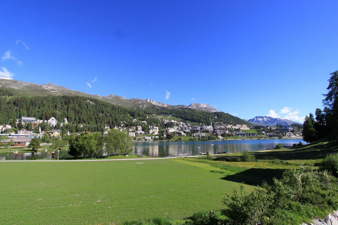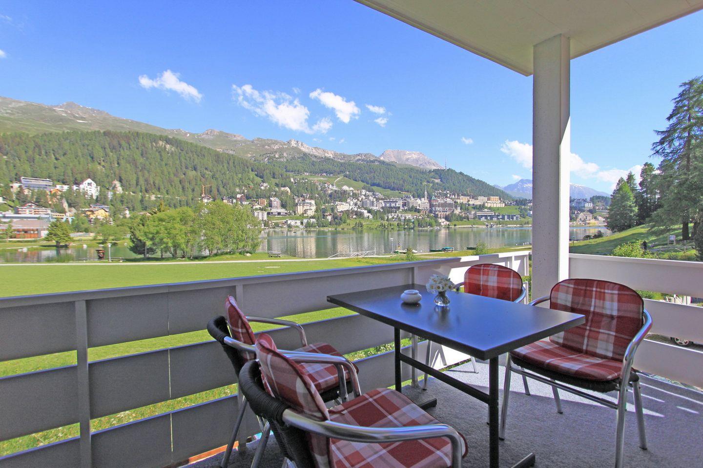 Moderne 3.5 Zimmer-Wohnung mit einem hohen Standard. Die Wohnung befindet sich im ersten Stock und bietet einen Balkon mit wunderschöner Aussicht auf den See, St. Moritz Dorf und die umliegende Bergwelt.