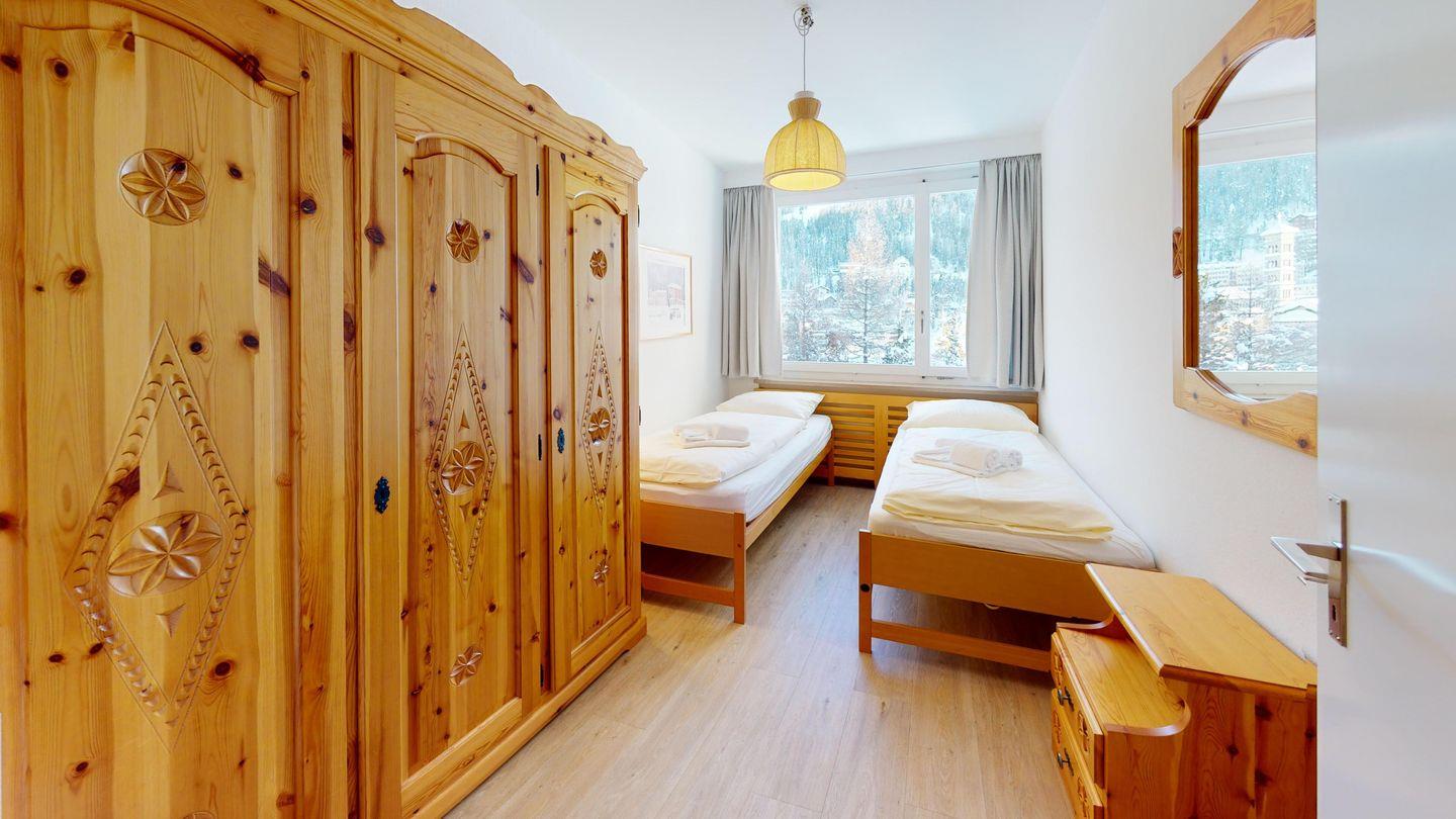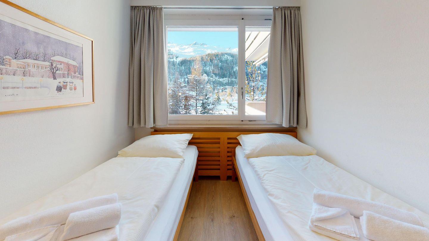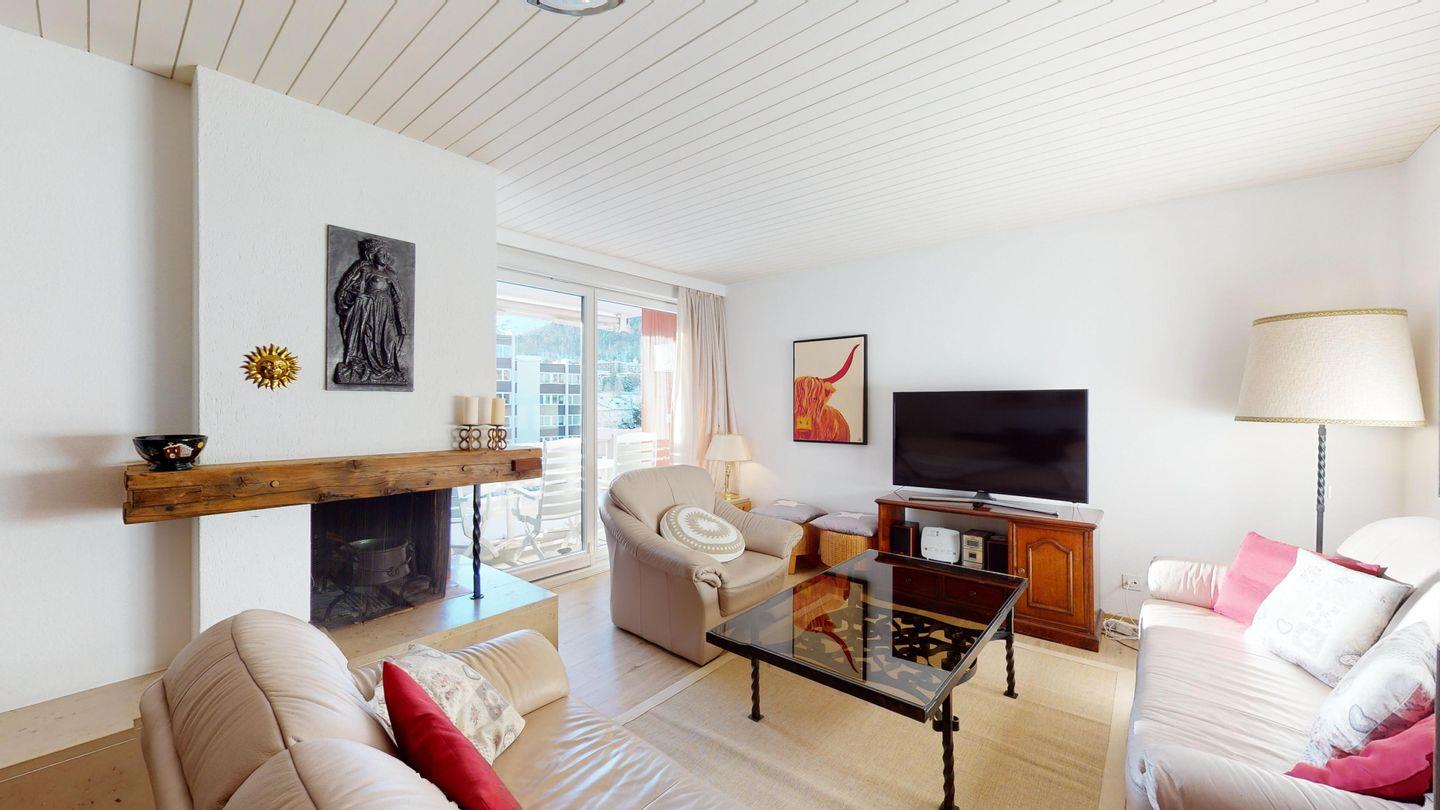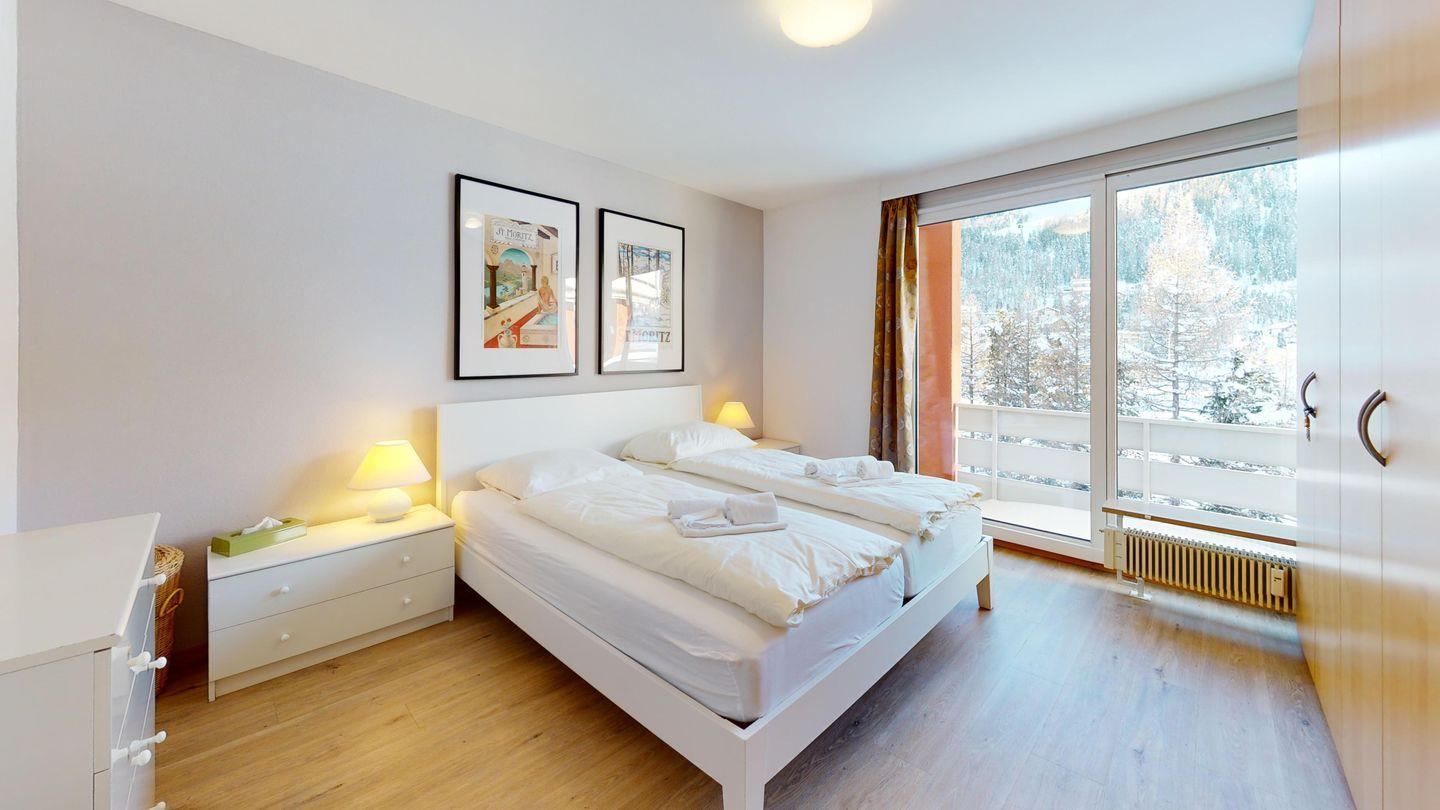 3.5-Zimmer-Wohnung mit Balkon und Blick auf den St. Moritzersee, St. Moritz Dorf und Corviglia. Wohnzimmer, separate Küche, zwei Schlafzimmer, Bad, separates WC. Vynilboden renoviert 2016, frisch gestrichen. Lift und Hallenbad im Haus.