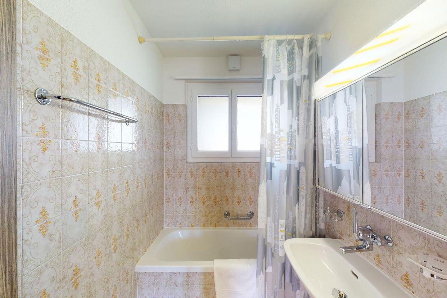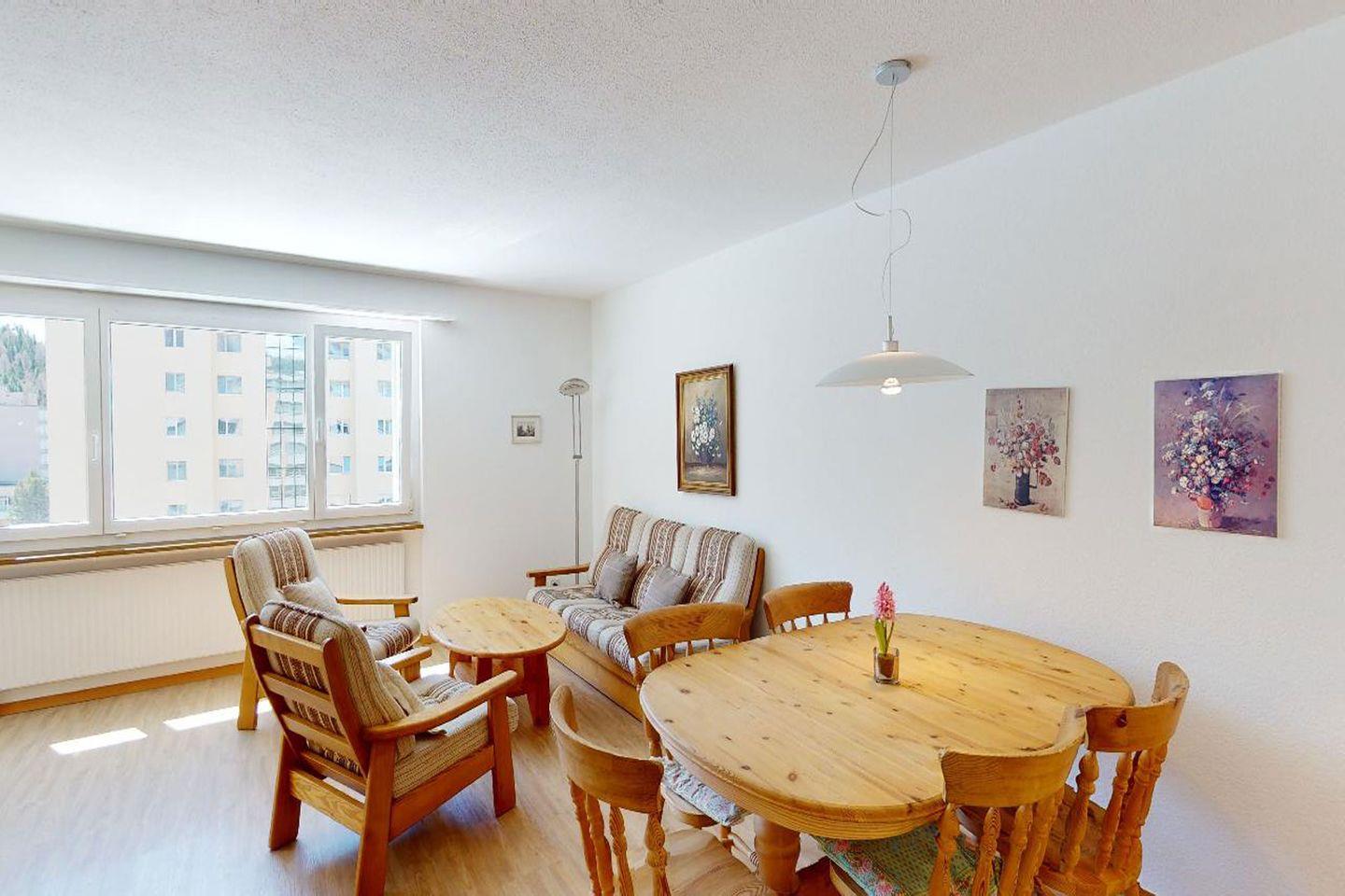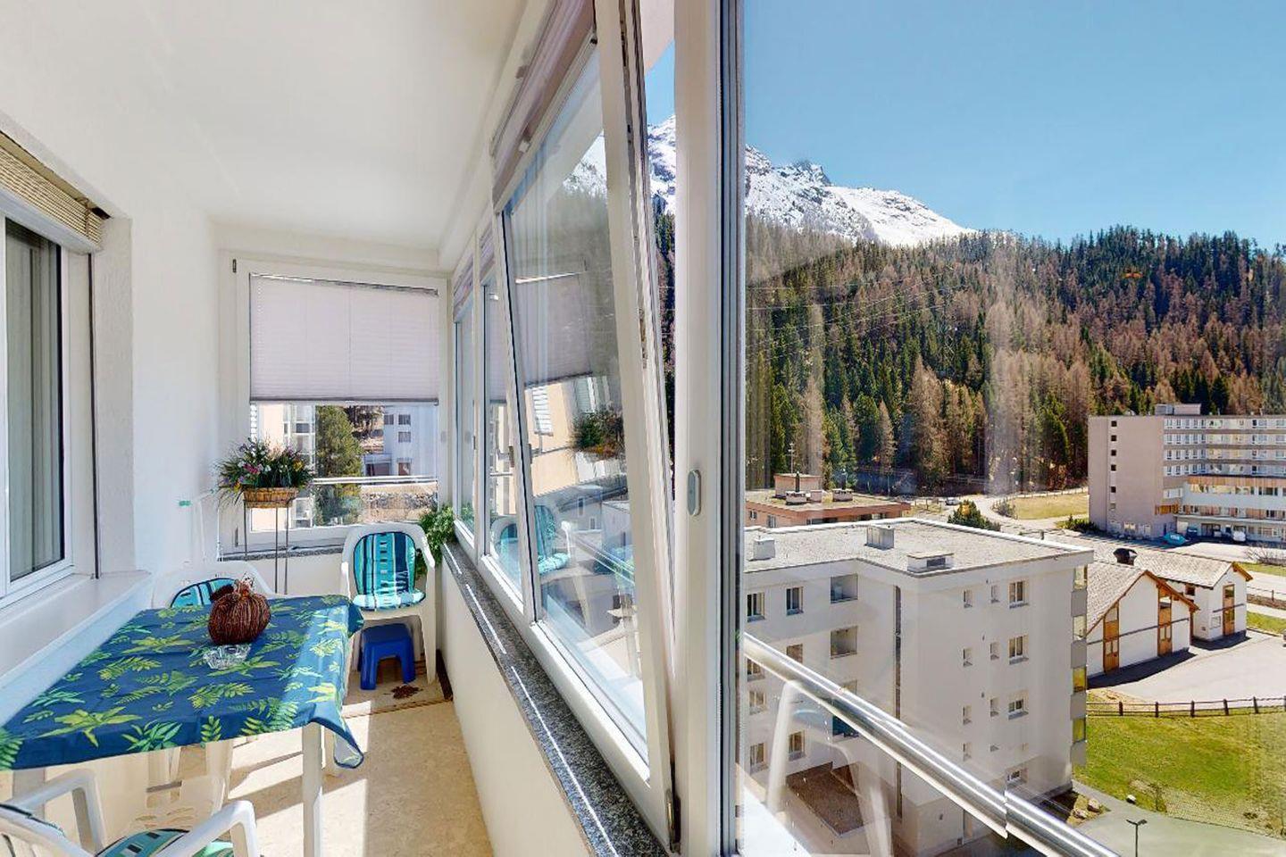 3.5-Zimmerwohnung im 7. Stock in St. Moritz-Bad mit renovierter Küche (2023). Zwei Schlafzimmer, großzügiges Wohnzimmer, Wintergarten, schöne Aussicht. Gemeinschaftswaschküche, Velo- und Skiraum, Garagenplatz optional.