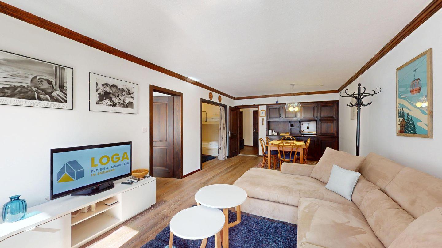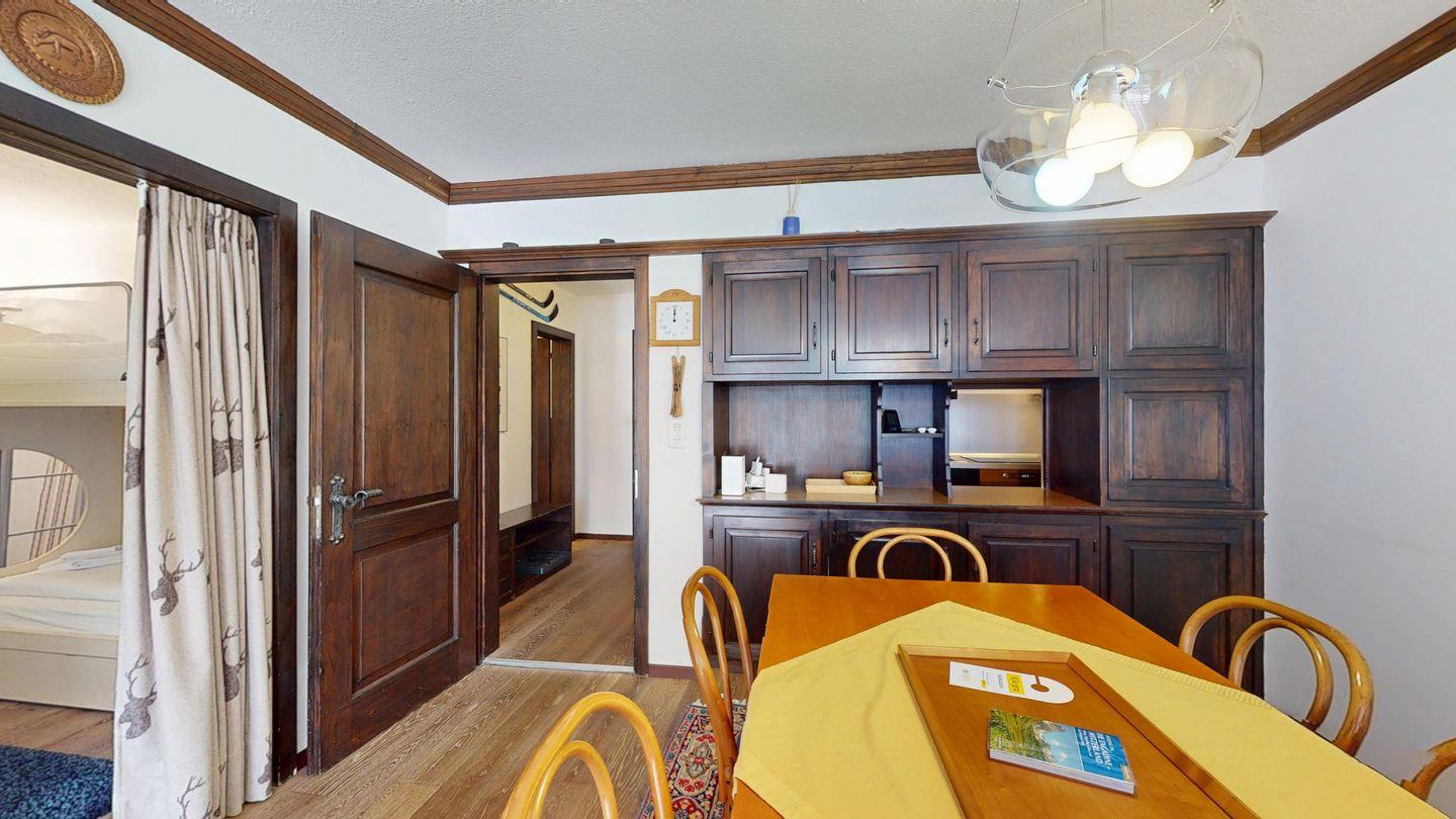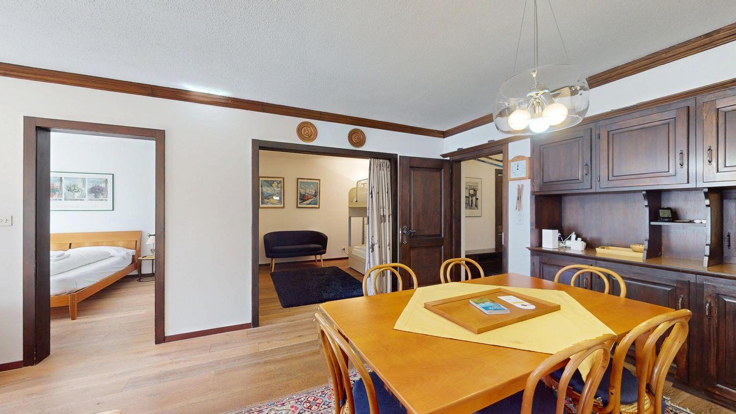 2 ½ Zimmerwohnung, ca. 68m2, im 1. Stock. Wohnzimmer mit TV, Essecke und Balkon. Geschlossene Küche mit Backofen, Kühlschrank mit Gefrierfach und Geschirrspüler. Doppelzimmer mit Zugang zum Balkon. Badezimmer mit Dusche, WC, Bidet und Lavabo. Ein Schlafzimmer mit Etagenbett, vom Wohnzimmer mit einem Vorhang abtrennbar. Parkplatz in der Garage (Höhe max. 210cm, nicht für breite Wagen geeignet). Nichtraucherwohnung. Haustiere sind nicht erlaubt.