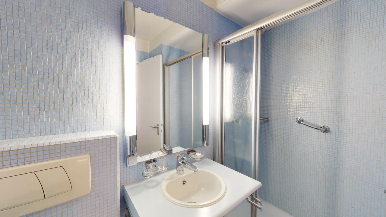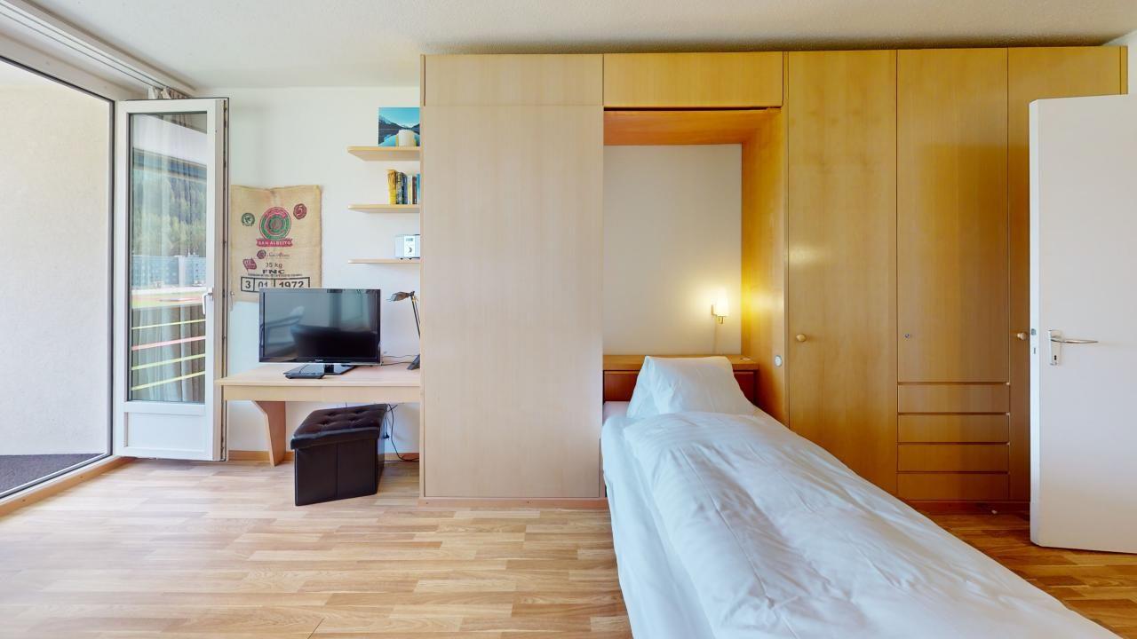 Zweckmässige, helle 1 - Zimmer-Ferienwohnung im 3. Obergeschoss. Wohn- /Esszimmer mit 2 integrierten Schrankbetten 80 x 200. Überdachter Balkon mit Aussicht. Kleine Küche. Ein Lift im Ferienhaus erleichtert den Zugang, und Sie profitieren von einem Parkplatz in einer Garagenbox. Für aktive Gäste steht ein Fitnessraum zur öffentlichen Nutzung im Ferienhaus zur Verfügung.