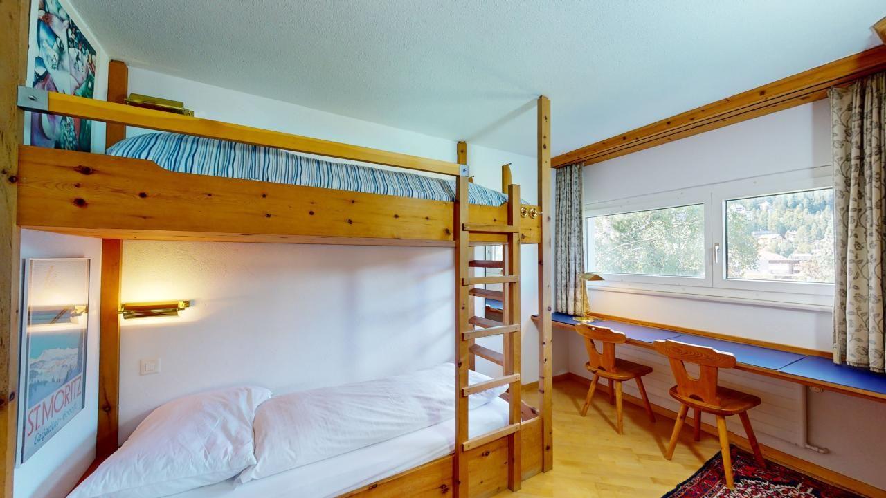 Reizvolle, gemütlich und authentische 4.5-Zimmer-Ferienwohnung im 1. Obergeschoss. Eingang mit Küche und Blick auf St. Moritz Dorf. Separate Toilette. Wohn- /Esszimmer mit überdachtem Balkon. Ein schönes Doppelschlafzimmer. Ein renoviertes Bad mit Dusche/WC/Badewanne. Ein Schlafzimmer mit Etagenbett für zwei Personen mit eigenem Lavabo. Ein weiteres Schlafzimmer mit zwei Etagenbetten. Im Ferienhaus befindet sich ein Lift. Beschränkte Anzahl Aussenparkplätze (max. 1 Auto/Wohnung, nicht reserviert). Fitnessraum zur öffentlichen Nutzung befindet sich im Ferien-Wohnhaus.