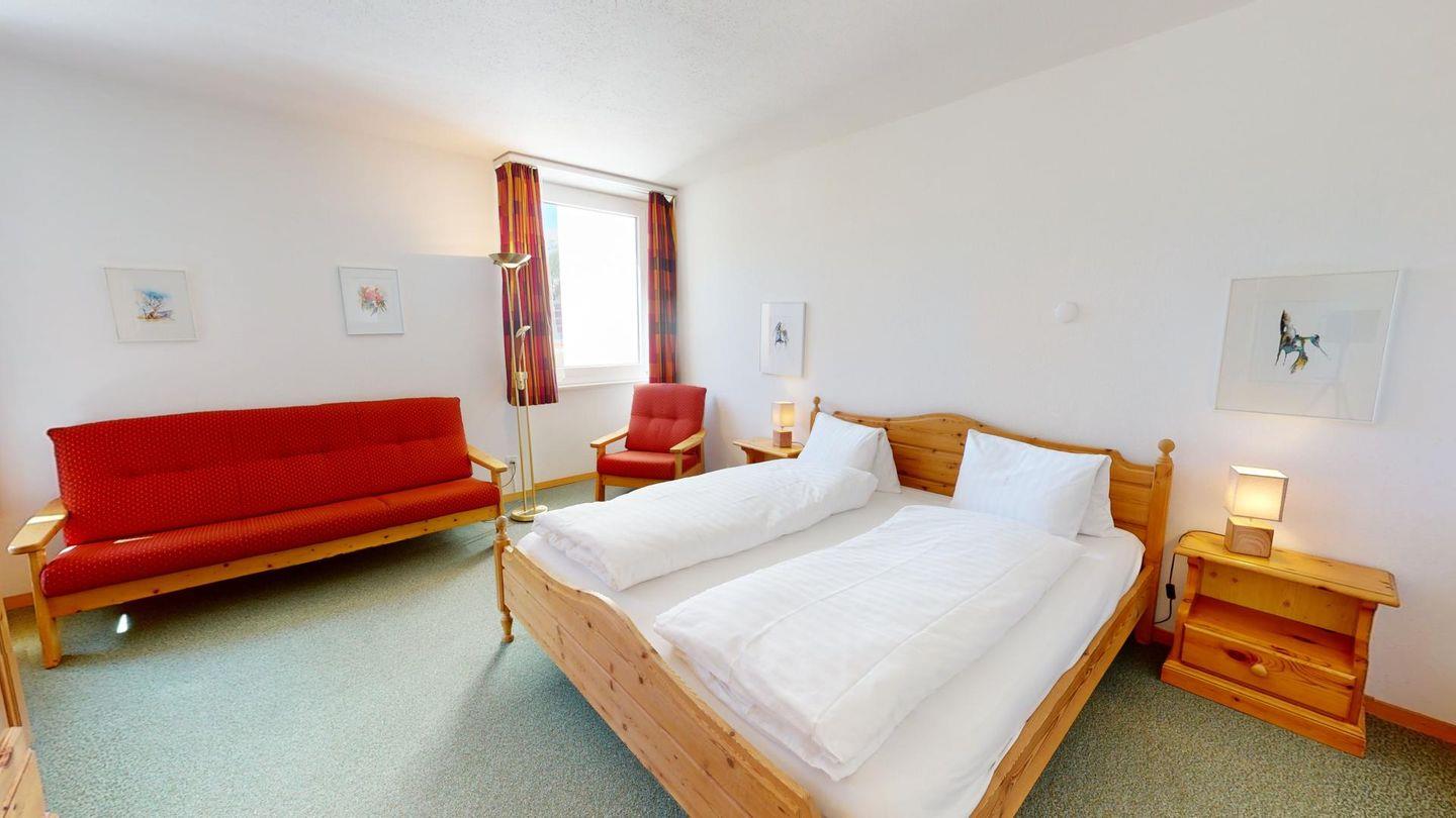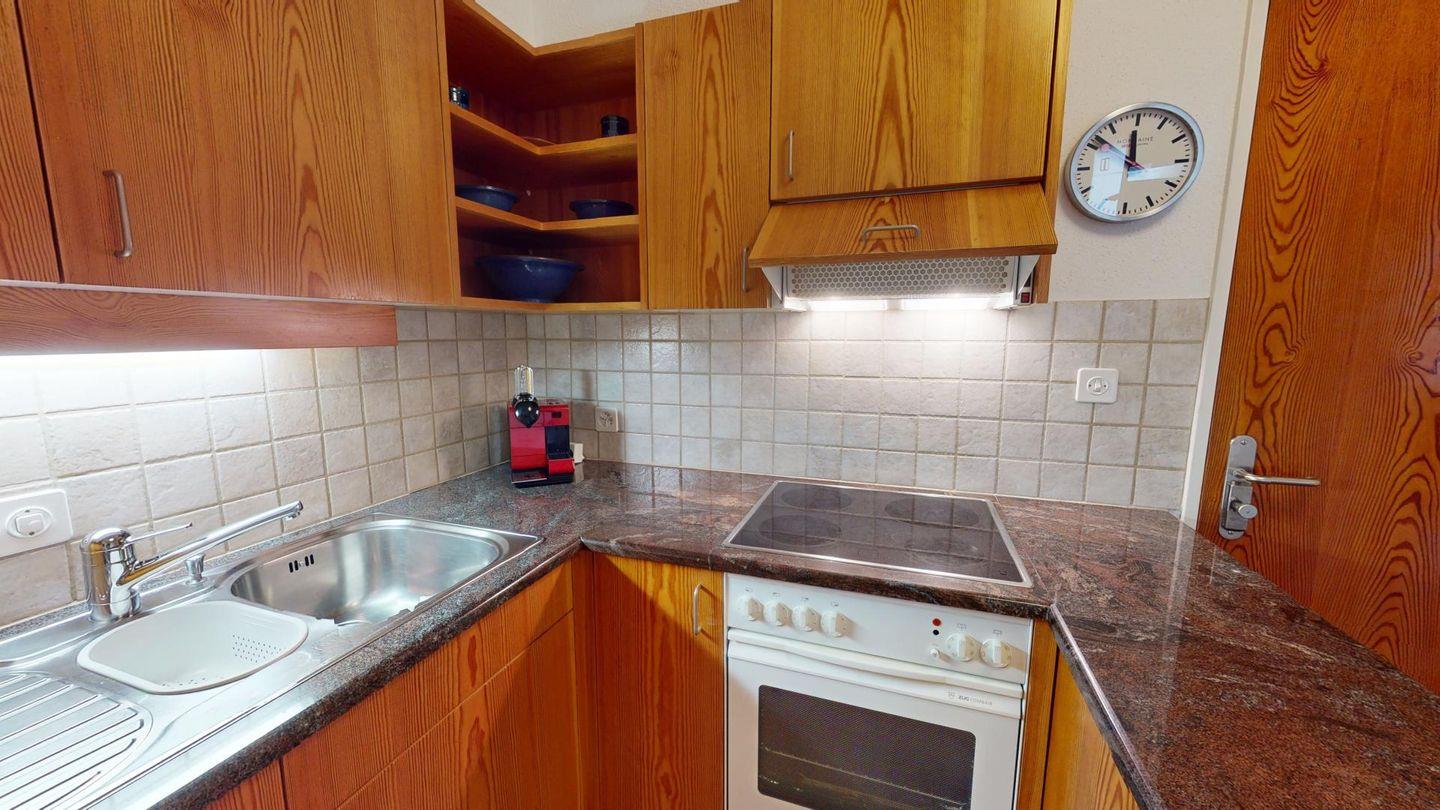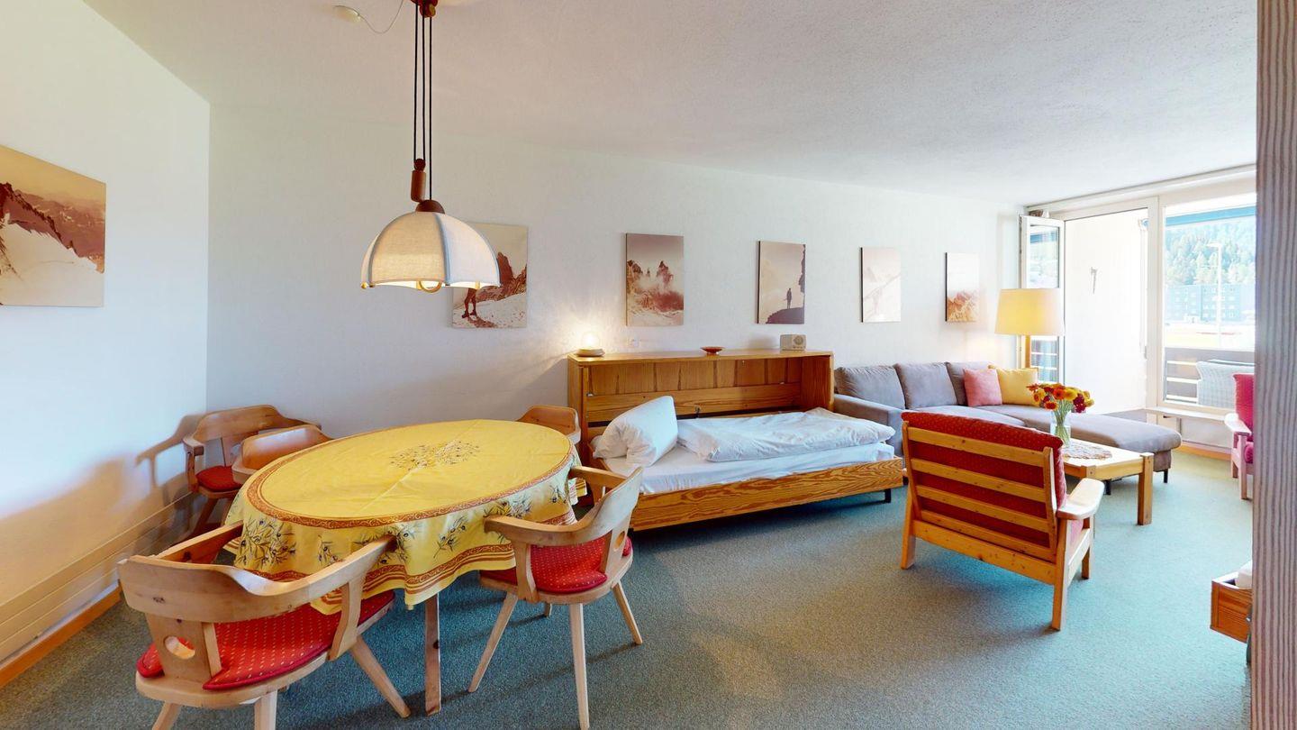 Entdecken Sie diese einladende 2.5 - Zimmerwohnung im 1. Stock, die ideal für Ihre nächsten Ferien ist. Der Eingangsbereich mit Garderobe führt Sie direkt in die gut ausgestattete Küche. Gedeckter Balkon. Das modern renovierte Badezimmer ist mit einer Dusche und WC ausgestattet und bietet Ihnen den nötigen Komfort. 1 grosszügiges Doppelschlafzimmer. Beschränkte Anzahl Aussenparkplätze (max. 1 Auto/Wohnung, nicht reserviert). Fitnessraum zur öffentlichen Nutzung befindet sich im Ferien-Wohnhaus.