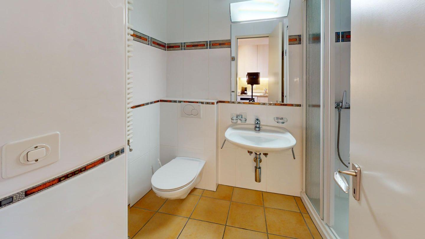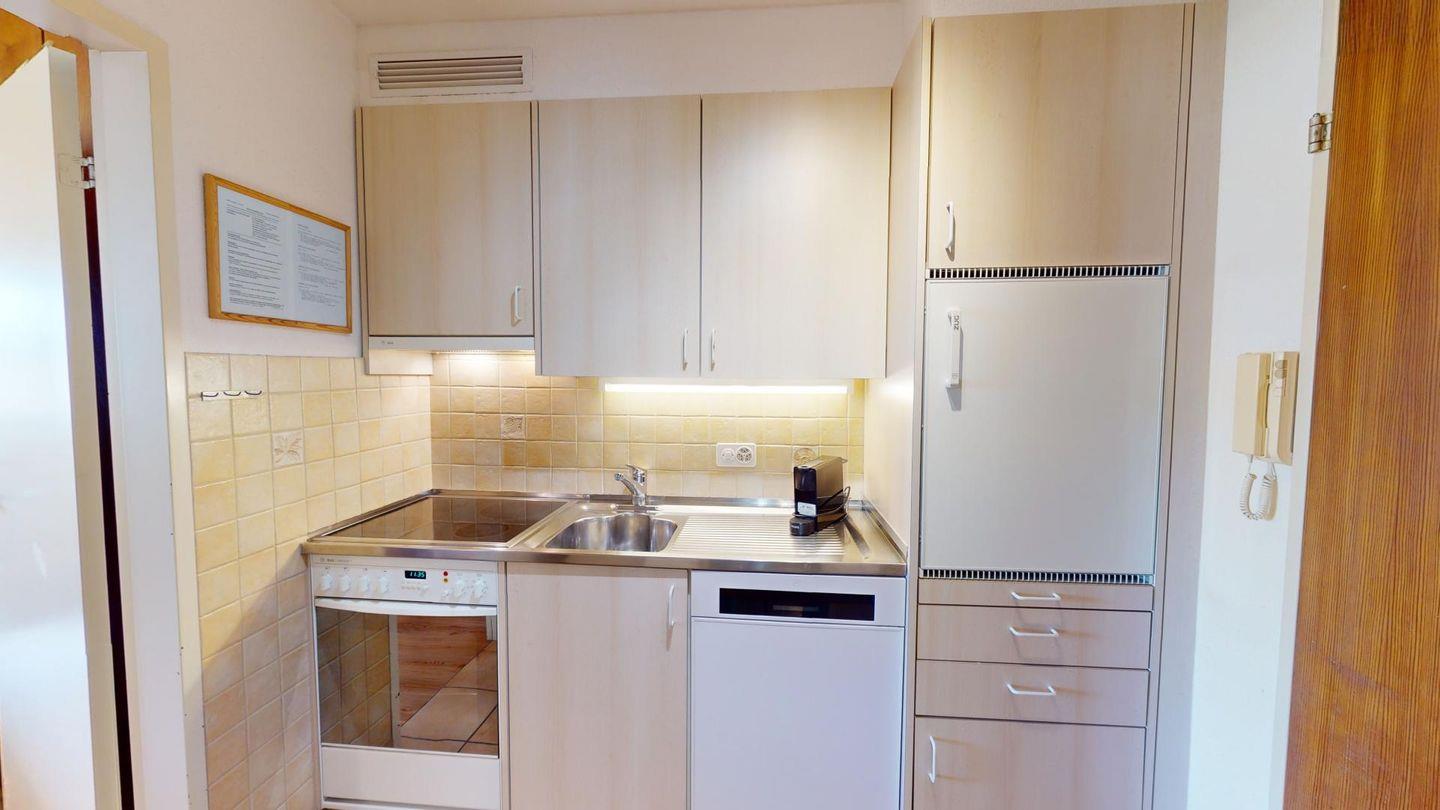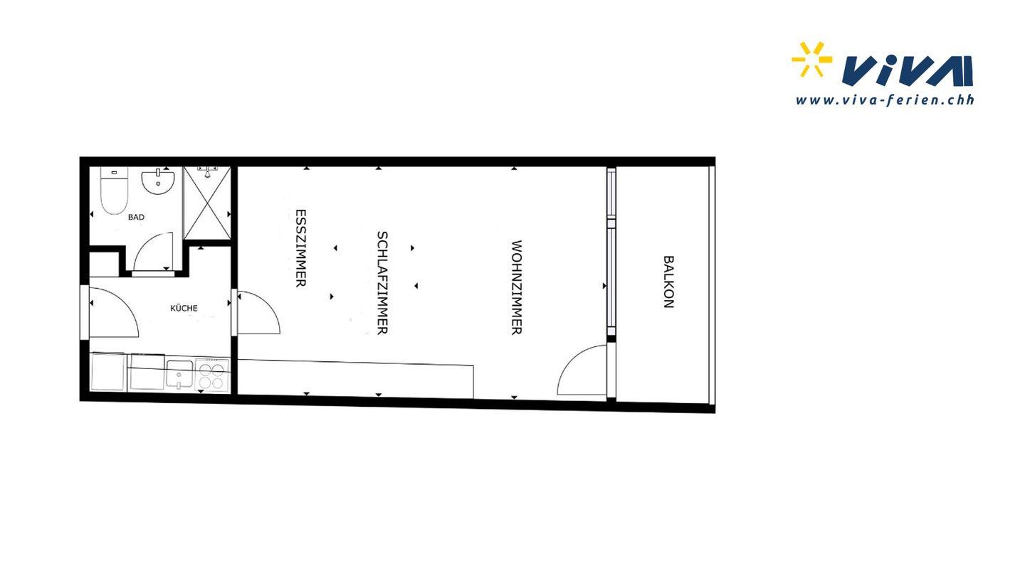 Praktisch eingerichtete 1-Zimmer-Ferienwohnung im 2. Obergeschoss. Wohn- /Esszimmer mit 2 integrierten Schrankbetten. Überdachter Balkon mit Aussicht. Kleine Küche. Bad mit Dusche. Ein Lift im Ferienhaus erleichtert den Zugang. Beschränkte Anzahl Aussenparkplätze (max. 1 Auto/Wohnung, nicht reserviert). Fitnessraum zur öffentlichen Nutzung befindet sich im Ferien-Wohnhaus.