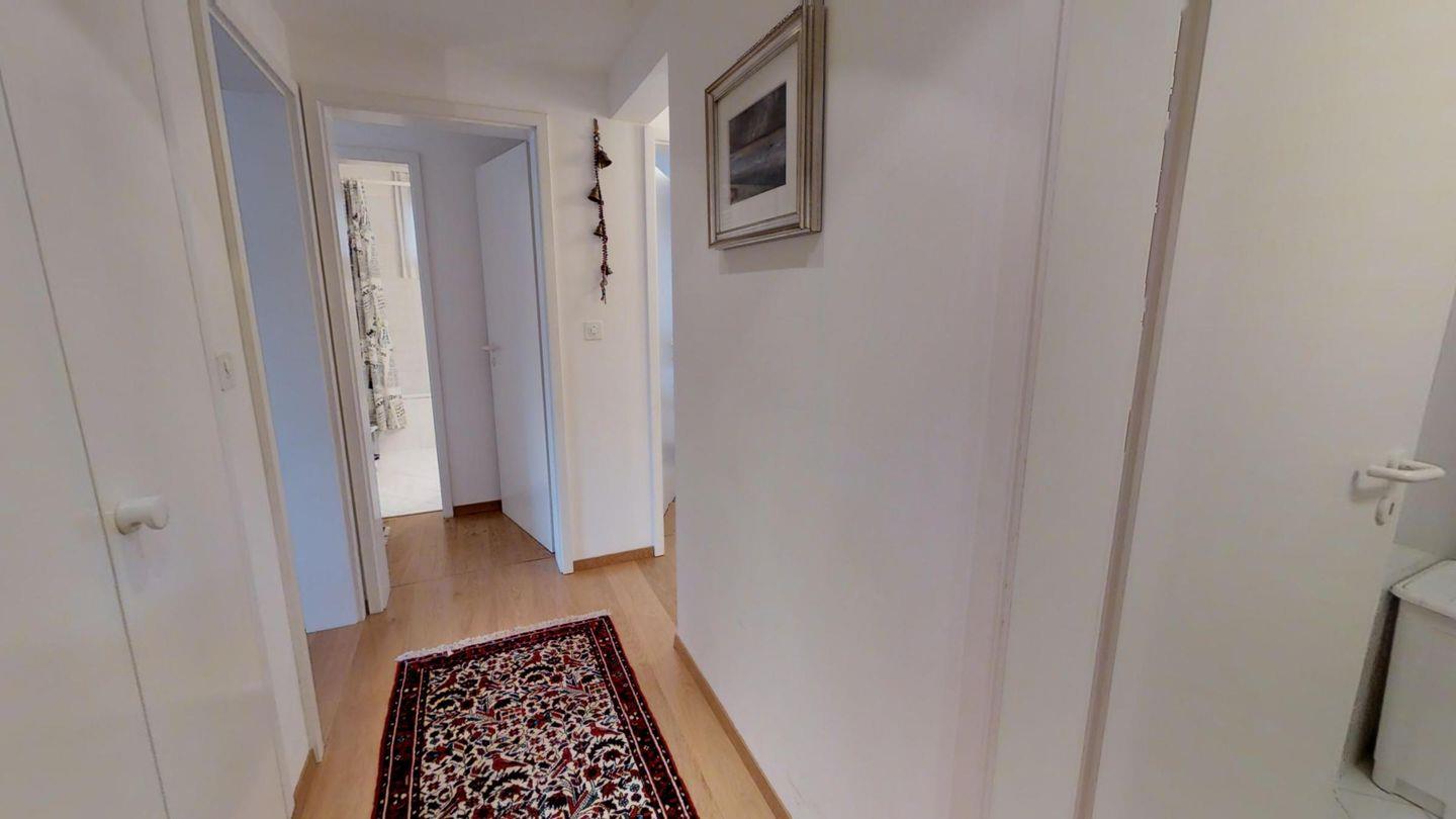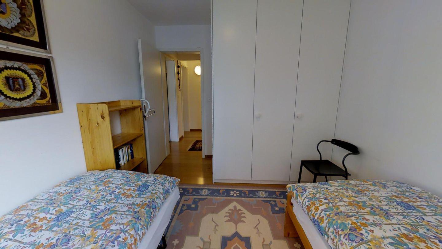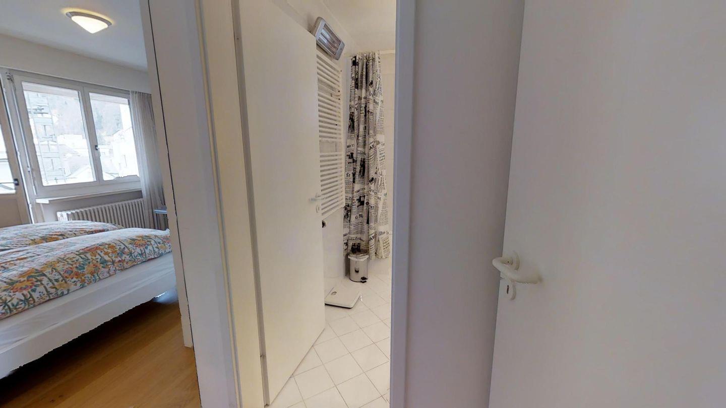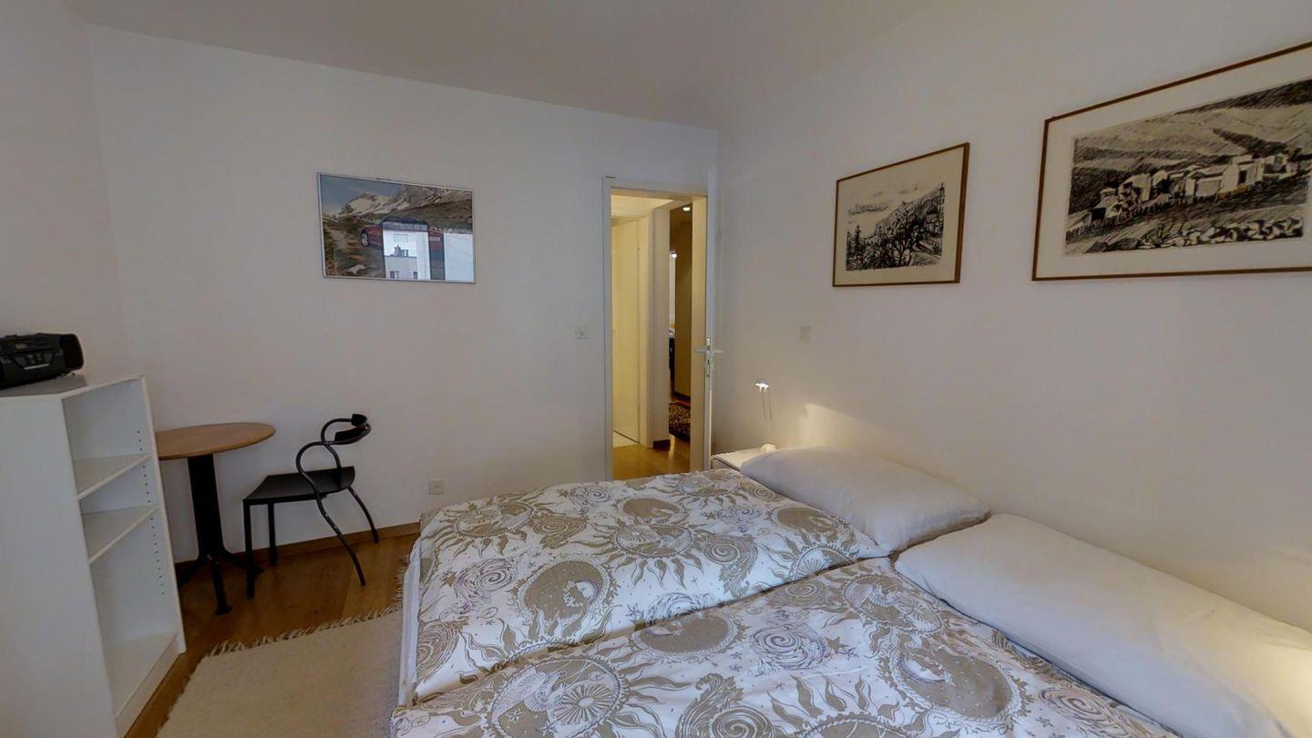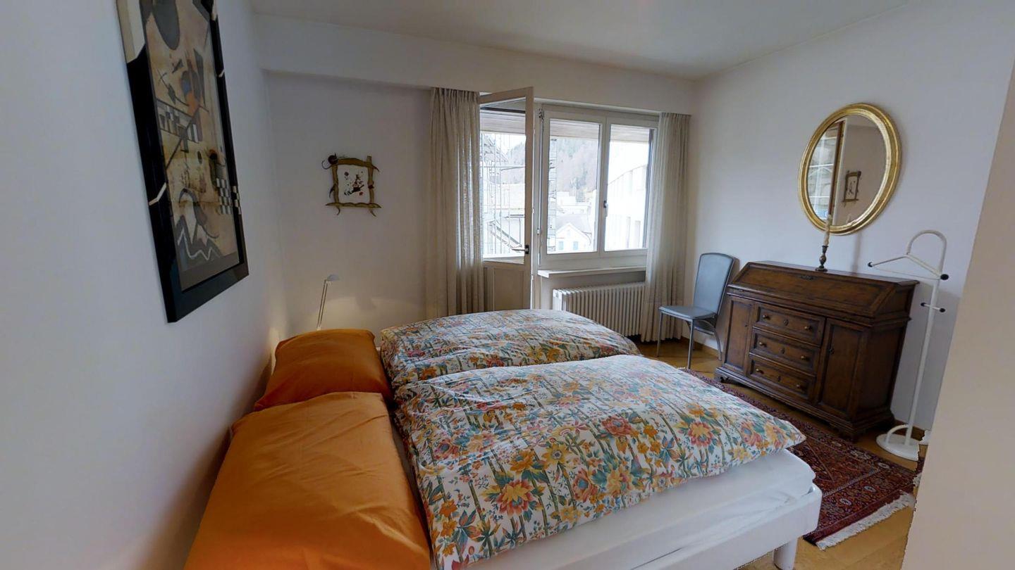 4-½-Zimmerwohnung im 3. Stock, ca. 105 m2. Grosszügiges Wohnzimmer, TV/DVD/Video/Tel./Internet, offene Küche mit Backofen, Nespresso Kaffeemaschine, Geschirrspüler, Kühlschrank mit gr. Tiefkühlfach, Essecken, Gäste-WC /Lavabo, 1 Doppelzimmer + Rundbalkon, Dusche/Bidet/Lavabo/WC, 1 2-Bettzimmer, 1 Doppelzimmer mit Rundbalkon, Bad/WC/Lavabo. Waschküche und Skiraum zur Mitbenützung. Garagenplatz im öffentlichen Parkhaus, ganz in der Nähe. Haustiere sind nicht erlaubt.