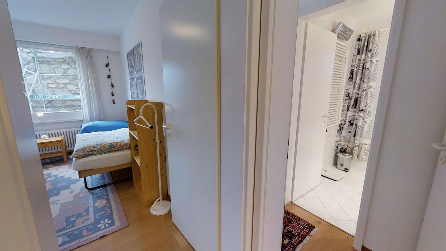 4-½-Zimmerwohnung im 3. Stock, ca. 105 m2. Grosszügiges Wohnzimmer, TV/DVD/Video/Tel./Internet, offene Küche mit Backofen, Nespresso Kaffeemaschine, Geschirrspüler, Kühlschrank mit gr. Tiefkühlfach, Essecken, Gäste-WC /Lavabo, 1 Doppelzimmer + Rundbalkon, Dusche/Bidet/Lavabo/WC, 1 2-Bettzimmer, 1 Doppelzimmer mit Rundbalkon, Bad/WC/Lavabo. Waschküche und Skiraum zur Mitbenützung. Garagenplatz im öffentlichen Parkhaus, ganz in der Nähe. Elektronische Schiebetüren beim Hauseingang. Haustiere sind nicht erlaubt.