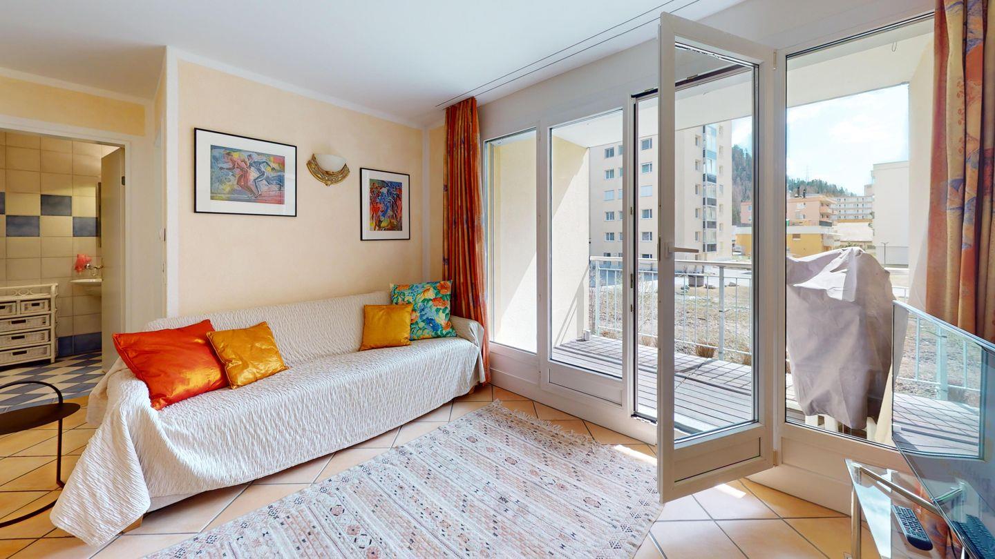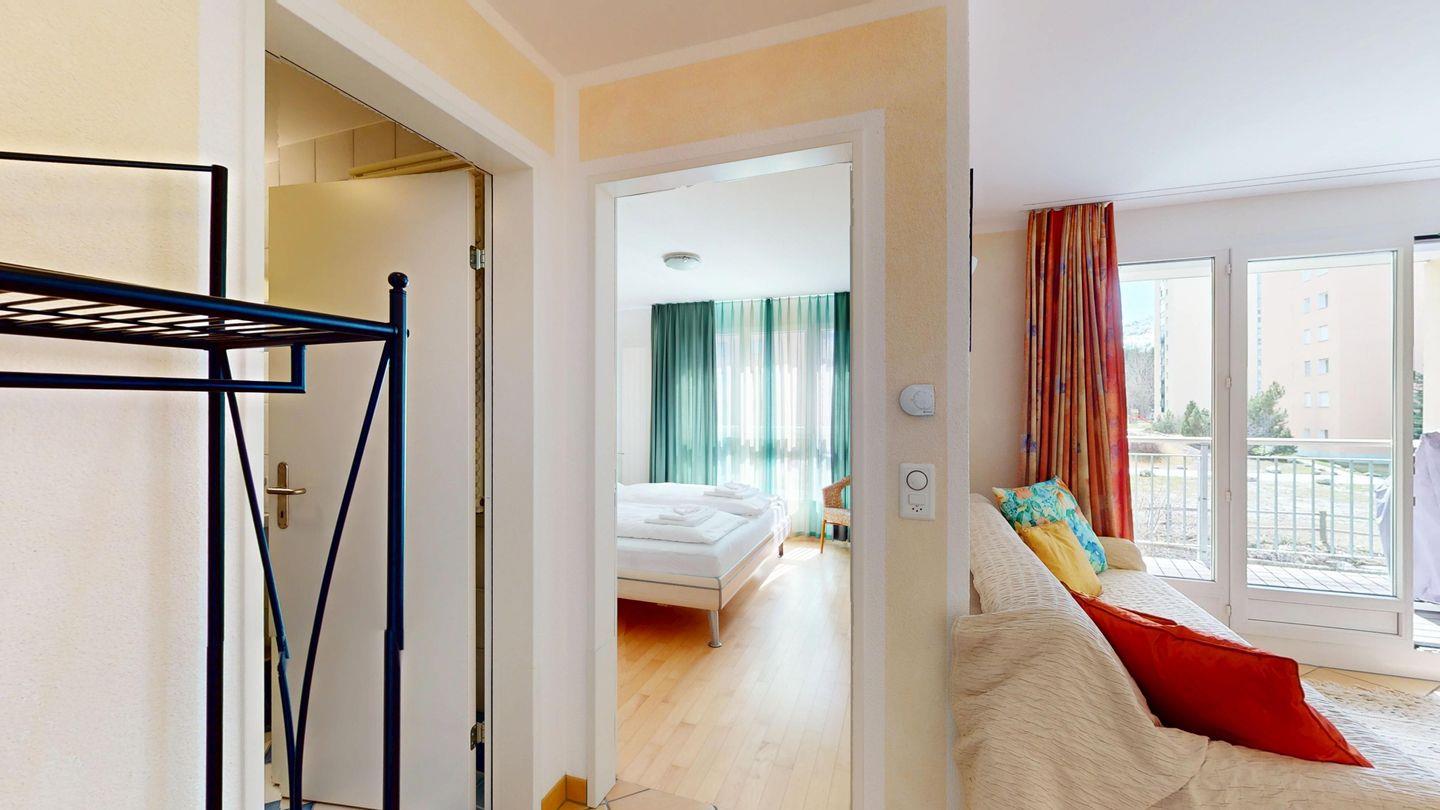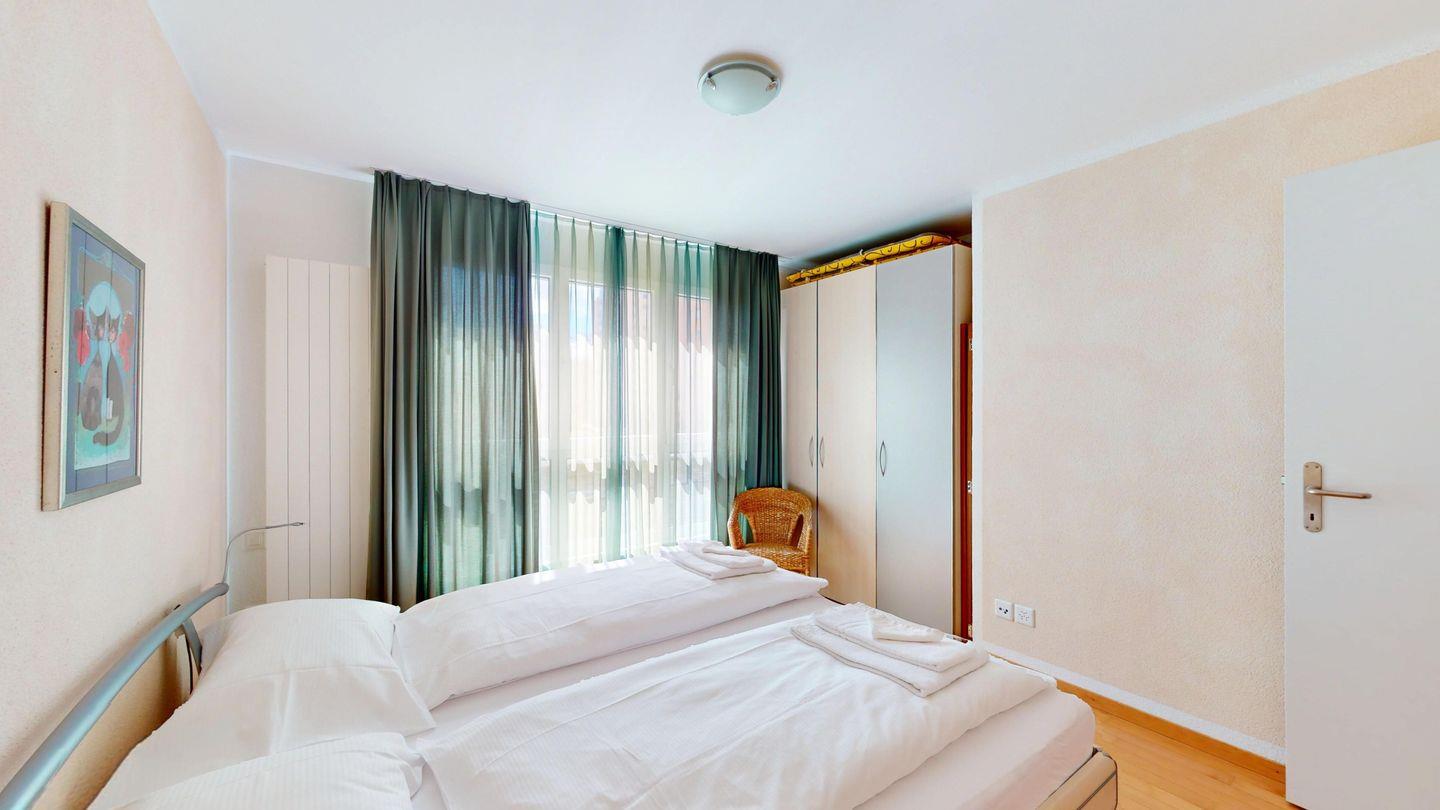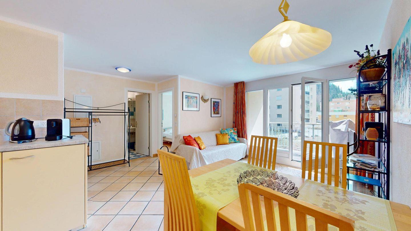 2½ -Zimmerwohnung auf der ersten Etage, mit Lift. Entree mit Garderobe. Wohn-/ Esszimmer mit Ausgang zum Balkon. Radio/TV und Internet. Offene Küche mit Herd, Backofen, Kühlschrank mit kleinem Gefrierfach, Kaffeemaschine. Doppelschlafzimmer mit grossen Fenstern. Badezimmer mit Dusche/WC/Lavabo. Ein Parkplatz in der Garage. Waschküche zur gemeinschaftlichen Benutzung. Ski- und Veloraum. Nichtraucherwohnung. Haustiere sind nicht erlaubt.