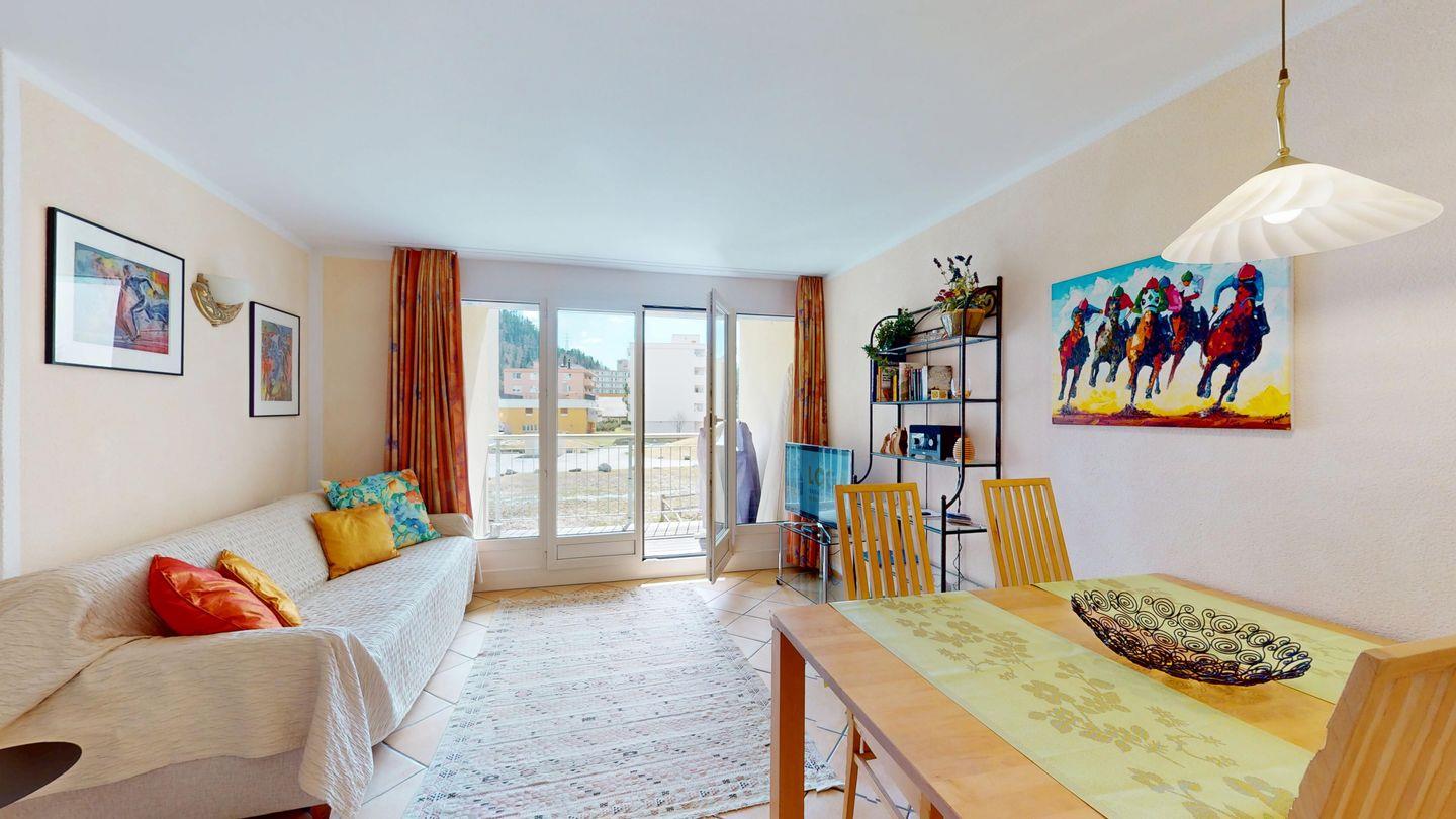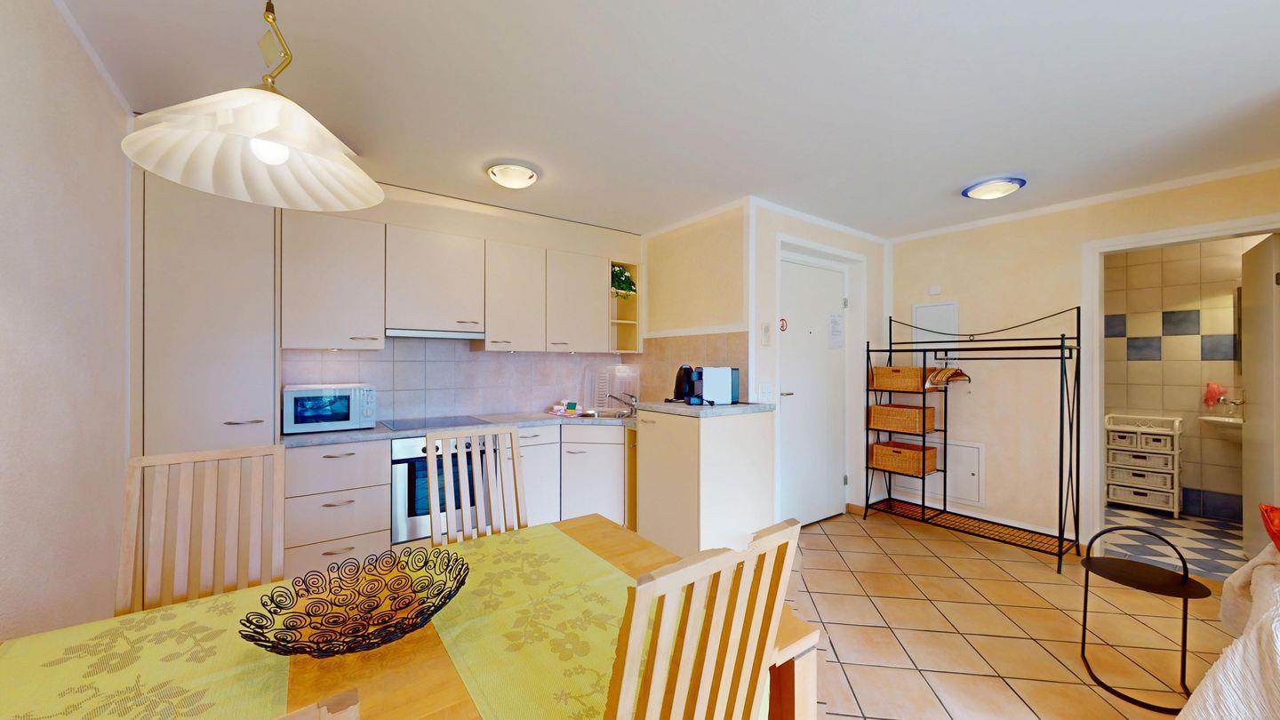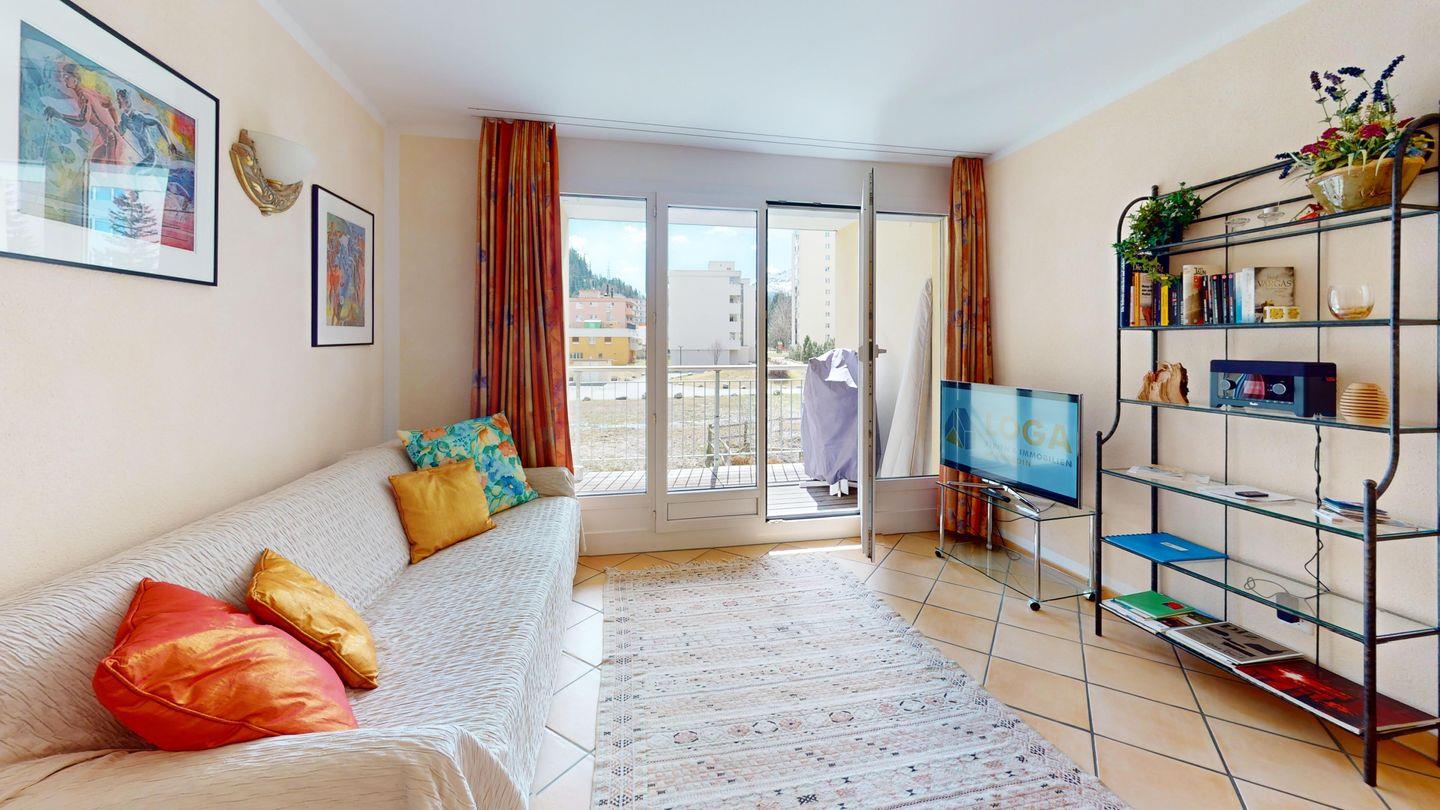 2½ -Zimmerwohnung auf der ersten Etage, mit Lift. Entree mit Garderobe. Wohn-/ Esszimmer mit Ausgang zum Balkon. Radio/TV und Internet. Offene Küche mit Herd, Backofen, Kühlschrank mit kleinem Gefrierfach, Kaffeemaschine. Doppelschlafzimmer mit grossen Fenstern. Badezimmer mit Dusche/WC/Lavabo. Ein Parkplatz in der Garage. Waschküche zur gemeinschaftlichen Benutzung. Ski- und Veloraum. Nichtraucherwohnung. Haustiere sind nicht erlaubt.