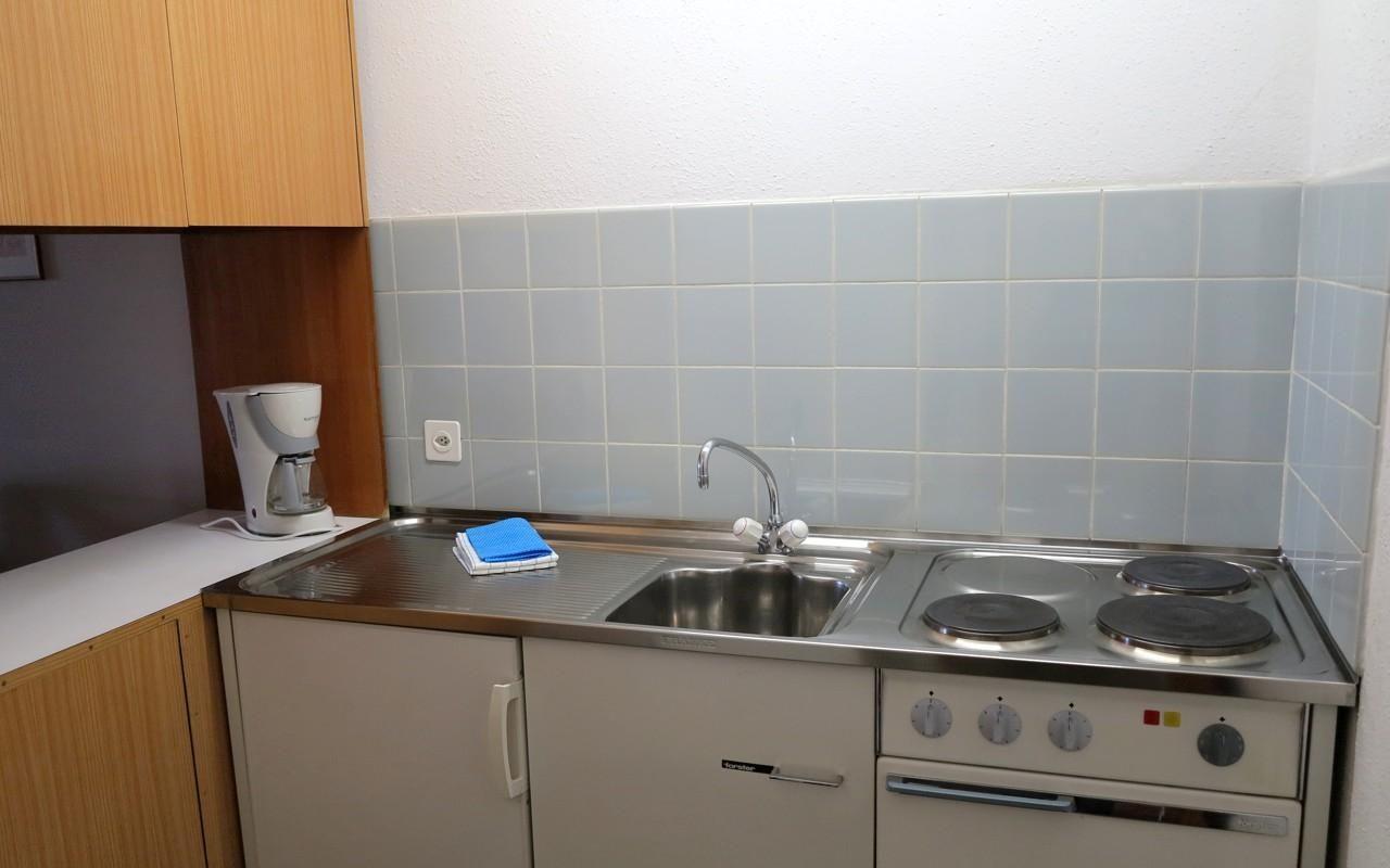 Nette Ferienwohnung im 1. Stock. Zirka 40m2. Wohn-/ Esszimmer mit Schrankbetten, kleine separate Küche ohne Geschirrspüler, Balkon nach Osten. Bad/Dusche, WC. Lift.