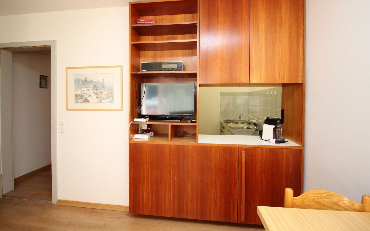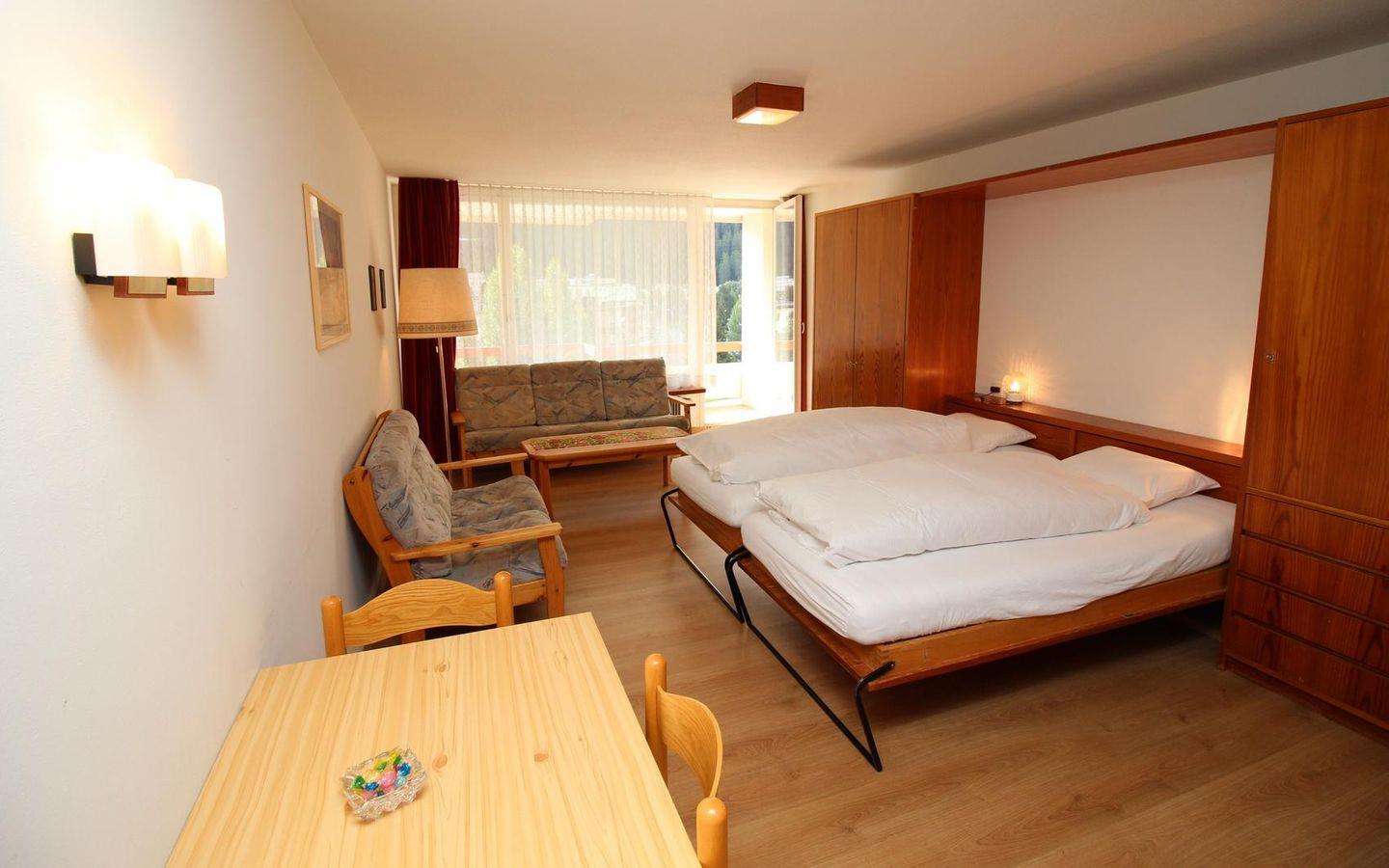 Sympathische Ferienwohnung im 5. Stock. Zirka 40 m2. Wohn- /Esszimmer mit Schrankbetten, Kleine Küche ohne GS, Balkon Süd. Bad/Dusche, WC. Lift.