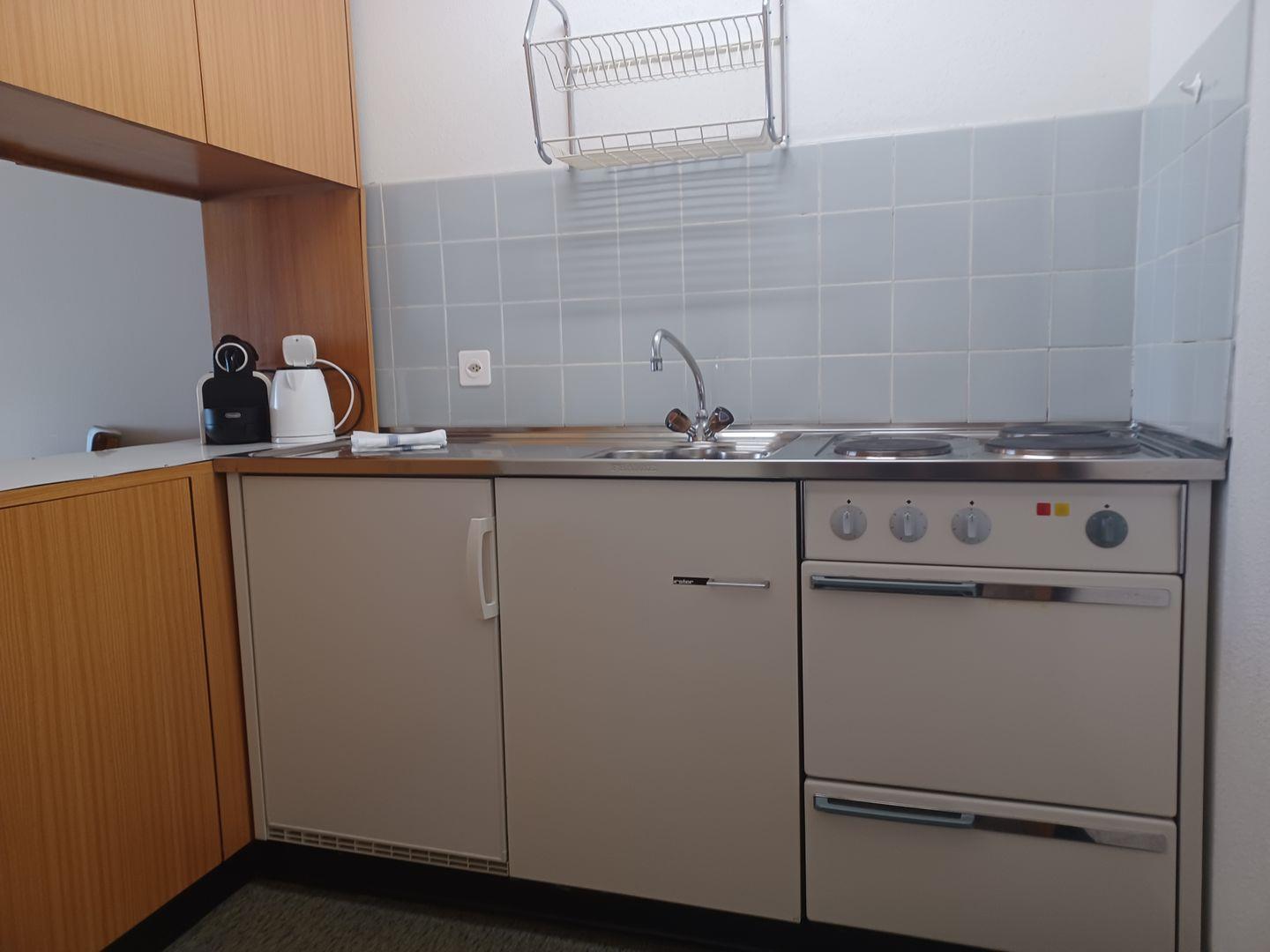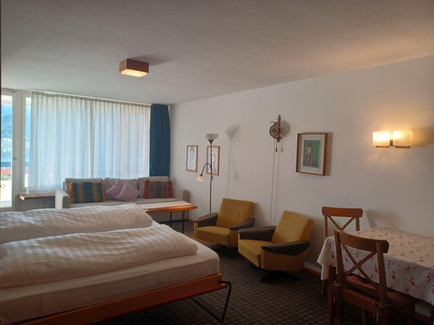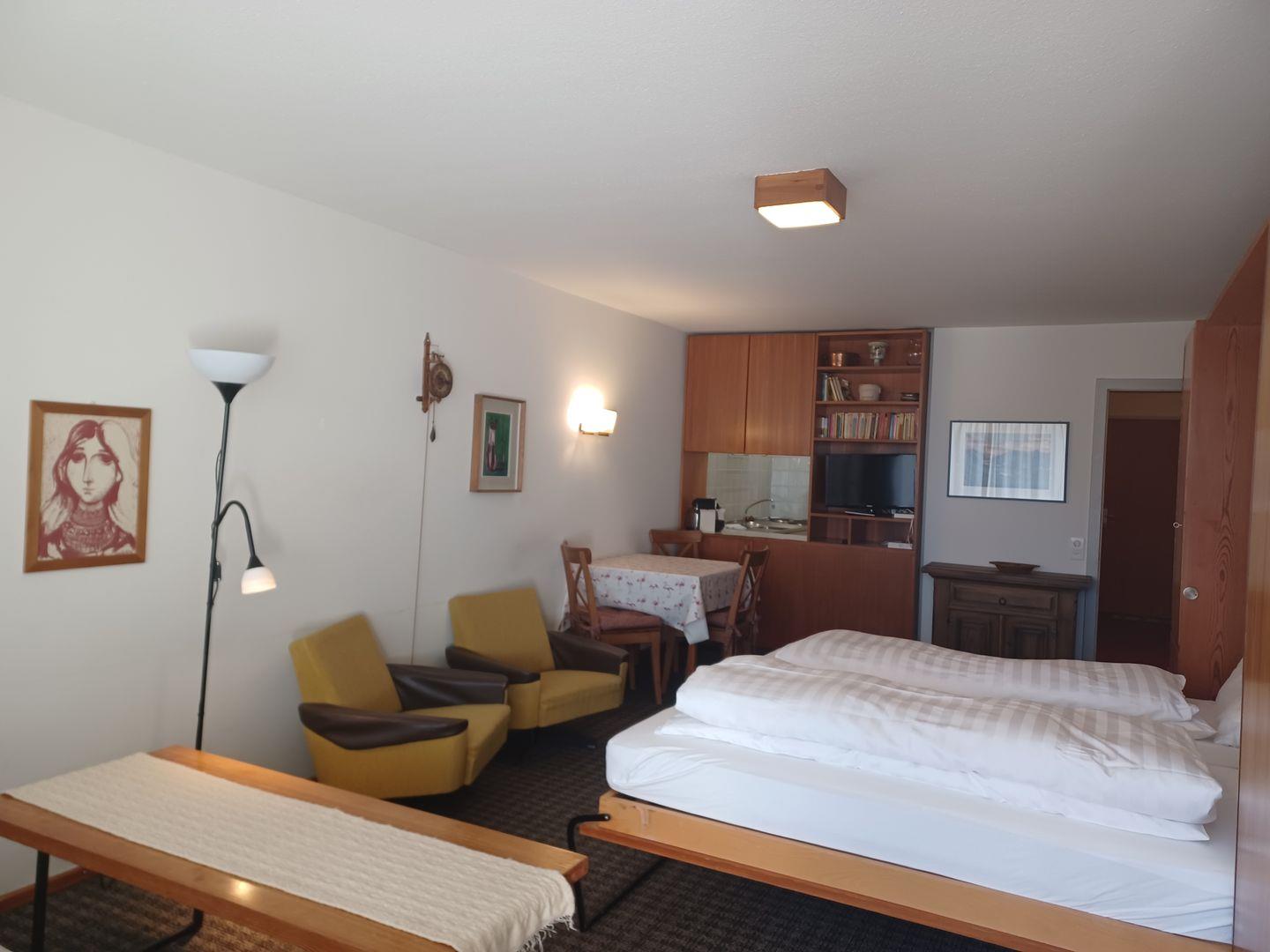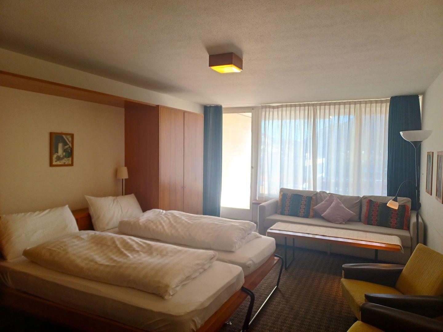 Zweckmässige Ferienwohnung im 6. Stock. Zirka 40 m2. Wohn- /Esszimmer mit Schrankbetten, kleine Küche ohne GS, Balkon mit Aussicht. Bad/Dusche, WC. Lift.