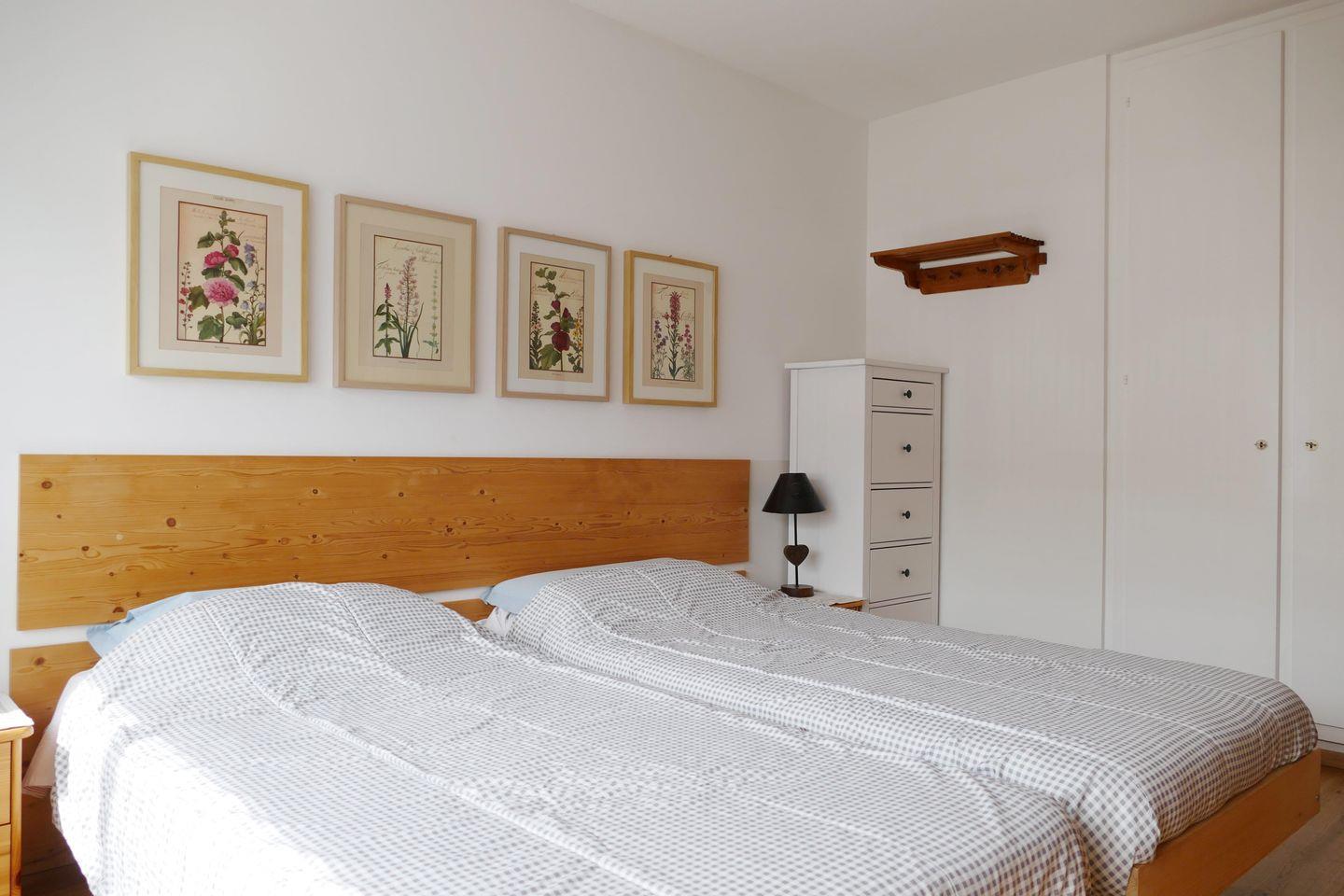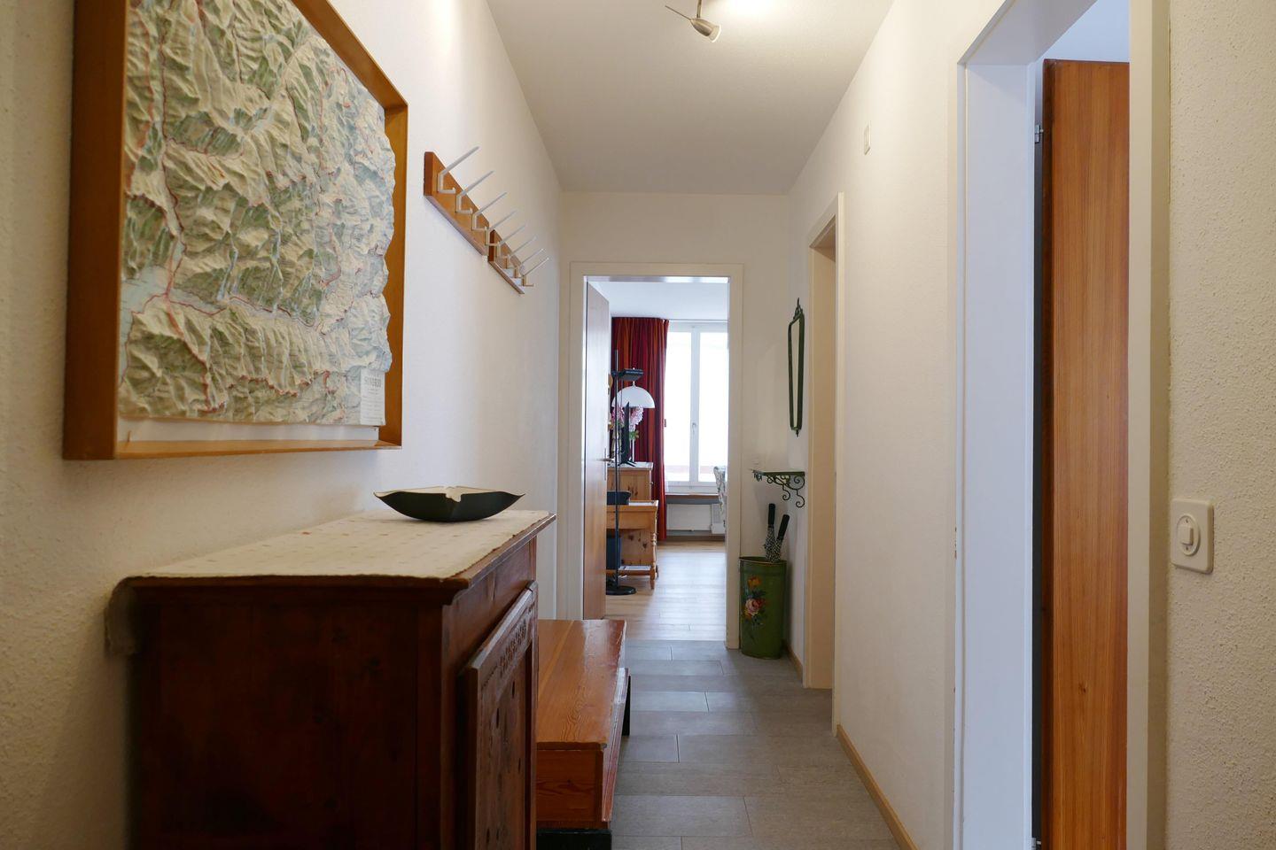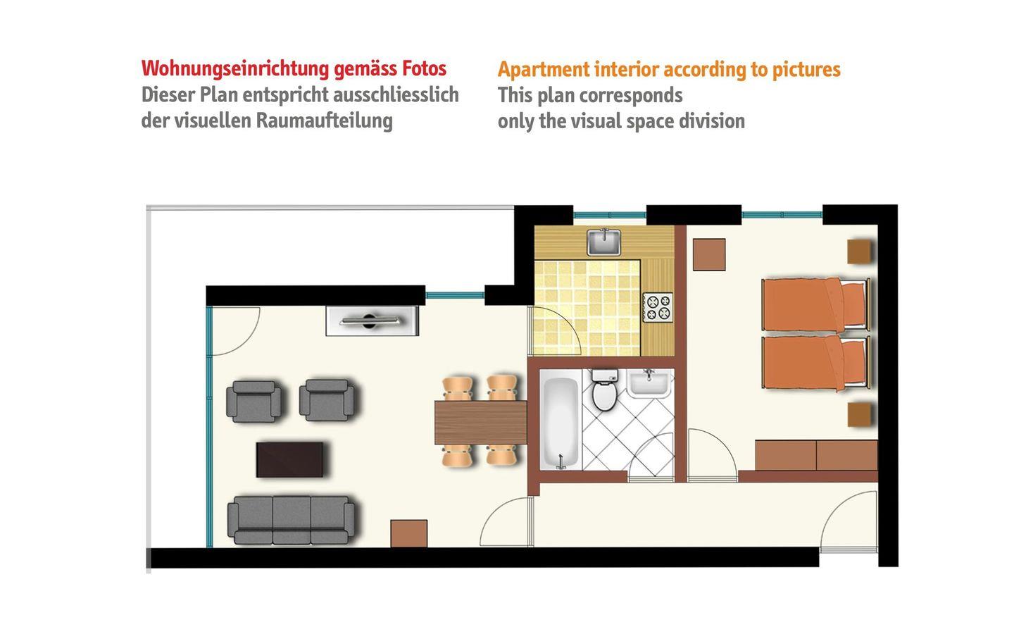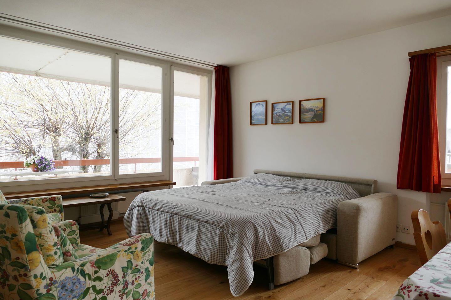 Zweckmässige 2-Zimmer Ferienwohnung im 1. Stock. Ca. 54 m2. Wohn-/ Esszimmer mit Sofabett. Doppelschlafzimmer. Balkon Süd. Separate Küche mit Geschirrspüler, Bad/Dusche, WC. Lift.