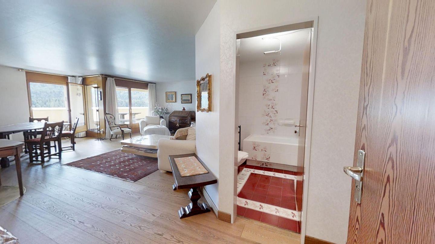 Die Wohnung befindet sich in der Überbauung Galleria Caspar Badrutt, in der verschiedene Einkaufsläden sowie ein Pub zu finden sind. Sie liegt zentral in St. Moritz-Dorf. Die Chantarella Bahn ist in 5 Minuten erreichbar. Bushaltestelle, Lebensmittelgeschäfte sowie Wander- und Radwege befinden sich in unmittelbarer Nähe.