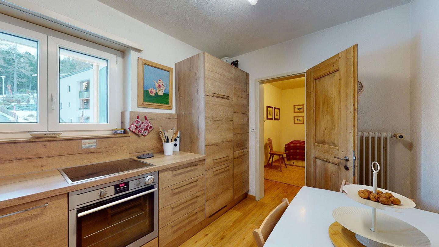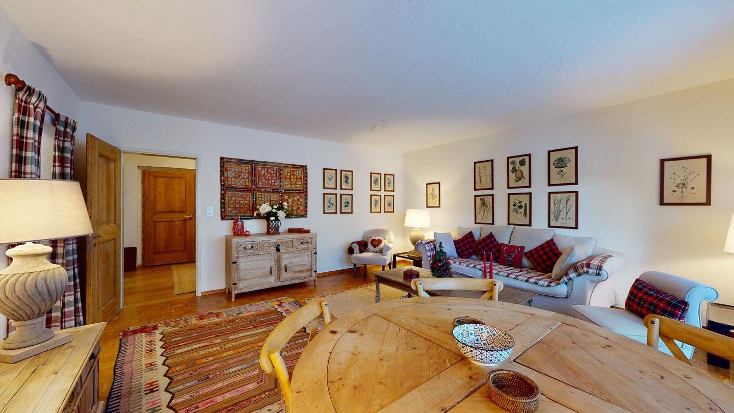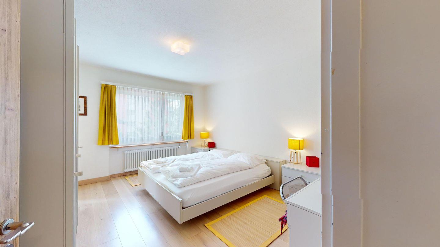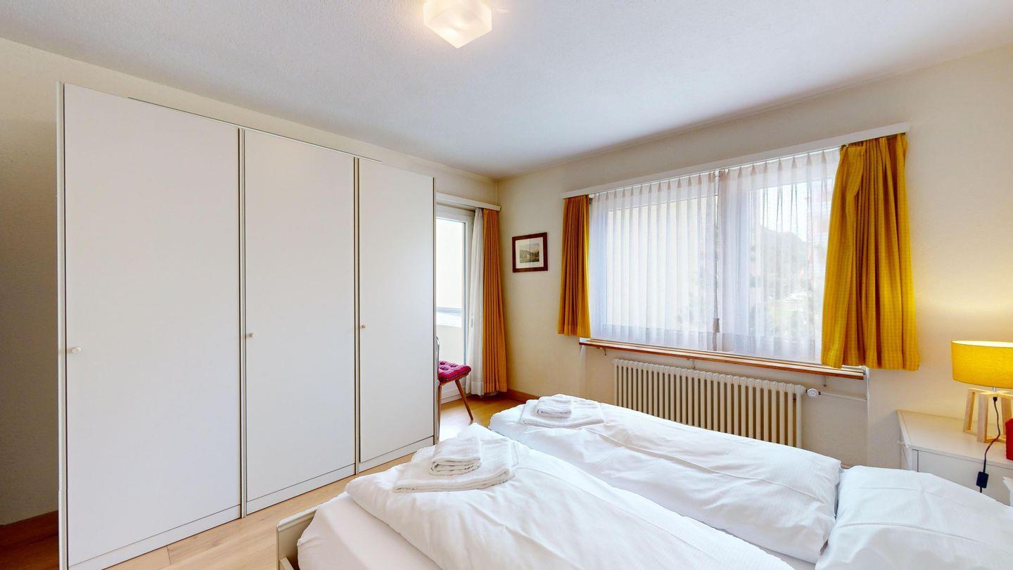2½ -Zimmerwohnung ca. 72 m² auf der ersten Etage, mit Lift. Entree mit Garderobe und einem Einzelbett. Wohn-/ Esszimmer mit Ausgang zum Süd-Balkon. Radio/TV und Internet. Separate Küche mit Fenster, Geschirrspüler, Backofen, Kühlschrank mit kleinem Gefrierfach. Bad/WC/Bidet/Lavabo. Doppelschlafzimmer. Waschküche zur Benützung (gegen Bezahlung). Garagenboxparkplatz (nicht für grössere Autos geeignet). Kein Ski- oder Veloraum