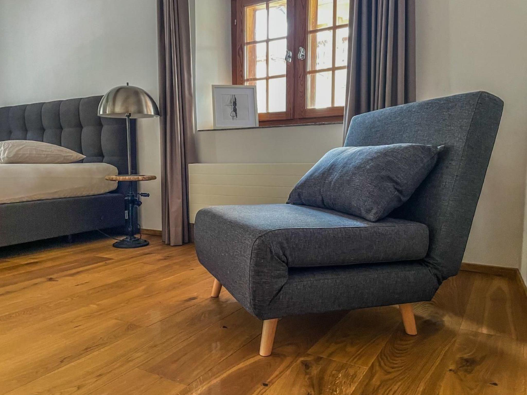 Living room: cosy armchair with stool, side table, Sonos Cube, fold-out sofa bed, wooden table for four people, Nespresso machine, pictures and decorations, highlight: Alpine panorama with ibexes.
