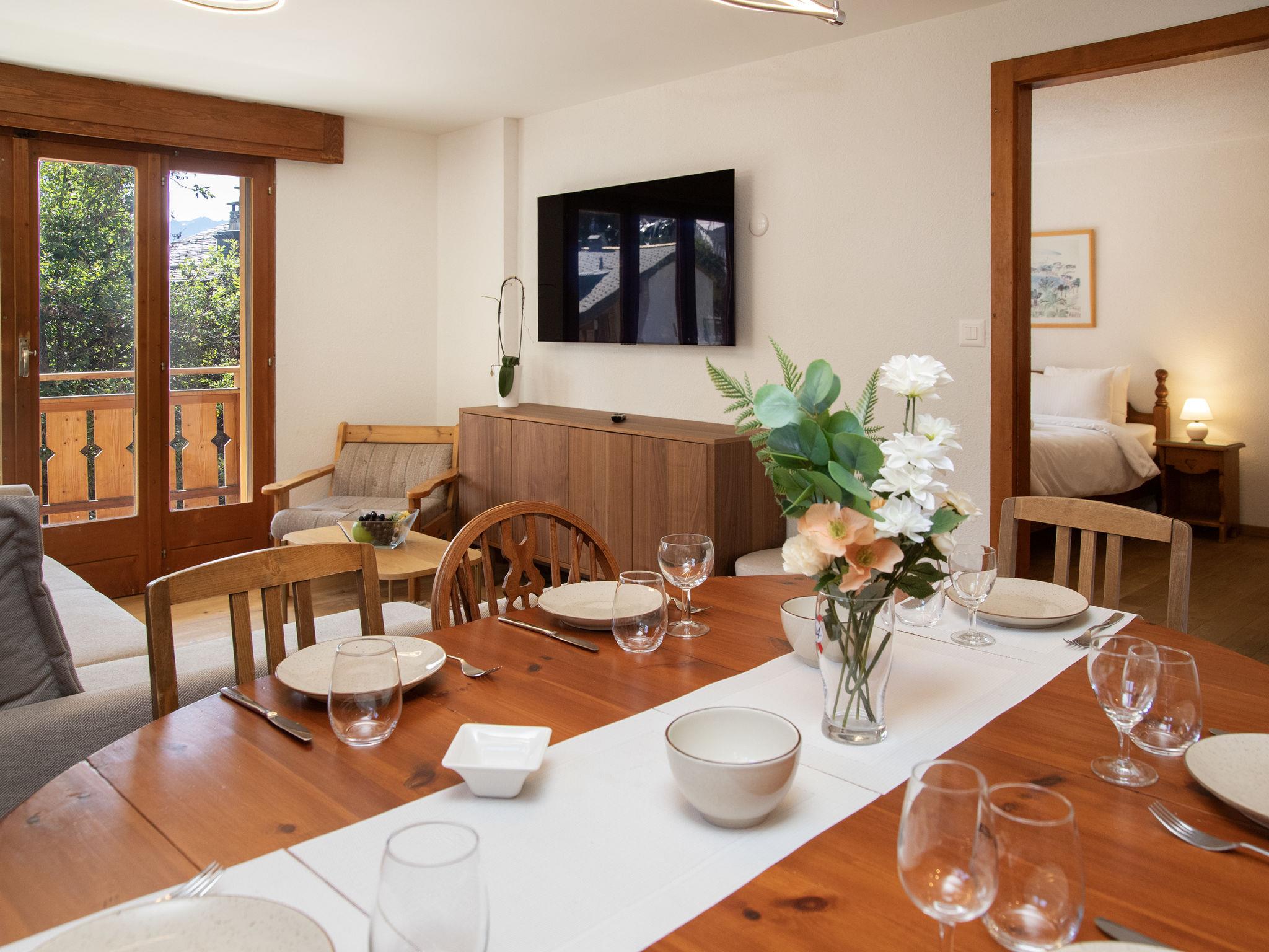 "Val Fleuri 208", 4-room apartment 100 m2 on 2nd floor, south facing position. Beautiful and tasteful furnishings: large living/dining room with open-hearth fireplace and cable TV (flat screen). Exit to the terrace. 1 large room with 1 double bed (1 x 160 cm, length 200 cm). Exit to the terrace. 2 large rooms, each room with 2 beds (90 cm, length 200 cm). Open kitchen (4 hot plates, oven, dishwasher, toaster, kettle, microwave, freezer, electric coffee machine, Capsules for coffee machine (Nespresso) extra, raclette grill, fondue Set (cheese)) with hatch. Bath/WC, shower/WC. Heating, electric heating, underfloor heating. Parquet floors. Very beautiful view of the mountains. Facilities: washing machine, dryer, hair dryer. Internet (WiFi, free). Parking. Please note: non-smokers only.