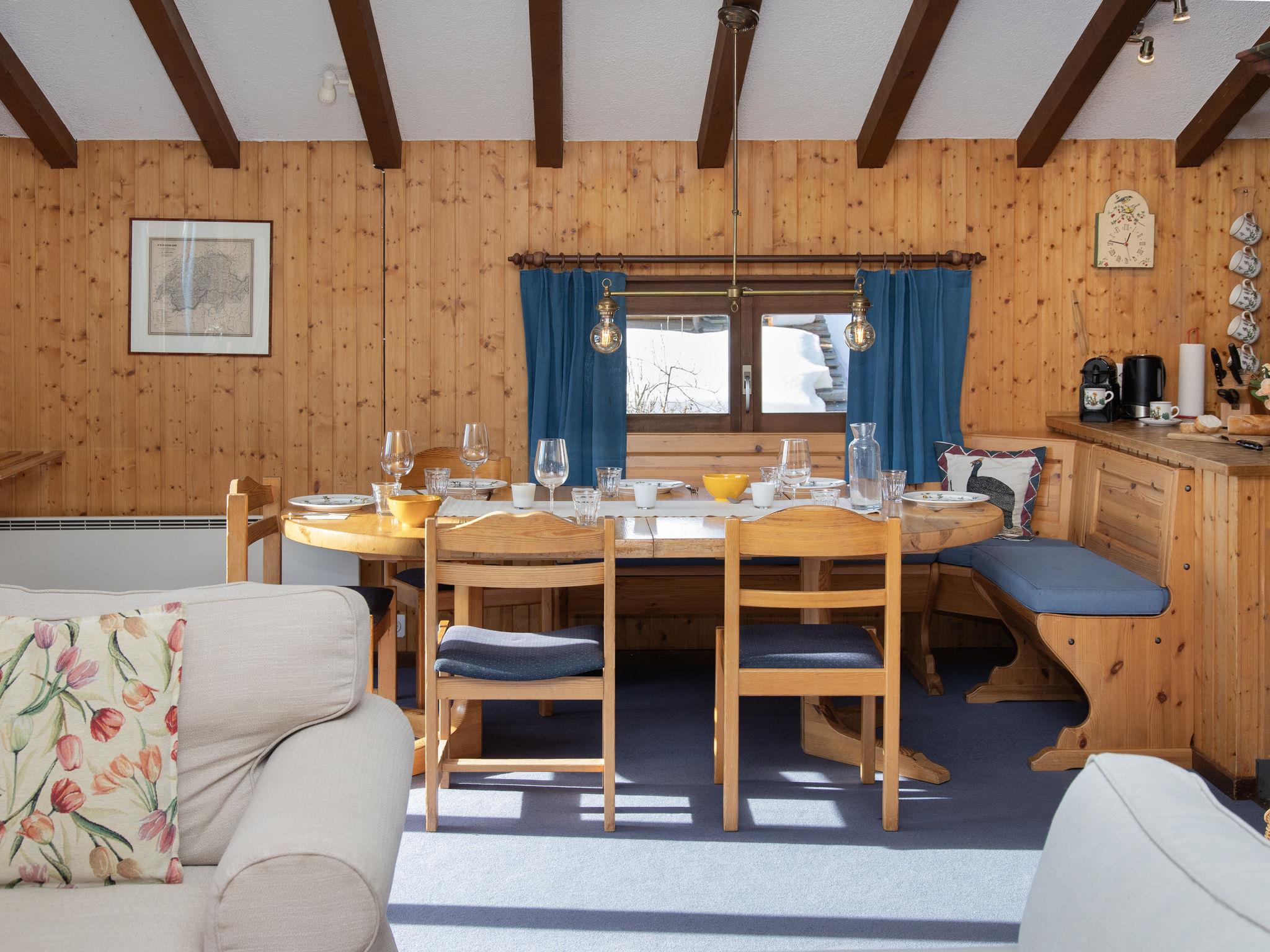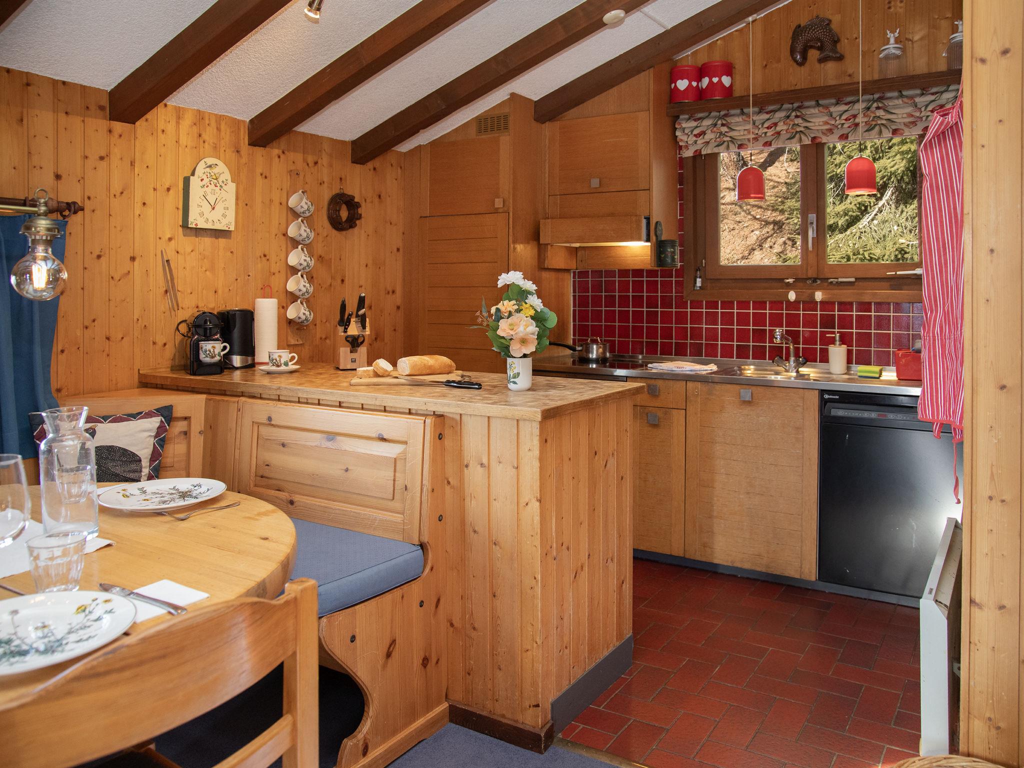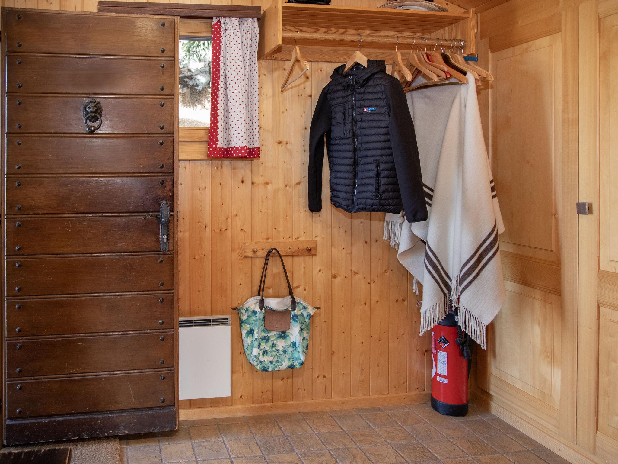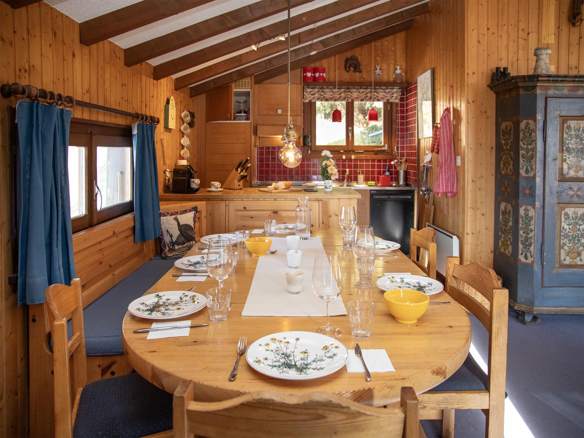"5 Ecorces", 5-room chalet on 3 levels, south facing position. Comfortable and cosy furnishings: living/dining room with open-hearth fireplace and cable TV. Exit to the balcony. Open kitchen (4 hot plates, oven, dishwasher, kettle, electric coffee machine, Capsules for coffee machine (Nespresso) extra, fondue Set (cheese)). 2 showers/WC, sep. WC. Electric heating. On the lower ground floor: 2 rooms, each room with 2 beds (90 cm, length 200 cm), hand-basin. Exit to the terrace. 1 room with 1 bed (90 cm, length 200 cm). 1 room with 2 beds (90 cm, length 200 cm). Carpet. Balcony, south facing position, terrace. Balcony furniture. Very beautiful view of the mountains, the countryside and the resort. Facilities: washing machine. Internet (WiFi, free). Parking (1 car) at 50 m. Please note: non-smokers only.