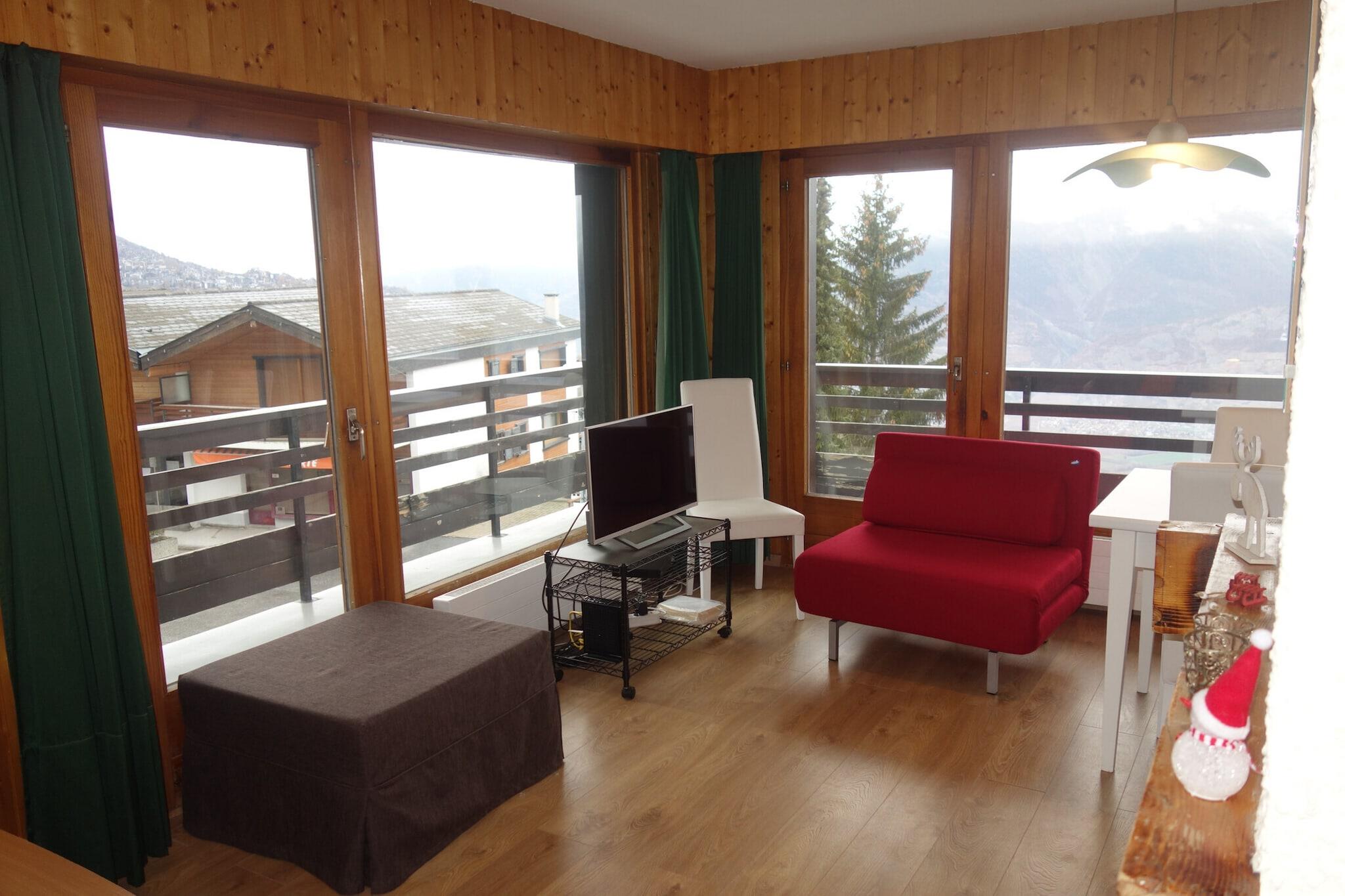 Sov i denne hyggelige 2-værelses lejlighed i hjertet af landsbyen Veysonnaz, Schweiz, med en betagende udsigt over dalen og bjergene. Lejligheden kan rumme op til 6 personer og byder på en lys stue med smart-tv og en dekorativ pejs, perfekt til et afslappende ophold. I stuen er der en sovesofa (140x200), mens soveværelse 1 har to enkeltsenge placeret side om side. Der er også en sammenklappelig køjeseng (80x190) i hallen for ekstra soveplads. Lejligheden har et badeværelse med bruser og toilet samt en balkon med en fantastisk udsigt over dalen og havemøbler til at nyde naturen. Lejligheden er ideelt beliggende i Diablerets-boligen, kun 400 meter fra gondolen, 40 meter fra den gratis vinterbus og kun 100 meter fra butikker og restauranter. For yderligere bekvemmelighed er et vaskerum og skirum til rådighed i bygningen. Parkeringspladser er tilgængelige på den offentlige parkeringsplads (afhængigt af tilgængelighed). Kæledyr, der vejer mindre end 15 kilo, er tilladt, og gæster kan få adgang til lejligheden via trapper eller elevator. Alpvision tilbyder flere fordele til at forbedre dit ophold, herunder gratis adgang til den offentlige swimmingpool (sæsonbestemt), deltagelse i Sun&Fun-aktivitetsprogrammet i højsommersæsonen og forskellige rabatter på leje af udstyr og tjenester. Valgfri tjenester, såsom sengelinned og håndklæder, komforttjenester og slutrengøring, er tilgængelige mod et ekstra gebyr. Alpvision Residences, med over 20 års erfaring, sikrer, at du får et mindeværdigt og behageligt ophold i de schweiziske alper.