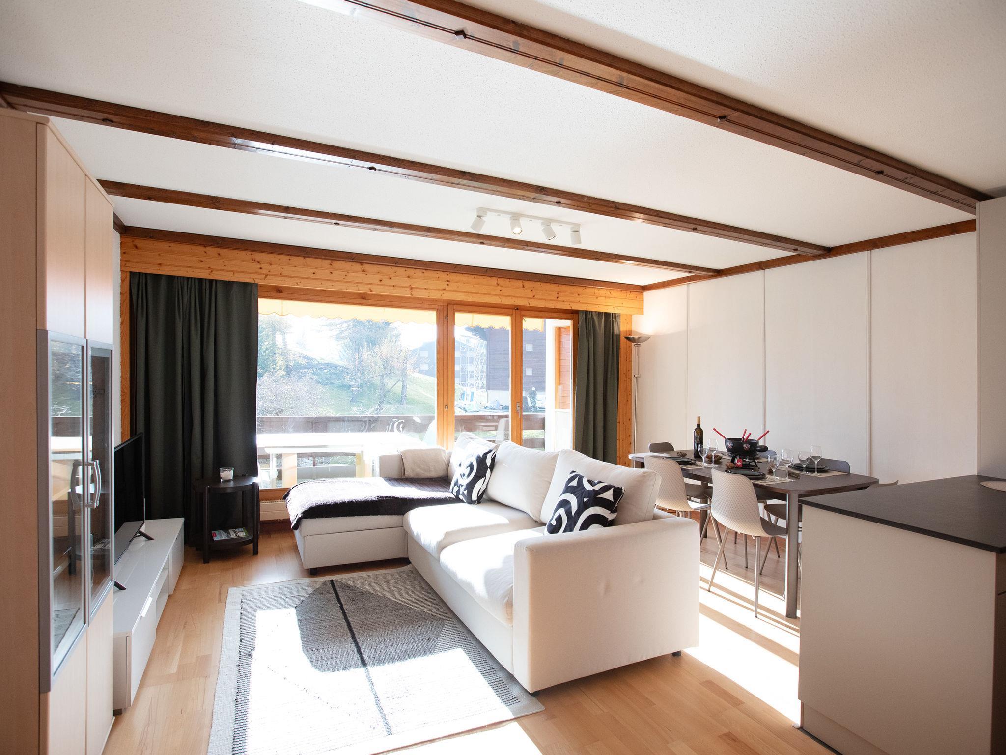 "Opale 24", 2-room apartment 48 m2 on 2nd floor, south facing position. Partly renovated in 2024, practical and comfortable furnishings: living/dining room with panoramic window with 1 sofabed (160 cm), dining table and TV (flat screen). Exit to the balcony, south facing position. 1 room with 1 french bed (1 x 160 cm). Exit to the balcony, south facing position. Open kitchen (oven, dishwasher, 4 ceramic glass hob hotplates, toaster, kettle, microwave, electric coffee machine, Capsules for coffee machine (Nespresso) extra, raclette grill, fondue Set (chinoise, cheese)). Bath/WC. Large balcony, south facing position. Balcony furniture. Partial view of the mountains and the countryside. Facilities: Internet (WiFi, free). Garage space n 19 (1 car). Please note: non-smokers only.