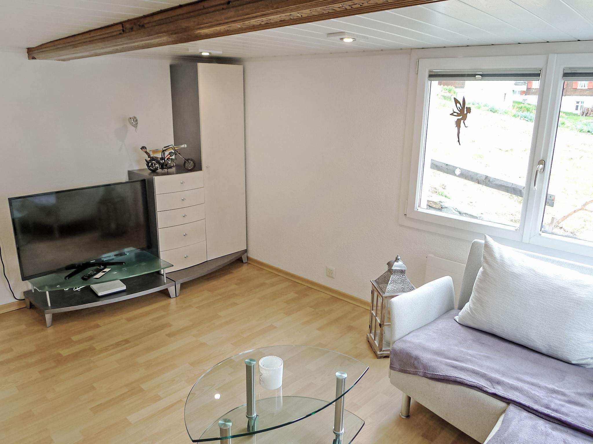 4-room apartment 50 m2, on the ground floor. Comfortable and cosy furnishings: living room with cable TV (flat screen). 1 small double bedroom. 1 small room with 1 x 2 bunk beds. 1 small room with 1 fold-away bed. Large kitchen (oven, dishwasher, 4 ceramic glass hob hotplates, electric coffee machine, raclette grill, fondue Set (cheese)) with dining table. Shower/WC. Small patio. Terrace furniture. Partial view of the mountains, the countryside and the resort. Facilities: Internet (WiFi, free). Please note: non-smokers only. Maximum 1 pet/ dog allowed.