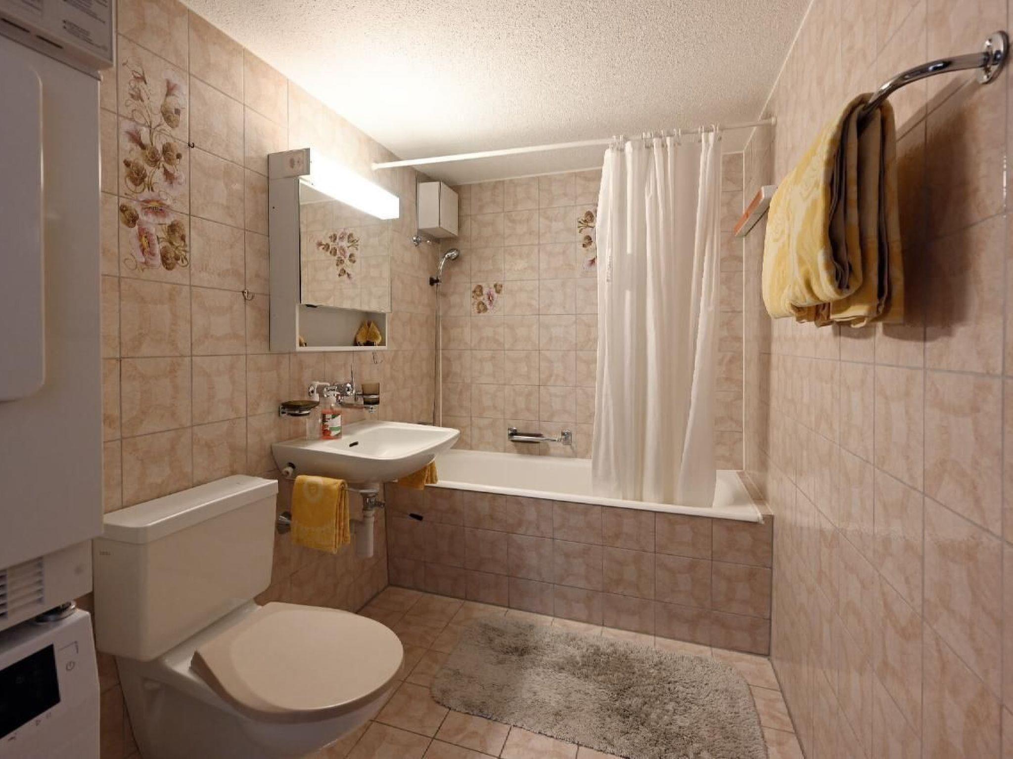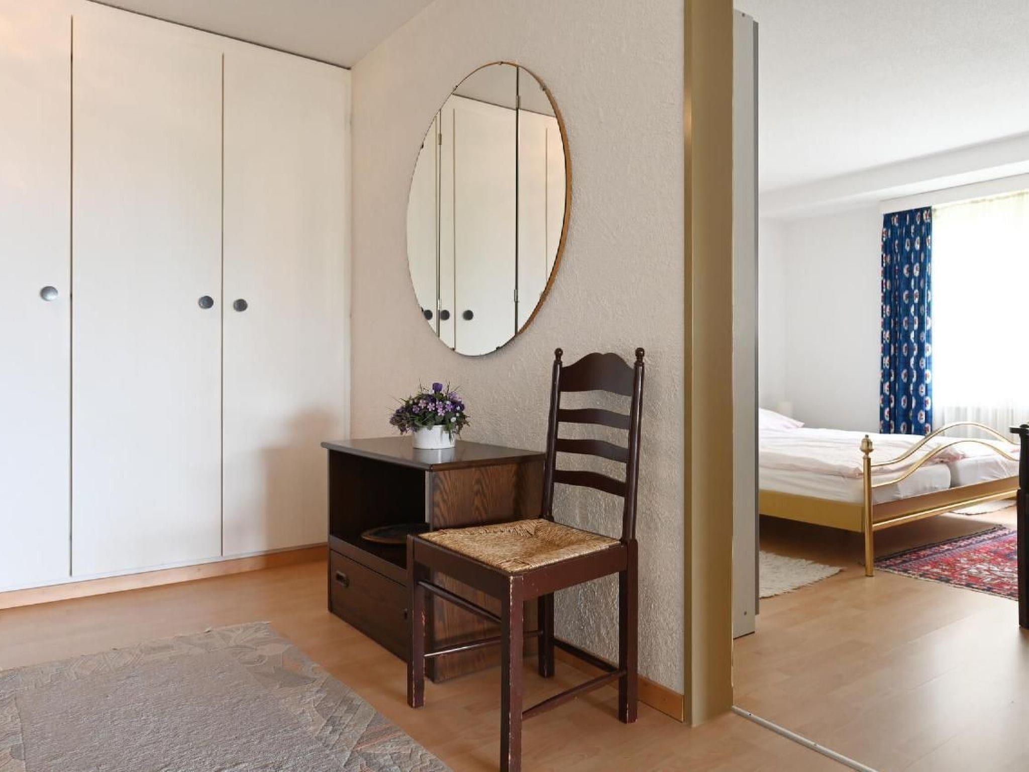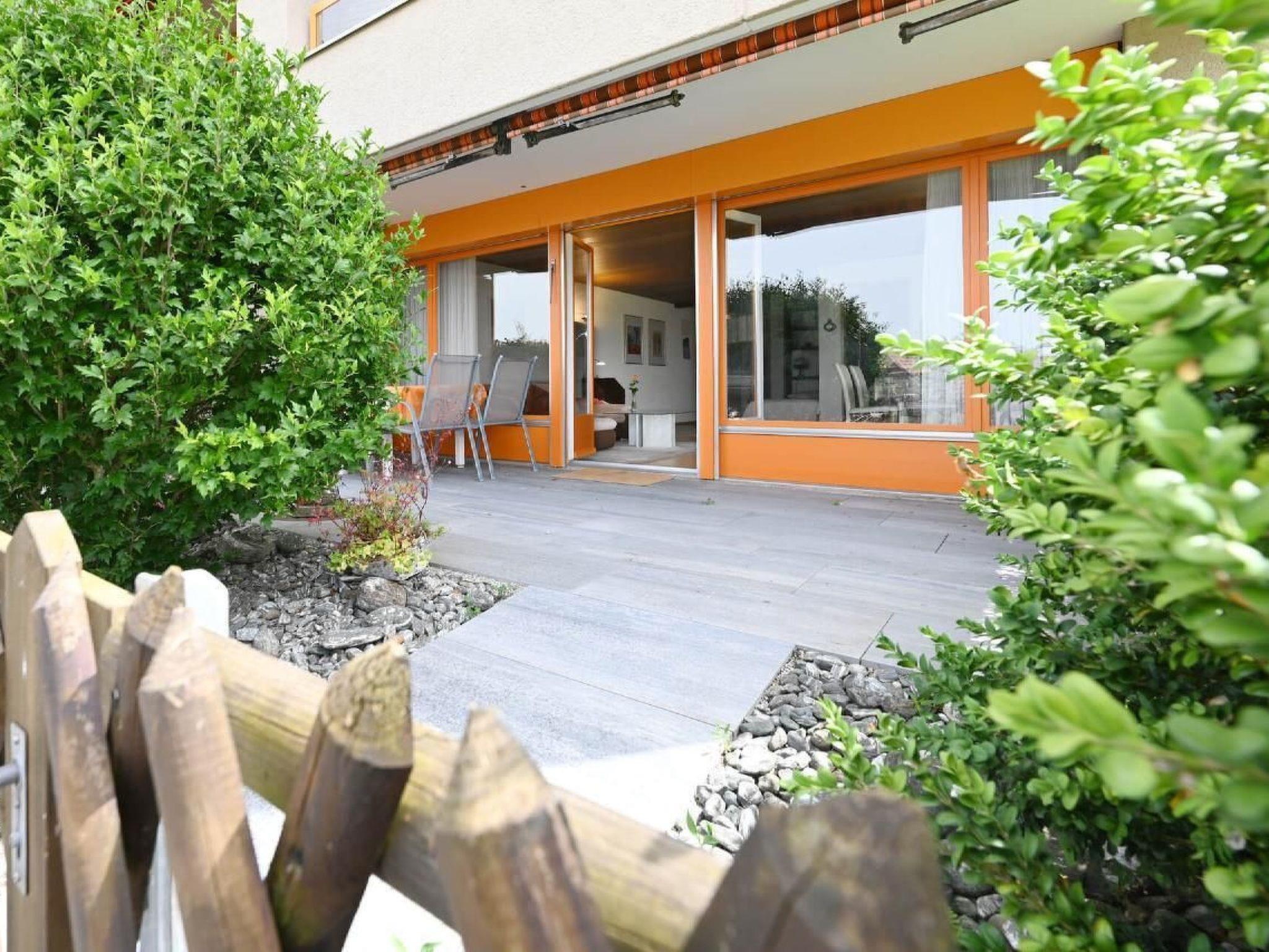 Flat Alpenblick, 2-room flat, floor area approx. 80 m2, with terrace, in a central, sunny location facing south-west with a beautiful view of the lake and mountains, about 100 metres from the lake, classified with 4 stars. The flat has a bedroom with double bed and wardrobe, TV. In the living-dining room you will find a dining table with 4 chairs, upholstered furniture, telephone, colour cable TV and a furnished terrace in front of the living room. On request 1 or 2 beds in the rear part of the living room (extra charge for occupancy by more than 2 persons, plus Fr. 10.- per additional person per night). Electric kitchen with 4-ring hob, fridge with freezer compartment, dishwasher, coffee machine, all fully equipped. Bathroom with WC, washbasin, bathtub and washing machine with tumble dryer. Restaurant and indoor swimming pool in the rear building, sauna, bio sauna, solarium and heat cabin can also be used. Garage for guests with a motor vehicle obligatory.