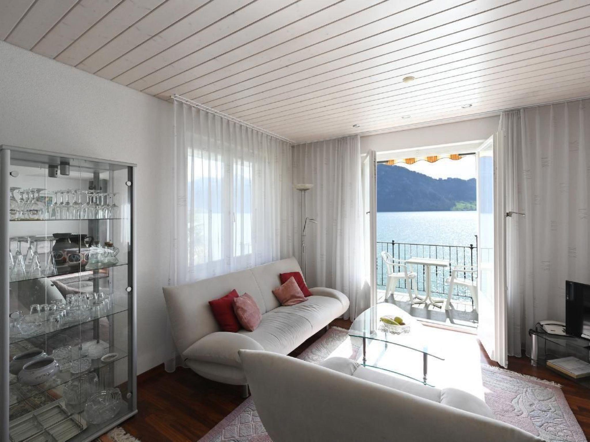 Haus Stirnemann is separated from the lake by the access road, in a quiet location. 2-room non-smoking holiday flat, floor area approx. 66 m2 on the second floor with magnificent panoramic views of the lake and mountains. The flat is classified with 4 stars. The flat comprises 1 bedroom with a bed with 2 mattresses, large built-in wardrobe. Living room with dining table and 4 chairs, upholstered furniture, radio, colour cable TV and internet. In front of the living room, furnished balcony. An open, electric kitchen with 4-ring ceramic hob, oven, fridge with freezer compartment, dishwasher, coffee filter machine, all fully equipped, shower-WC with washing machine. A private car park or garage space in Einstellhmalle is reserved for our guests. The sunbathing lawn by the lake is available for our guests to use.