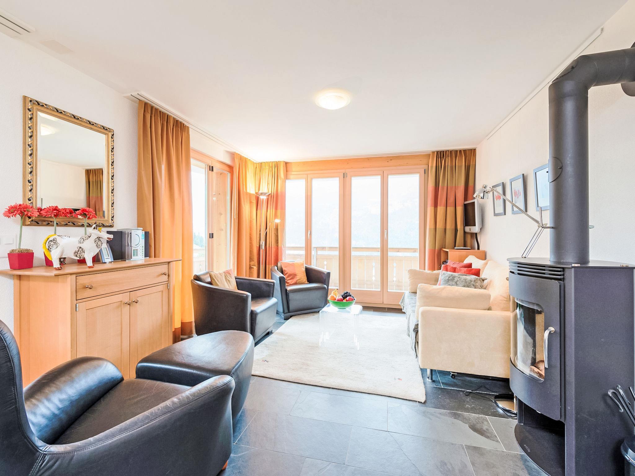 "Silberhorn Apt. DW", 3-room apartment 65 m2 on 1st floor. Bright, modern and tasteful furnishings: living/dining room with Scandinavian wood stove, dining table, satellite TV, cable TV, international TV channels, radio, CD-player and DVD. 1 room with 1 double bed (2 x 90 cm, length 200 cm) with 1 double bed (2 x 80 cm, length 200 cm). Open kitchen (oven, dishwasher, 4 induction hot plates, toaster, kettle, electric coffee machine, Capsules for coffee machine (Nespresso) extra, fondue Set (cheese)). Shower/WC, bath/shower/WC. Balcony 30 m2, south facing position and west facing position. Balcony furniture. Very beautiful panoramic view of the mountains. Facilities: iron, hair dryer, logs (extra). Internet (WiFi, free). Blu-ray player. Please note: non-smokers only. CH3824.42.1