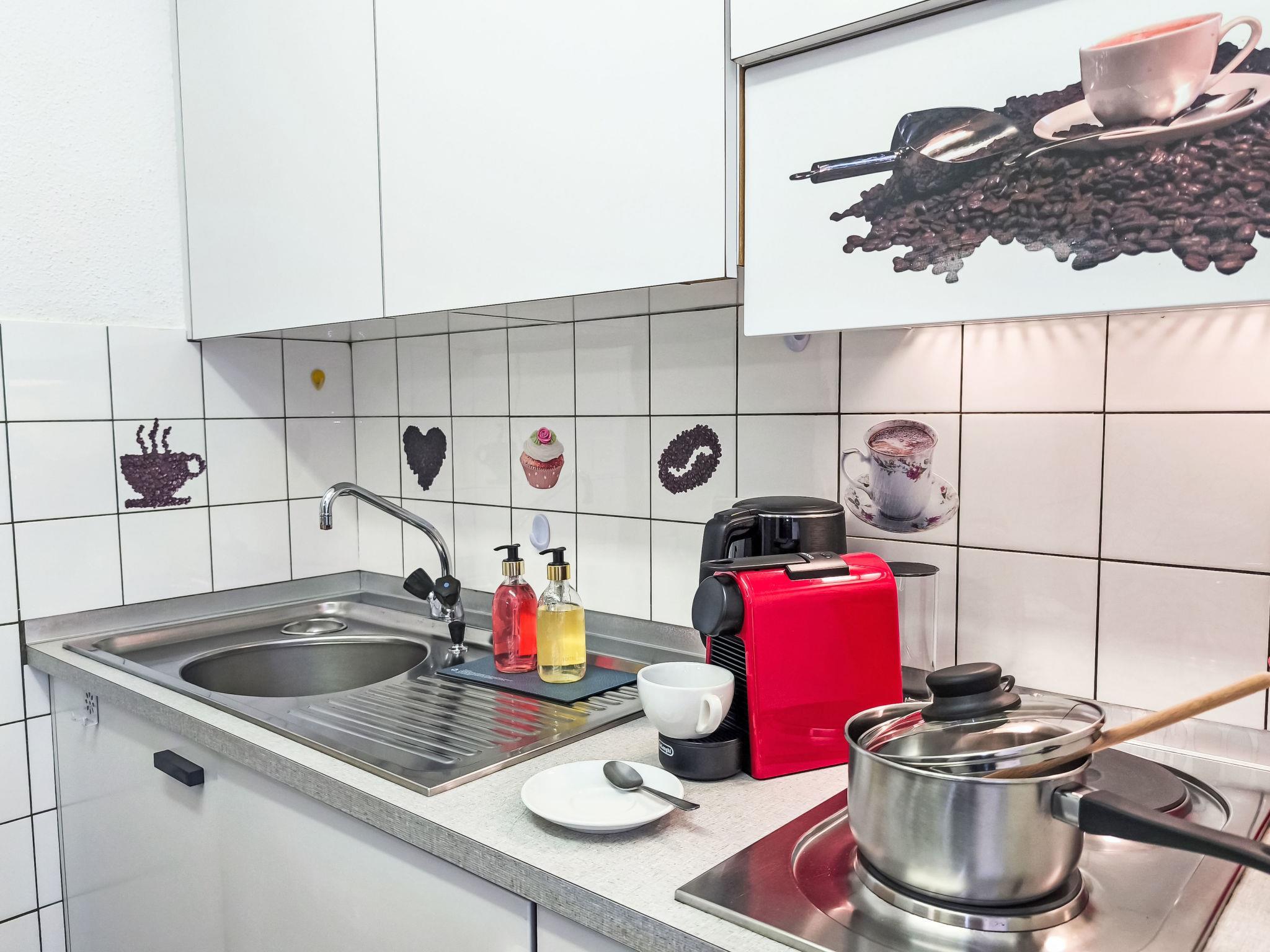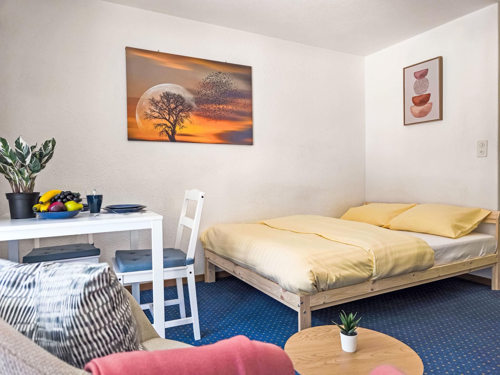 "BeKb-Gebäude Studio No02", 1-room studio on 1st floor. Cosy furnishings: living/sleeping room with 1 double bed (140 cm, length 200 cm), cable TV. Exit to the balcony. Small kitchen (2 hot plates, oven, toaster, kettle, electric coffee machine, Capsules for coffee machine (Nespresso) extra, raclette grill, fondue Set (cheese)). Shower/WC. Carpet. Balcony 8 m2. Very beautiful view of the mountains and the resort. Facilities: hair dryer. Internet (WiFi, free). Please note: non-smokers only.