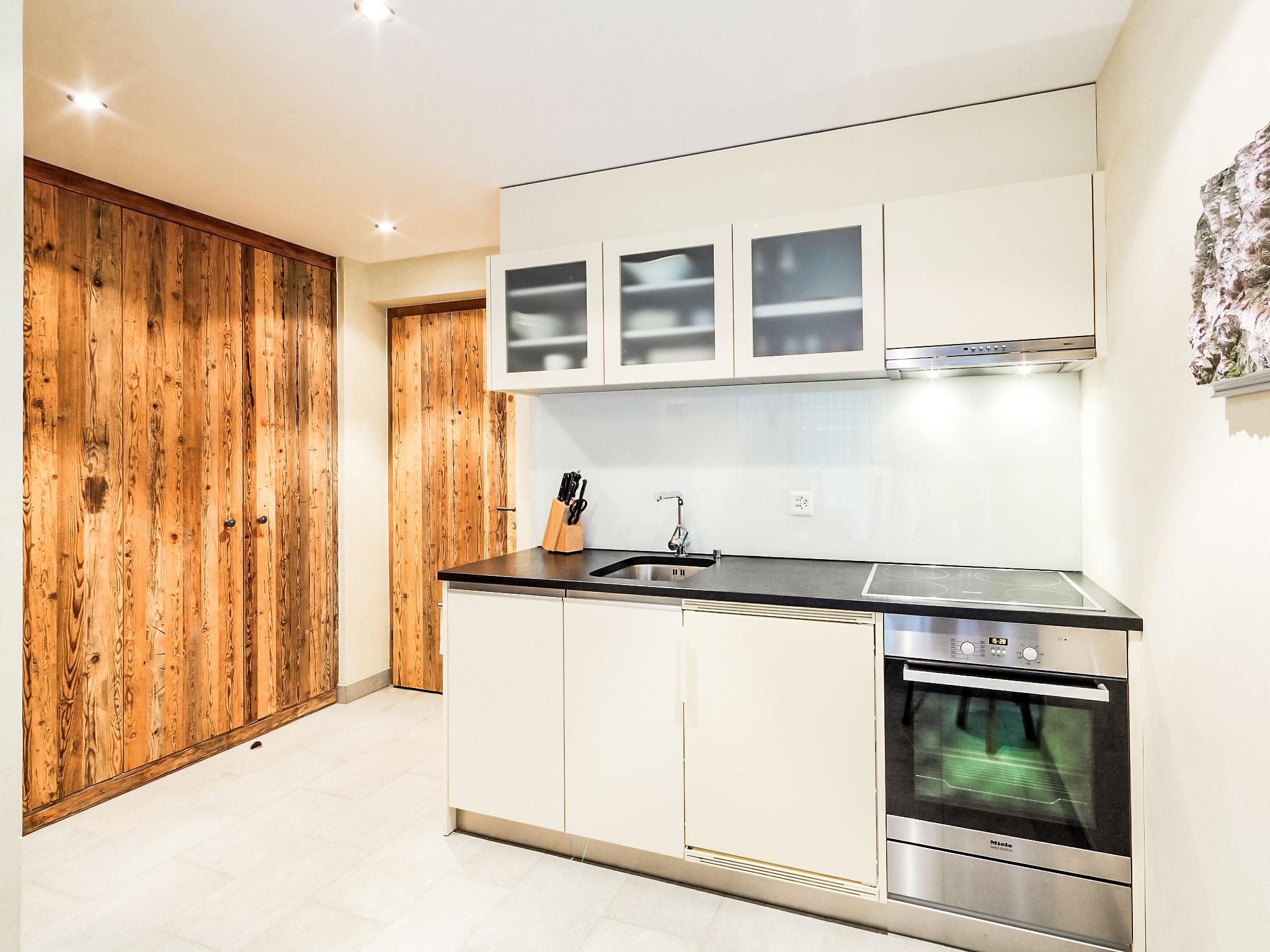 1-room apartment 39 m2, on the ground floor. Comfortable and luxurious furnishings: open living/sleeping room with 1 double bed, dining table, TV, radio, CD-player and DVD. Exit to the terrace. Open kitchen (oven, dishwasher, 4 induction hot plates, toaster, kettle, freezer, electric coffee machine, Capsules for coffee machine (Nespresso) extra, fondue Set (cheese)). Bath/WC, hydro massage bath. Small terrace. Terrace furniture. Facilities: safe, hair dryer. Internet (WiFi, free). Please note: non-smokers only.