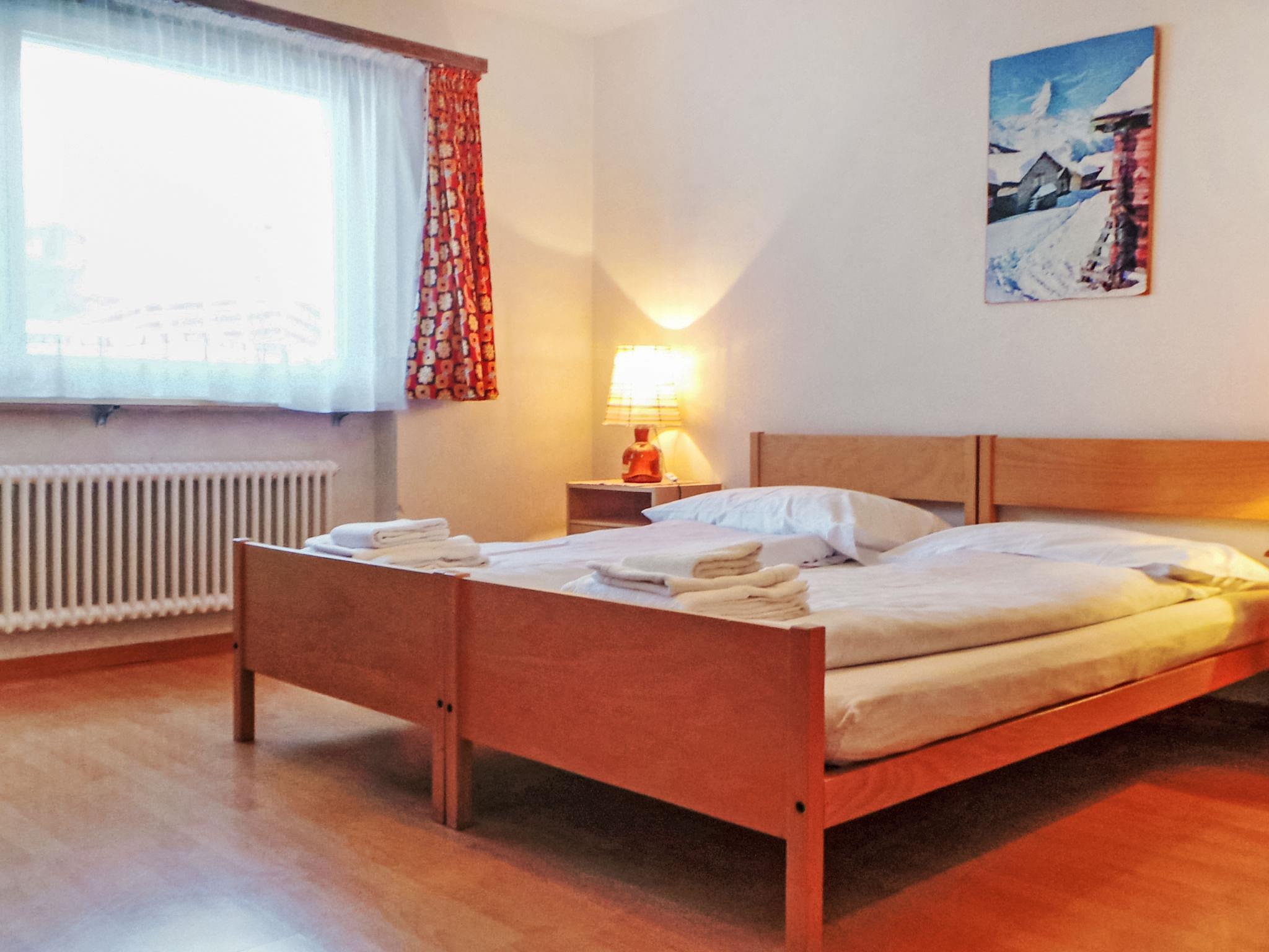 2-room apartment 65 m2, on the ground floor. Very simple furnishings: living/sleeping room with 1 double sofabed (160 cm, length 200 cm), dining table and TV. Exit to the terrace. 1 double bedroom with 1 double bed (2 x 90 cm, length 210 cm). Kitchen (3 hot plates, oven, toaster, kettle, microwave, freezer, electric coffee machine, fondue Set (cheese)). Bath/bidet/WC. Terrace 15 m2 partly roofed, south-west facing position. Terrace furniture. Very beautiful view of Matterhorn. Facilities: hair dryer. Internet (WiFi, free). Please note: non-smokers only.