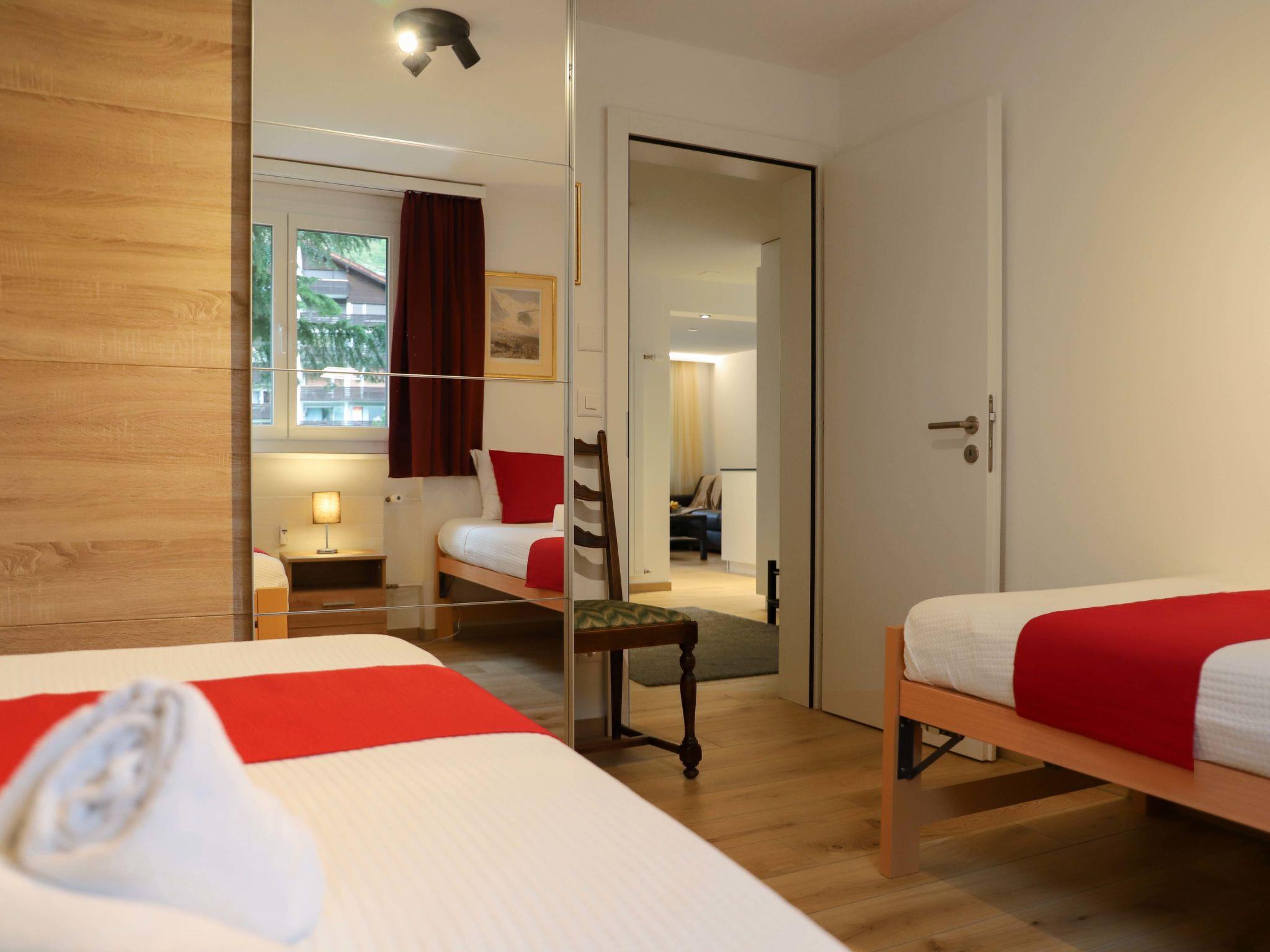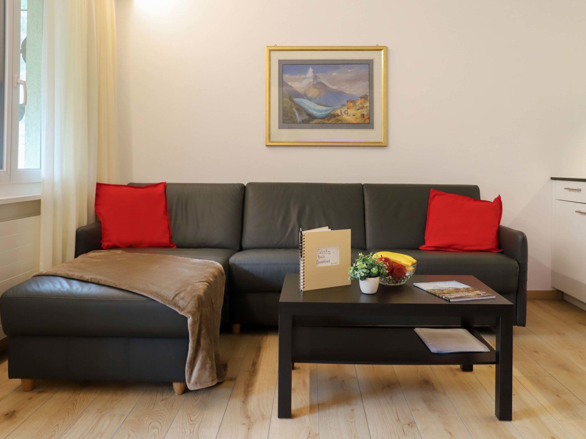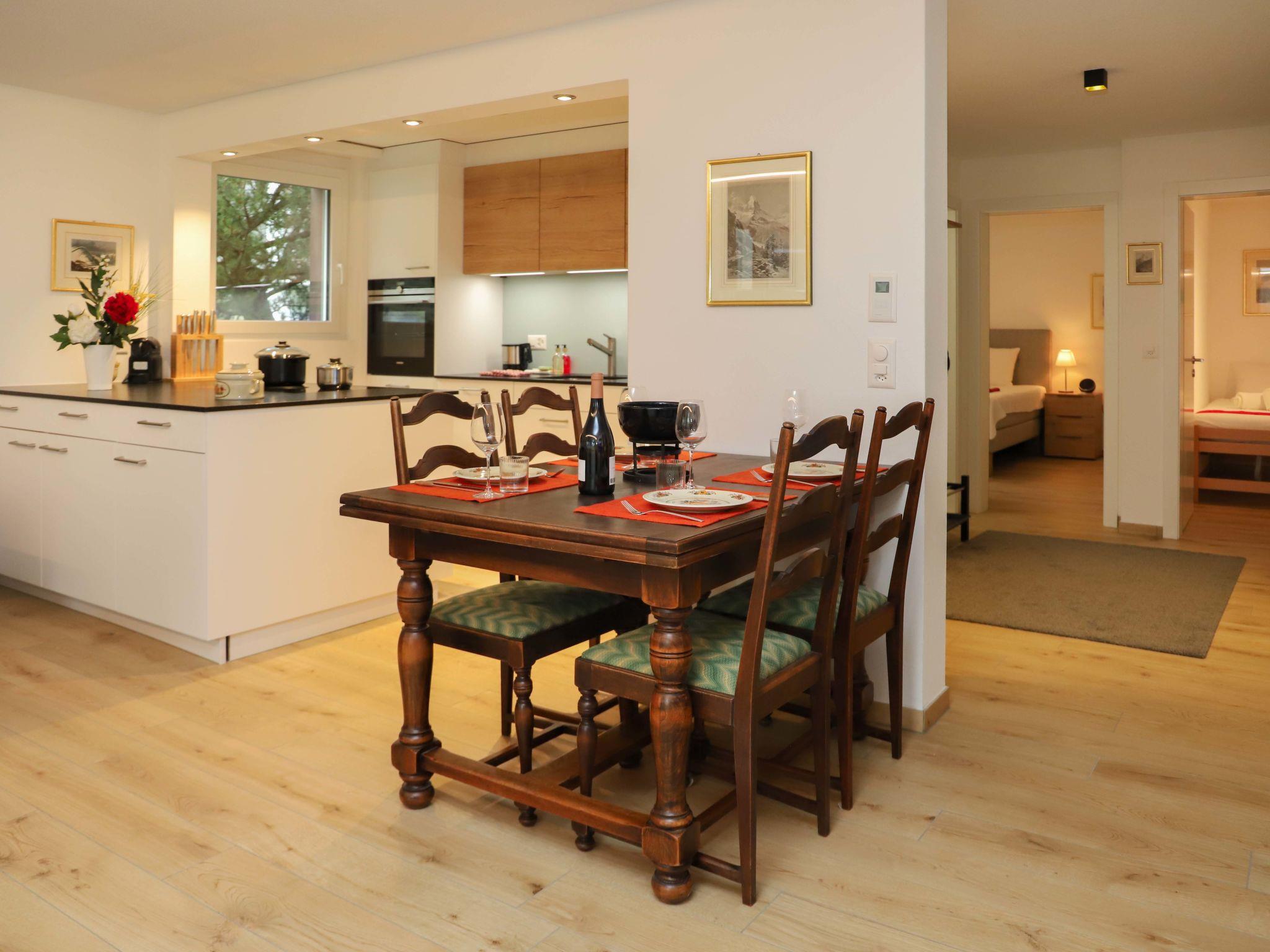 "Grillon", 3-room apartment 90 m2, on the ground floor, south facing position. Bright, fully renovated in 2022, beautiful and modern furnishings: open living/dining room with dining table and TV. Exit to the balcony, south facing position. 1 double bedroom with 1 double bed (1 x 180 cm, length 200 cm). 1 room with 2 beds (90 cm, length 200 cm). Open kitchen (oven, dishwasher, 4 induction hot plates, toaster, kettle, freezer, electric coffee machine, cooking island). Shower/WC, double hand-basin. Parquet floors. Balcony, south facing position. Balcony furniture. Side view of the Matterhorn. Facilities: hair dryer. Internet (WiFi, free). Please note: non-smokers only.