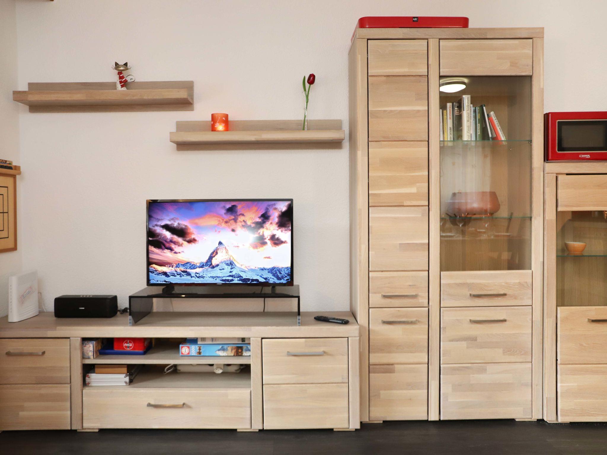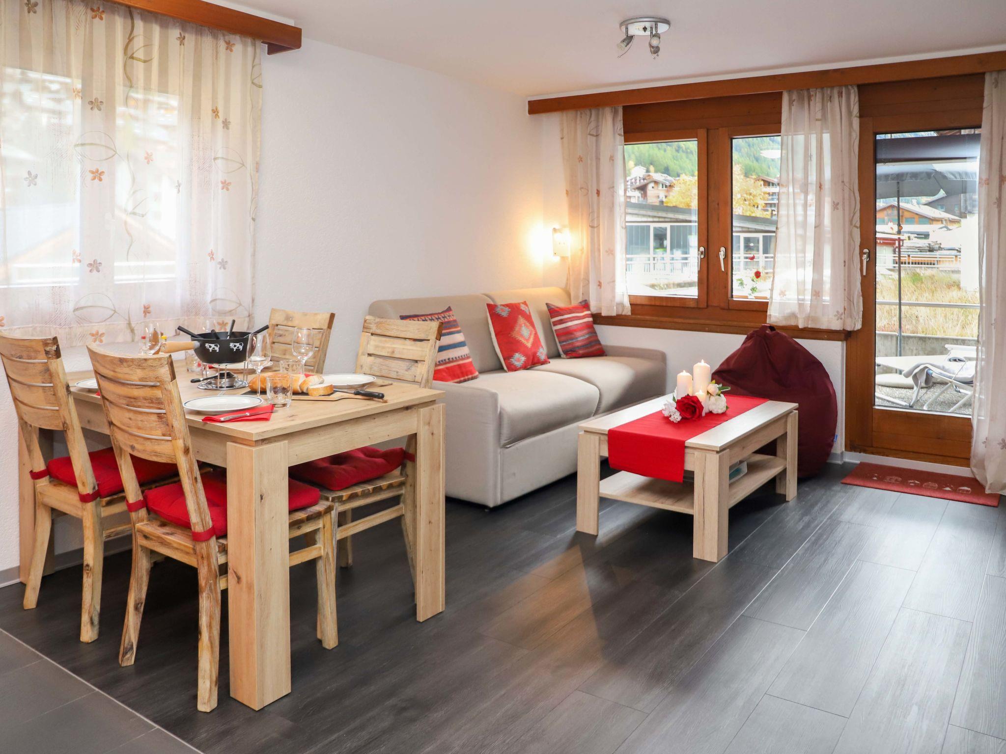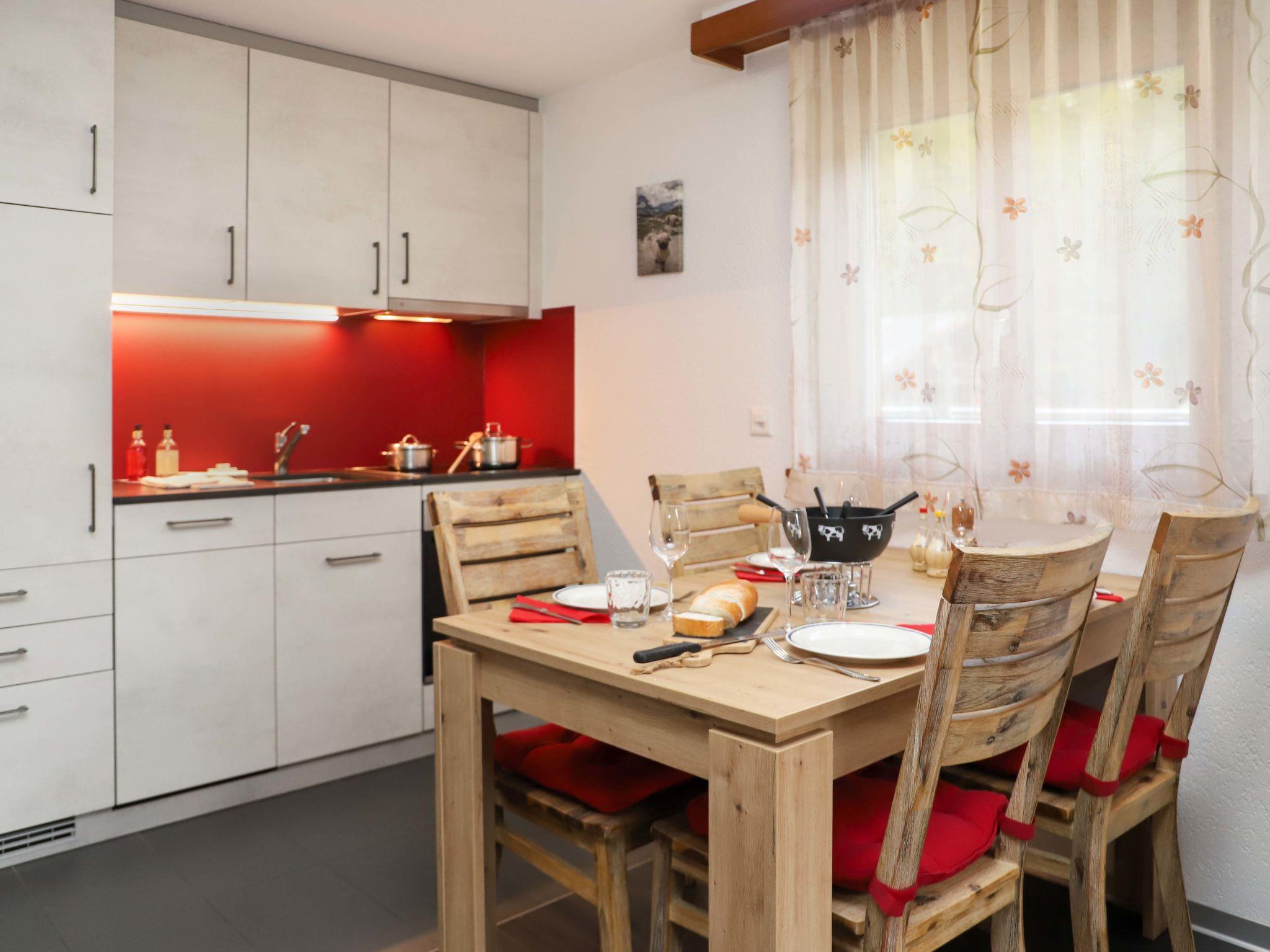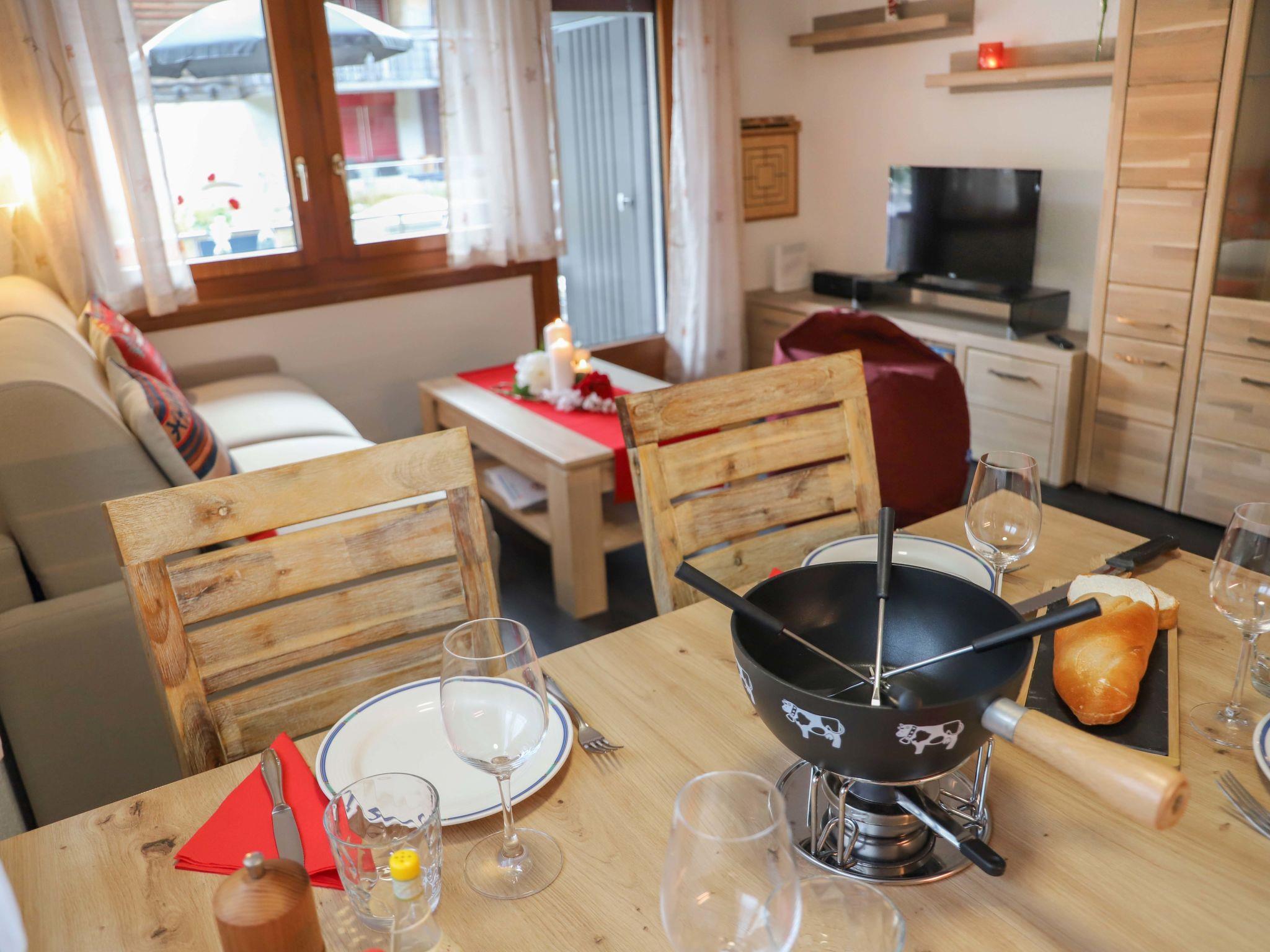 2-room apartment 55 m2, on the ground floor, south facing position. Bright, renovated in 2022, beautiful and cosy furnishings: living/sleeping room with 1 sofabed (160 cm, length 195 cm), TV. Exit to the terrace, south facing position and east facing position. 1 room with 1 double bed (1 x 180 cm, length 200 cm). Open kitchen (oven, dishwasher, 4 ceramic glass hob hotplates, toaster, kettle, microwave, freezer, electric coffee machine, raclette grill, fondue Set (chinoise, cheese)) with dining table. Shower/WC. Heating. Terrace, south facing position and, east facing position. Terrace furniture. Side view of the mountains. Facilities: hair dryer. Internet (WiFi). Please note: non-smokers only.