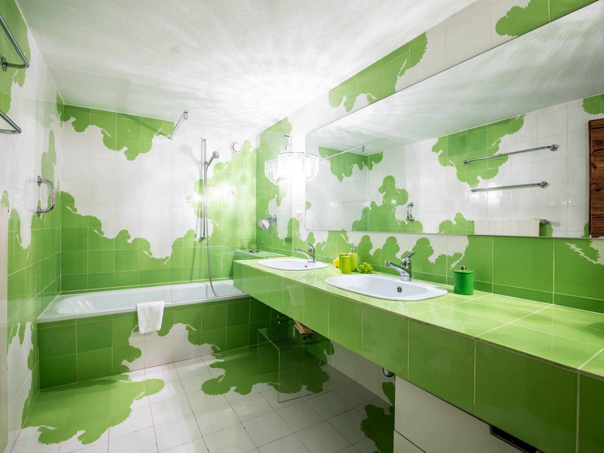 - Large bathroom with two washbasins, bathtub / shower with funky tile decor from the 70s.