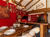 - Dining area with rustic wooden table and open-plan kitchen with bar counter