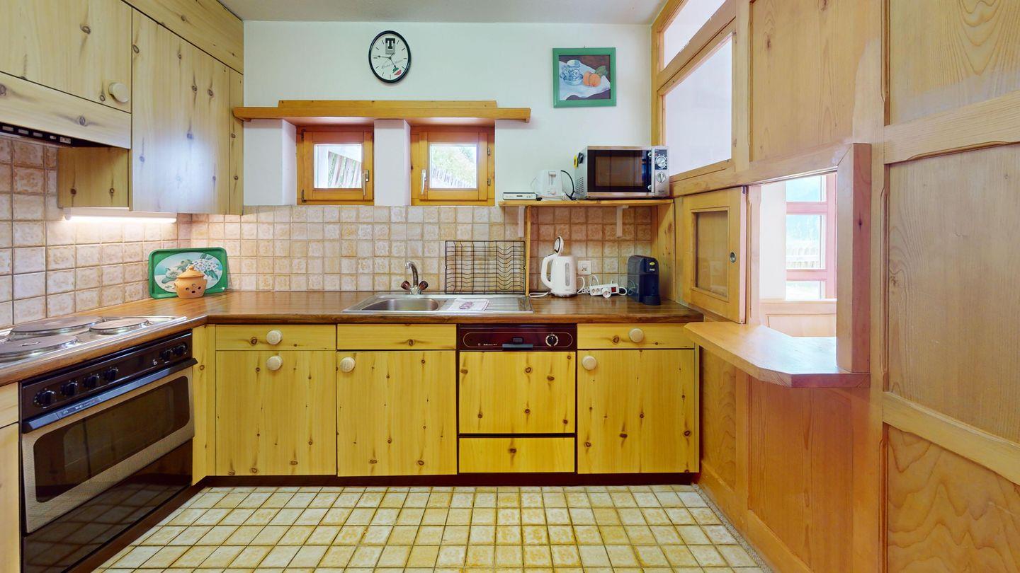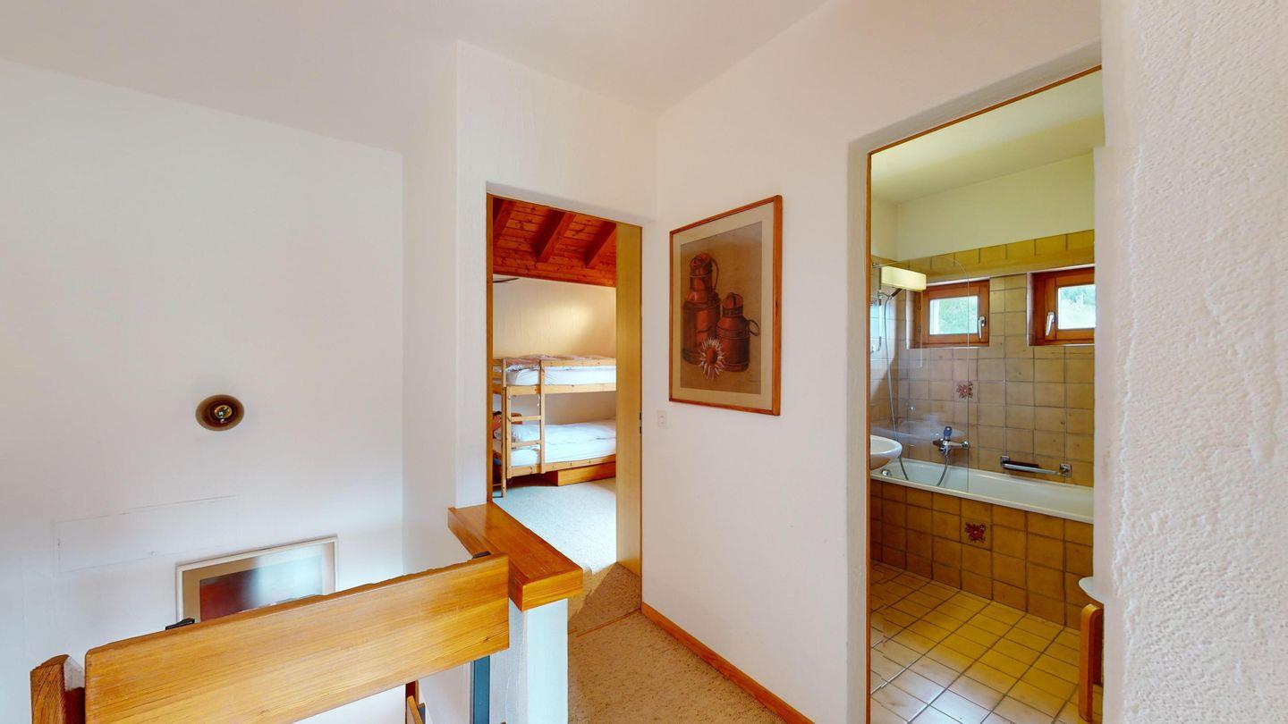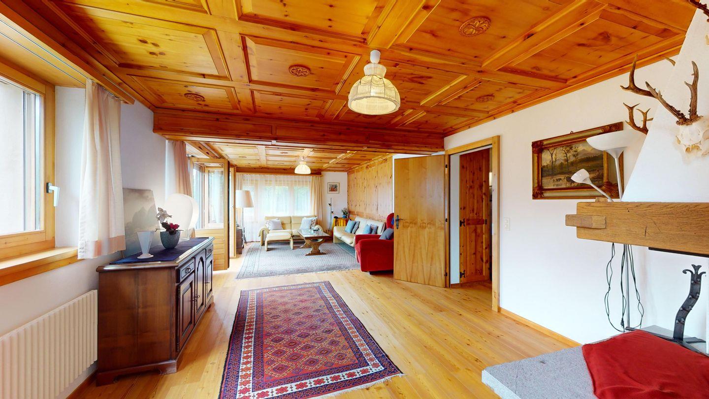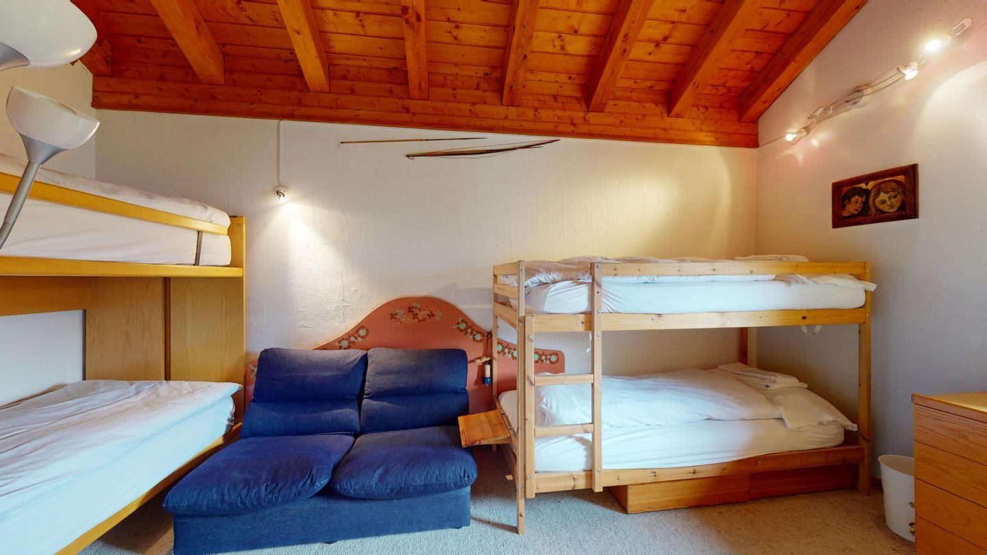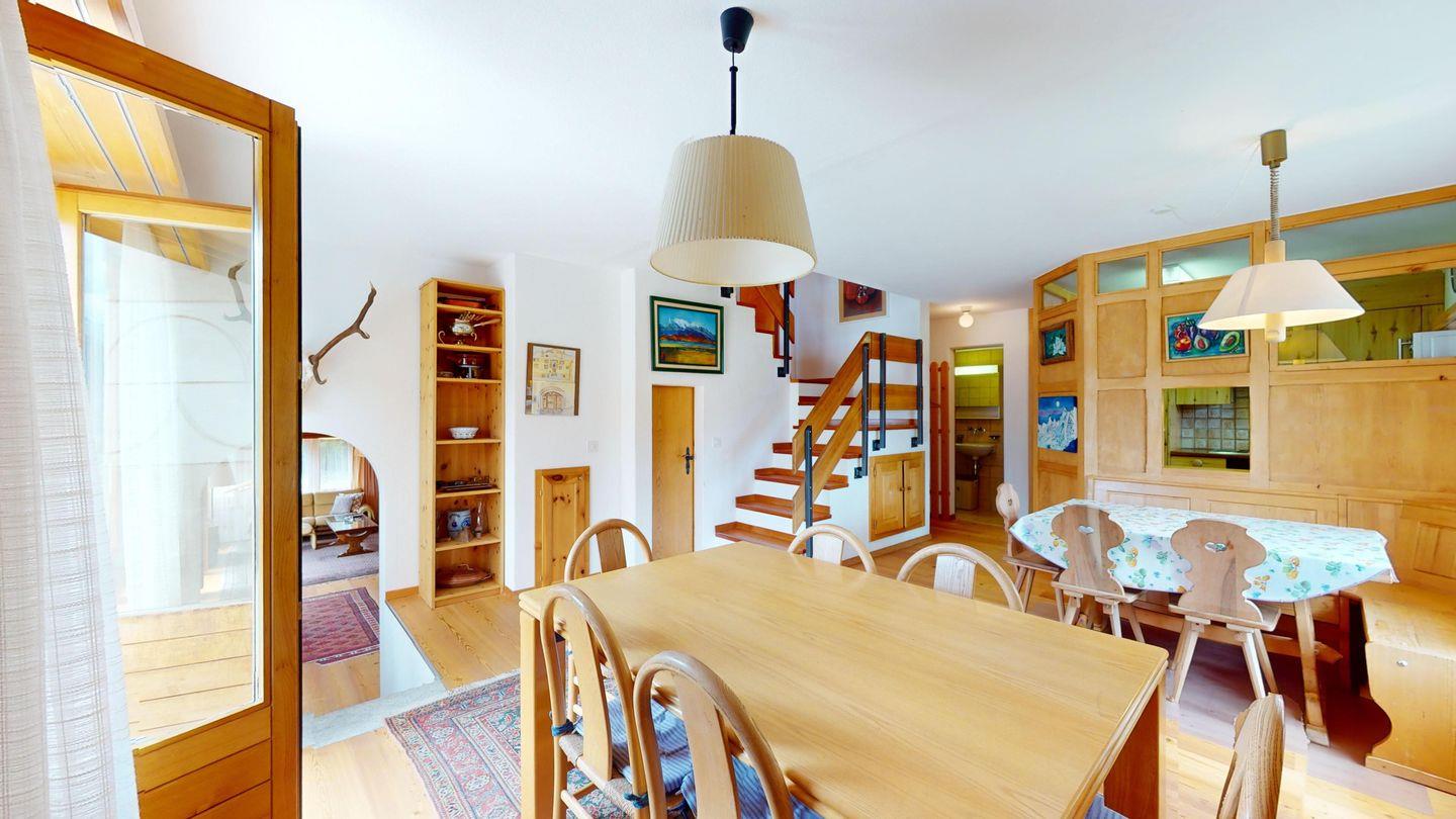 5-½ Zimmerwohnung an sonniger Lage, mit herrlicher Sicht ins Tal und auf mehreren Etagen verteilt. Eingang mit Garderobe und Badezimmer mit Wanne, WC, Bidet und Waschbecken. Wohnzimmer mit TV, Kamin, Terrasse und Garten. Küche mit Herd, Ofen, Kühlschrank und Geschirrspüler. Esszimmer mit zwei Esstischen und Terrasse. Gäste-WC. Ein Einzelschlafzimmer. Ein Doppelschlafzimmer mit eigenem Badezimmer (Dusche, WC, Bidet und Lavabo). Ein Doppelschlafzimmer, und ein Schlafzimmer mit zwei Etagenbetten. Badezimmer mit Wanne, WC, Bidet und Waschbecken. Gemeinsame Waschküche und Skiraum. Zwei gedeckte Parkplätze. Haustiere sind nicht erlaubt. Nichtraucherwohnung.