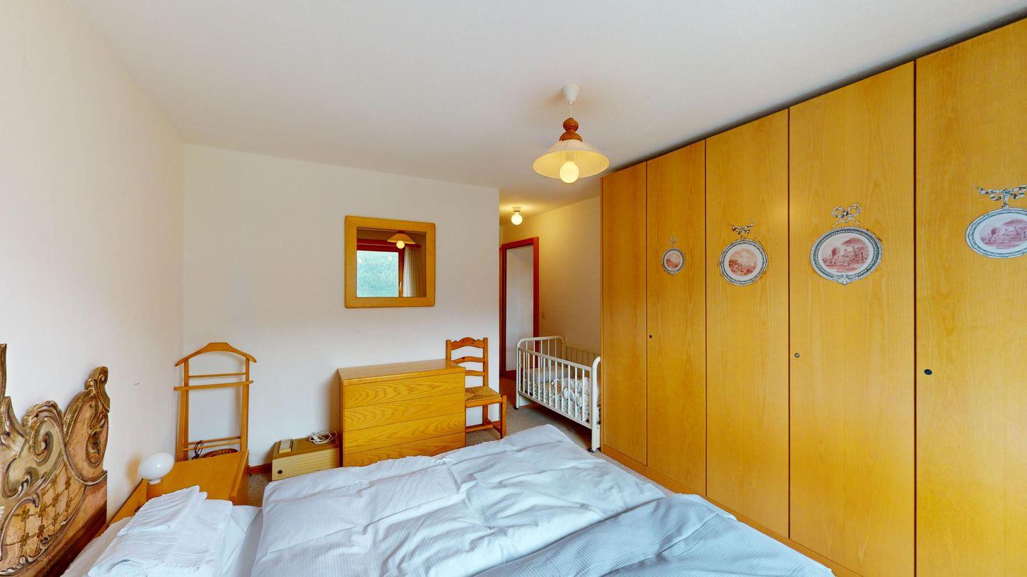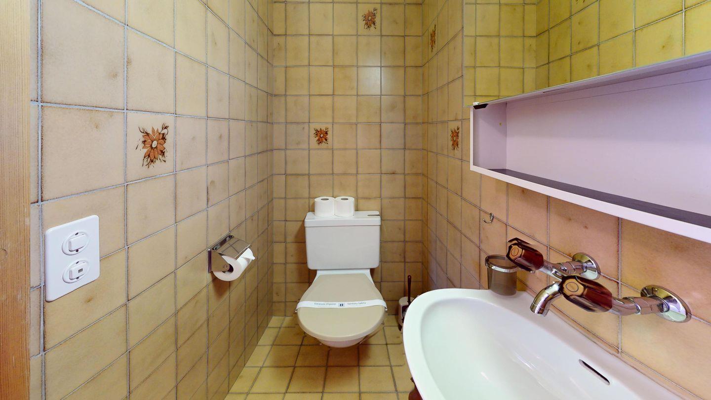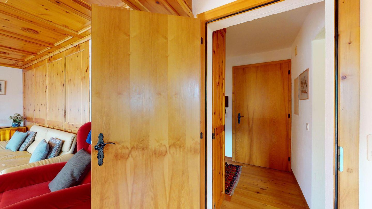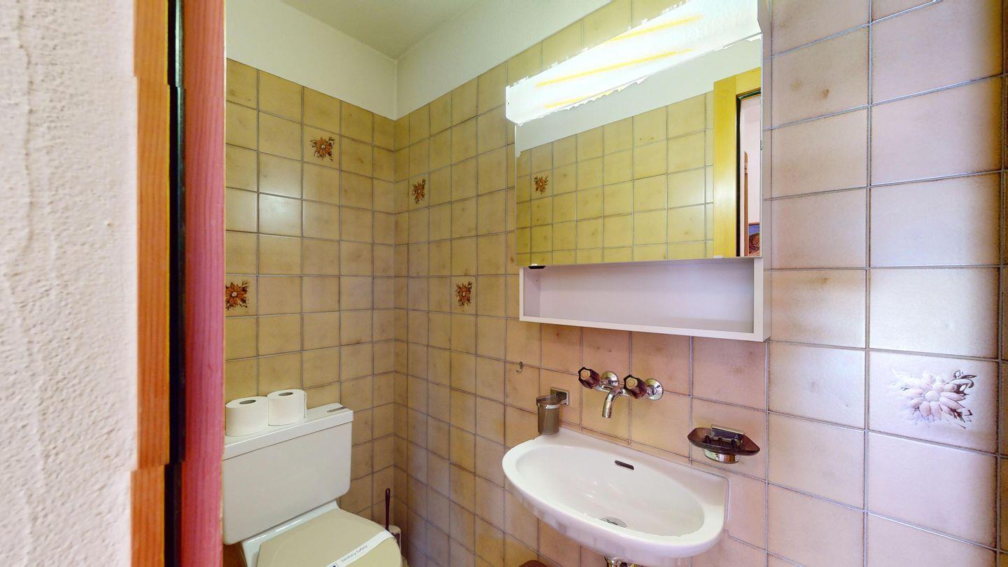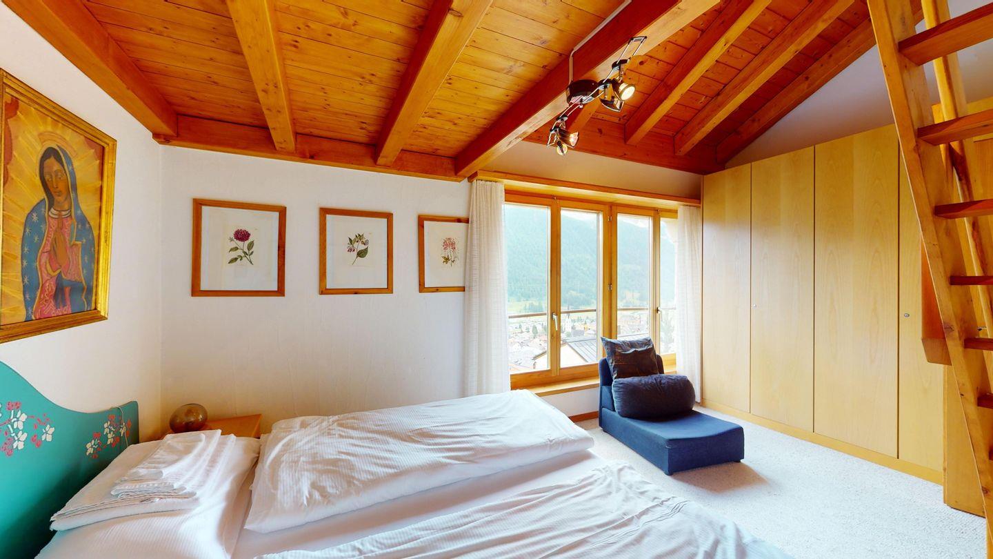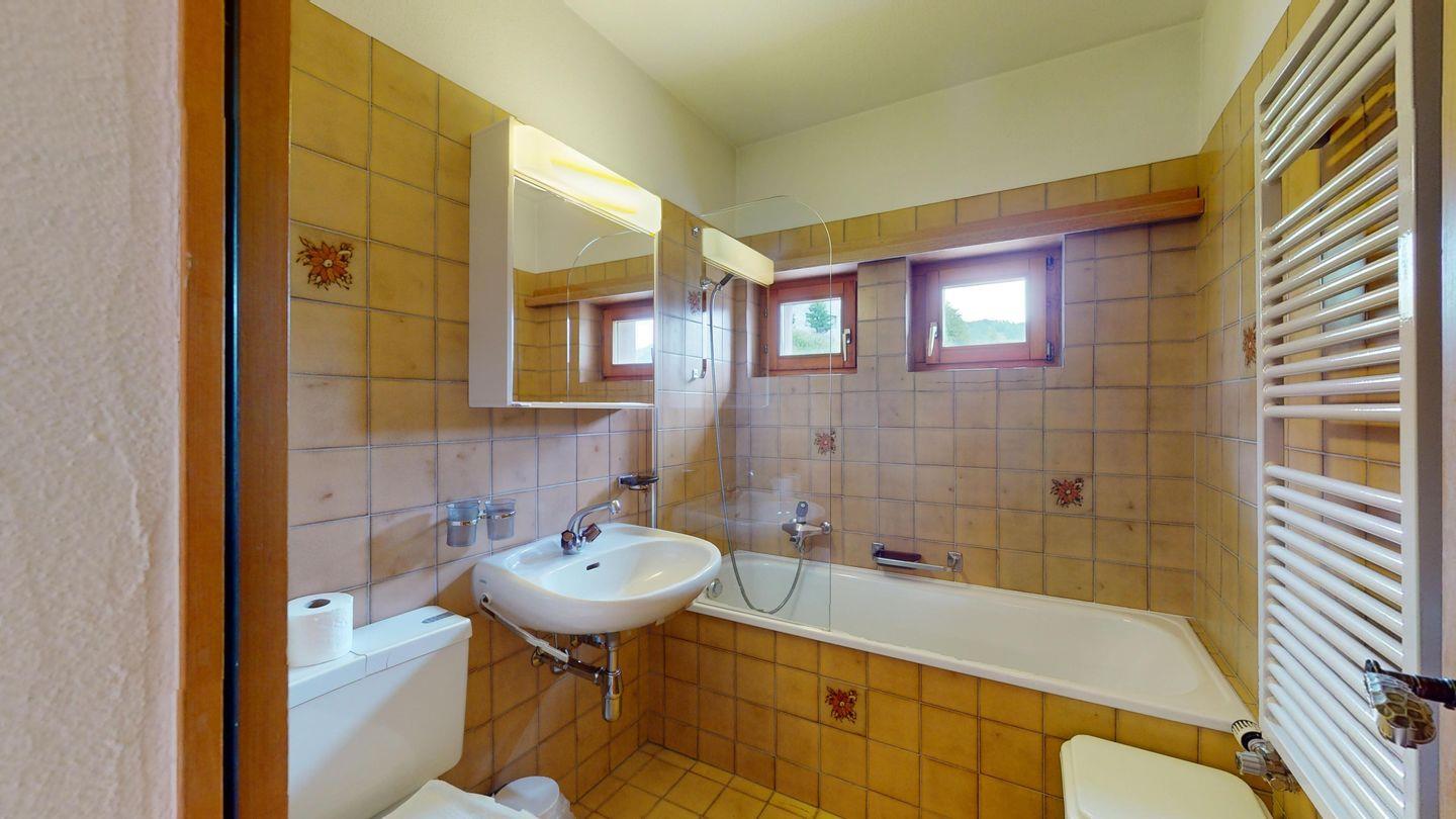 5-½ Zimmerwohnung an sonniger Lage, mit herrlicher Sicht ins Tal und auf mehreren Etagen verteilt. Eingang mit Garderobe und Badezimmer mit Wanne, WC, Bidet und Waschbecken. Wohnzimmer mit TV, Kamin, Terrasse und Garten. Küche mit Herd, Ofen, Kühlschrank und Geschirrspüler. Esszimmer mit zwei Esstischen und Terrasse. Gäste-WC. Ein Einzelschlafzimmer. Ein Doppelschlafzimmer mit eigenem Badezimmer (Dusche, WC, Bidet und Lavabo). Ein Doppelschlafzimmer, und ein Schlafzimmer mit zwei Etagenbetten. Badezimmer mit Wanne, WC, Bidet und Waschbecken. Gemeinsame Waschküche und Skiraum. Zwei gedeckte Parkplätze. Haustiere sind nicht erlaubt. Nichtraucherwohnung.