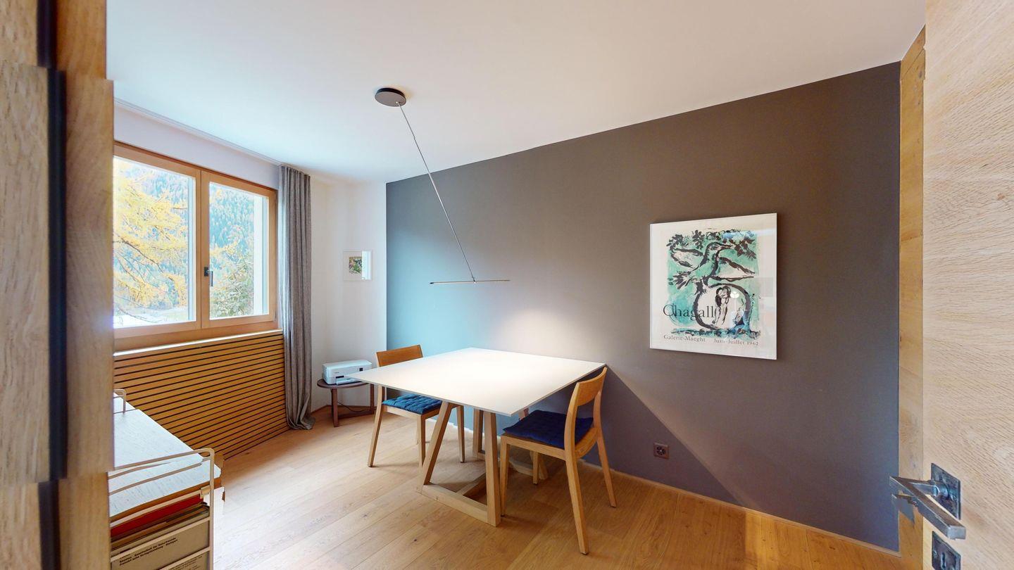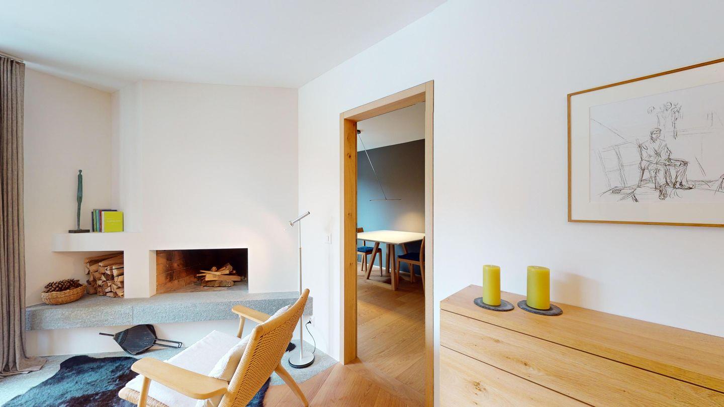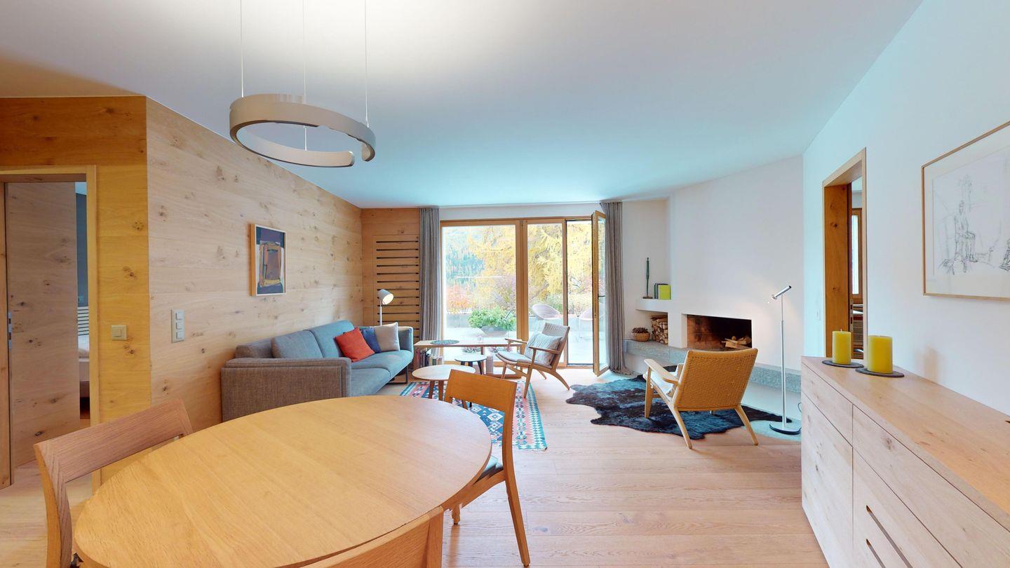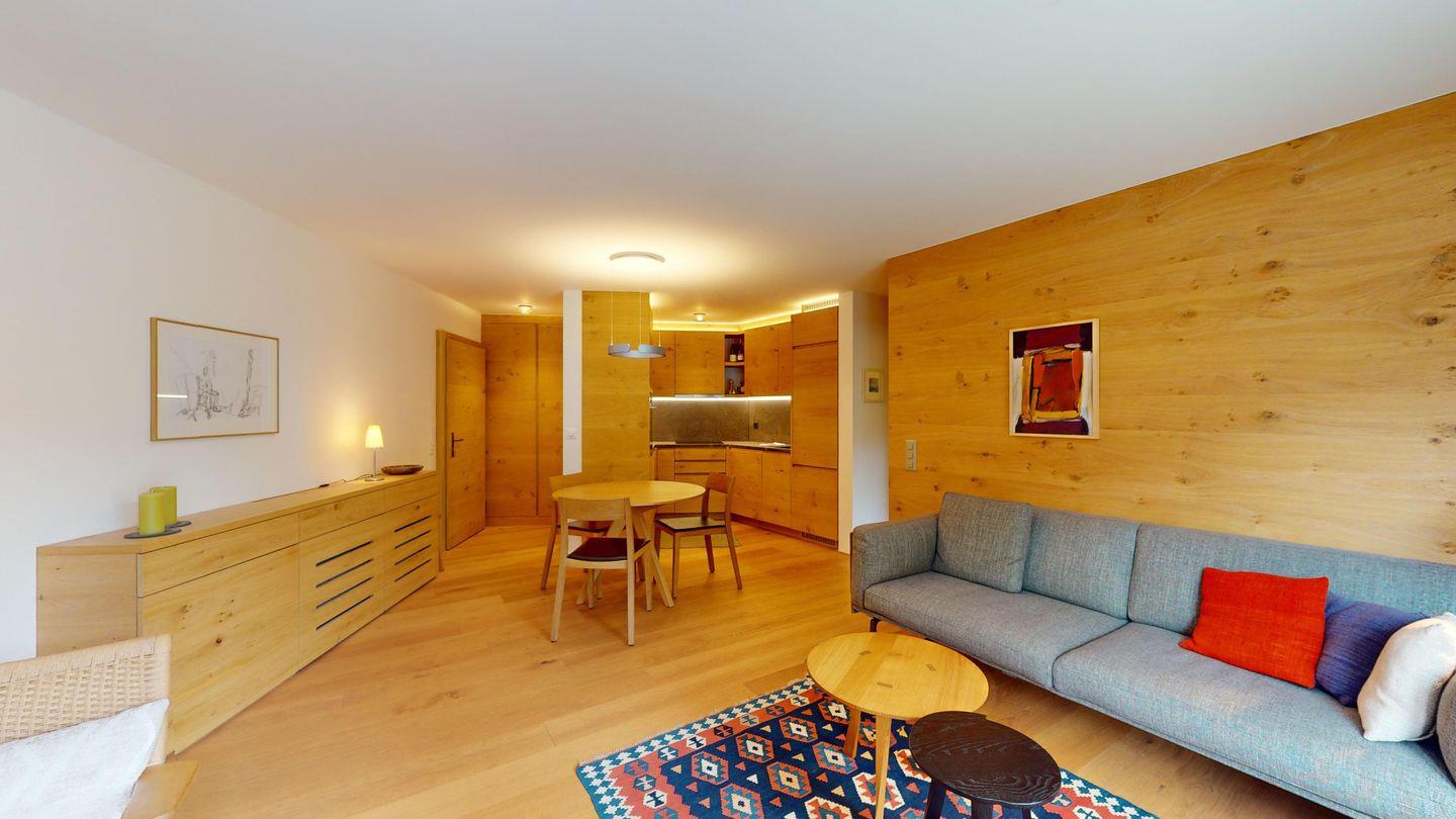Gemütliche 3½-Zimmerwohnung im 1. Stock. Eingang mit Garderobe. Wohnzimmer mit Cheminée und grosse Terrasse mit Esstisch und Gasgrill. Internet und Fernseher. Schlafzimmer mit Doppelbett (160cm breit). Offene Küche mit Herd, Ofen, Geschirrspüler, Kühlschrank und Chicco d'Oro Kaffeemaschine. Geschlossenes Büro mit Schreibtisch. Badezimmer mit Dusche, WC, Lavabo. Parkplatz in einer Einzelbox. Gemeinschaftliche Waschküche und Skiraum mit zwei Schlitten. Nichtraucherwohnung. Haustiere sind nicht erlaubt.