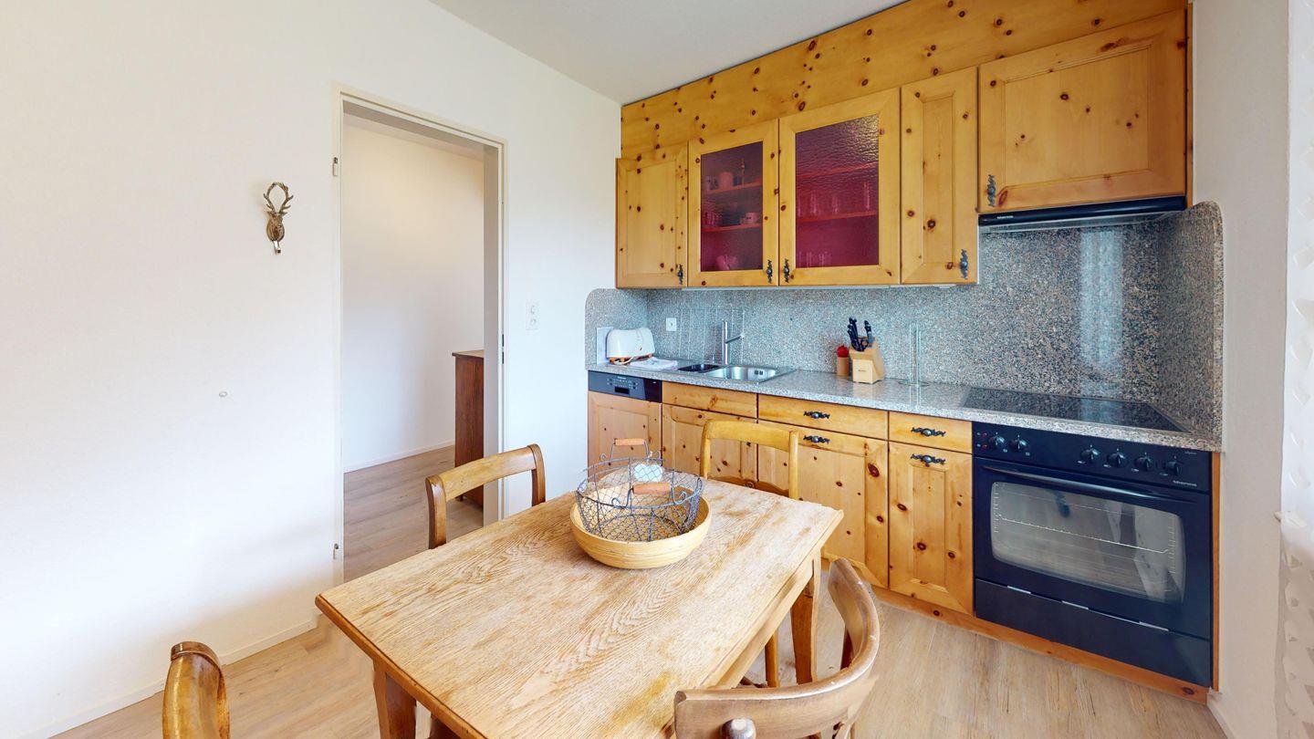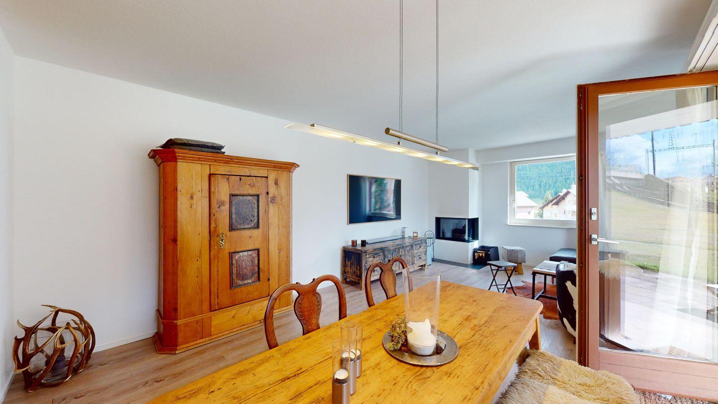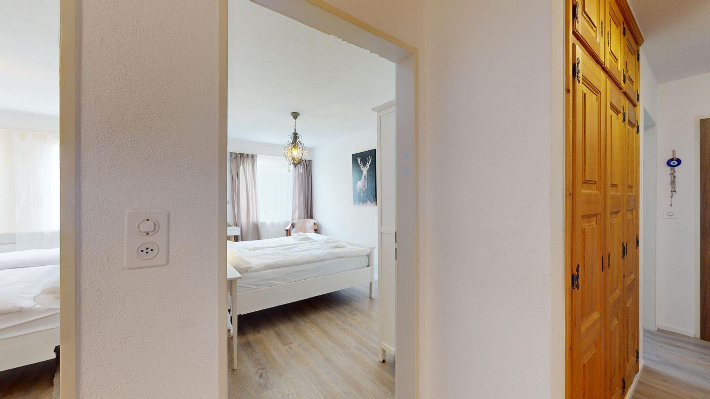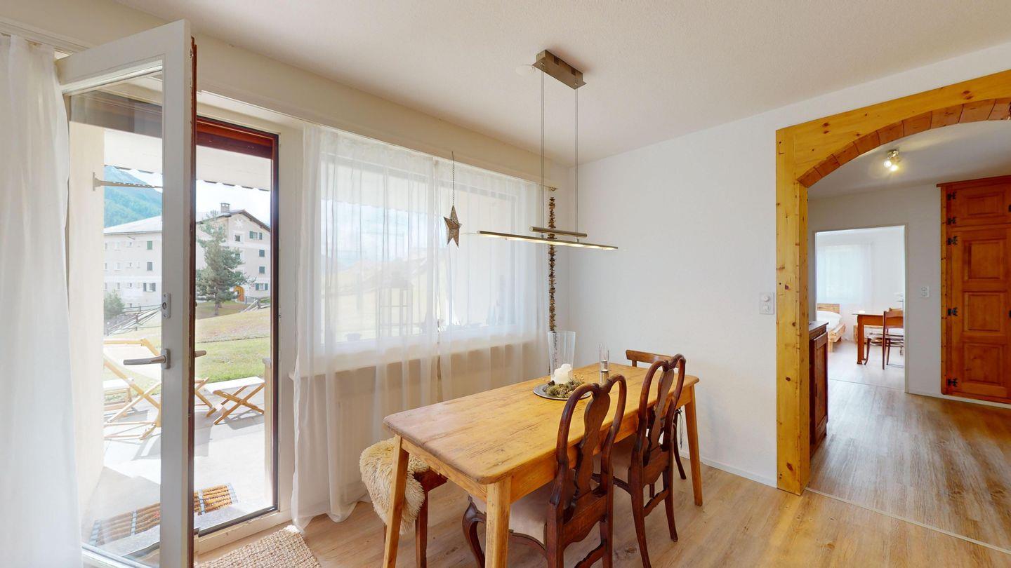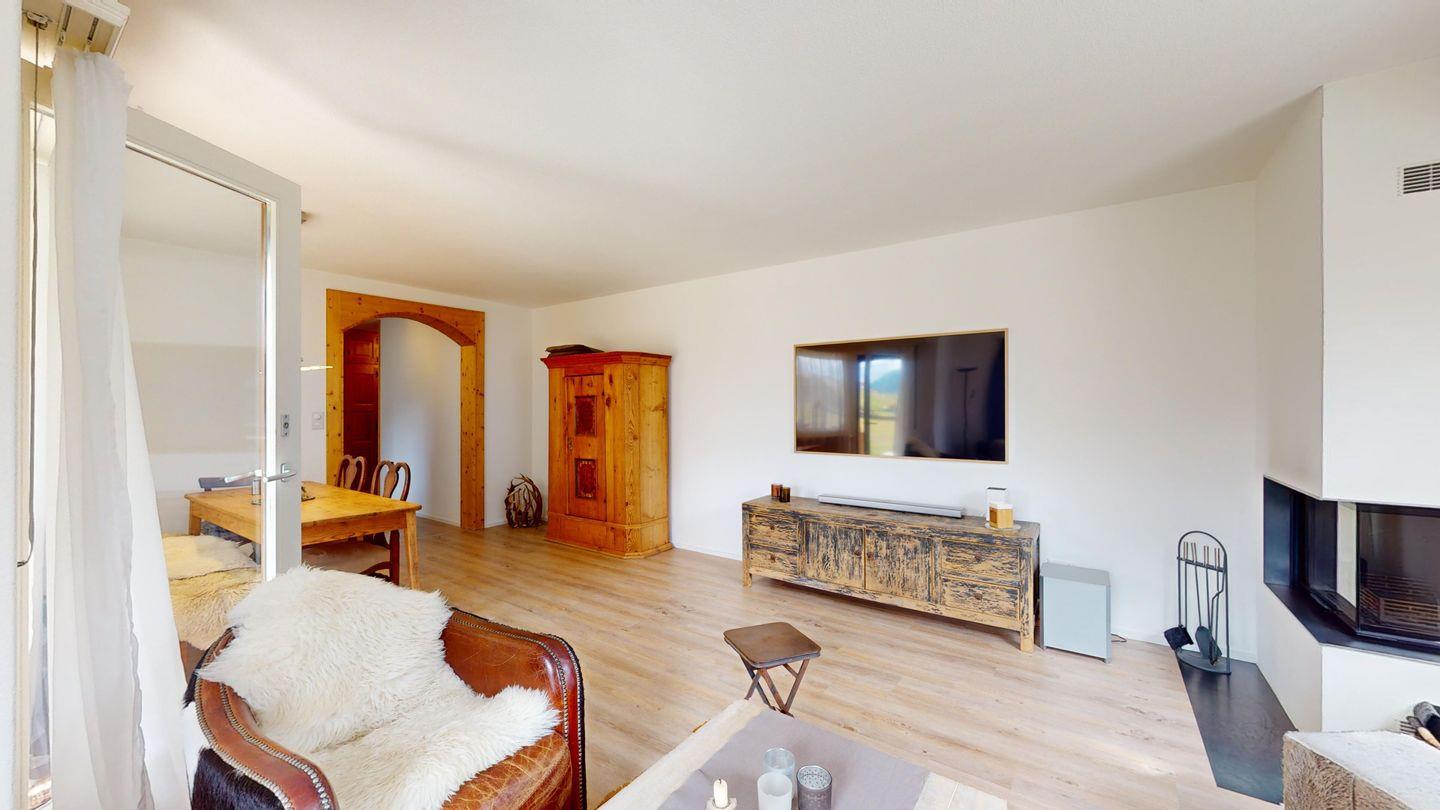 5-Zimmerwohnung im Erdgeschoss. Wohn-/Esszimmer mit Cheminee und direktem Ausgang in den Garten. TV, Internet. Geschlossene Küche mit Backofen, Kühlschrank, Geschirrspüler, Kaffeemaschine Chicco d'Oro, Racletteofen, Fondue-Set. Drei Doppelzimmer und ein Schlafzimmer mit 2 Einzelbetten. Ein Badezimmer mit Dusche/WC/Lavabo. Ein Badezimmer mit Badewanne/WC/Lavabo. Neue, komfortable Einrichtung. Waschküche und Skiraum zur gemeinsamen Benützung im Haus. Reservierter Garagenplatz. Haustiere sind nicht erlaubt.