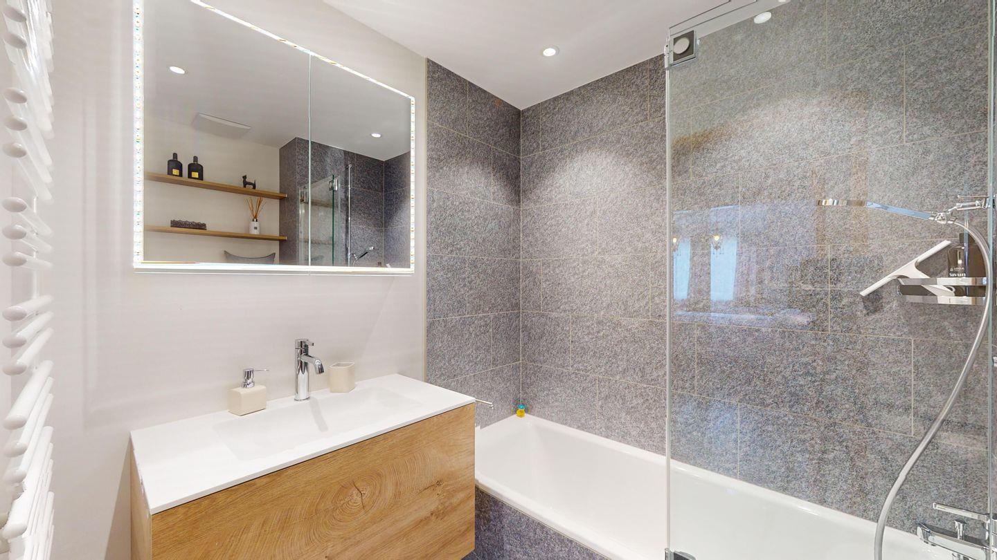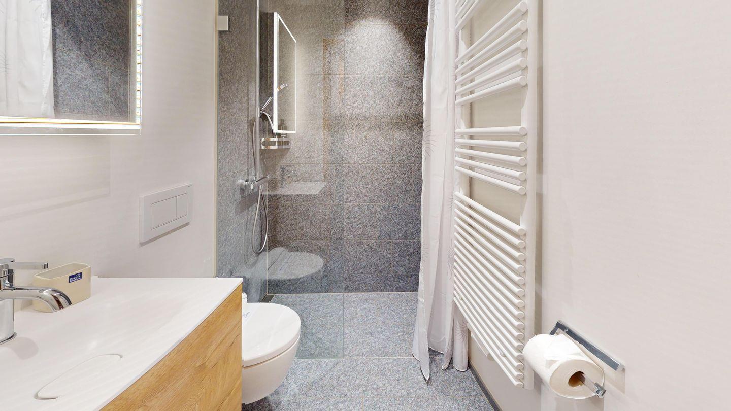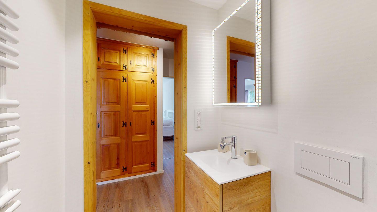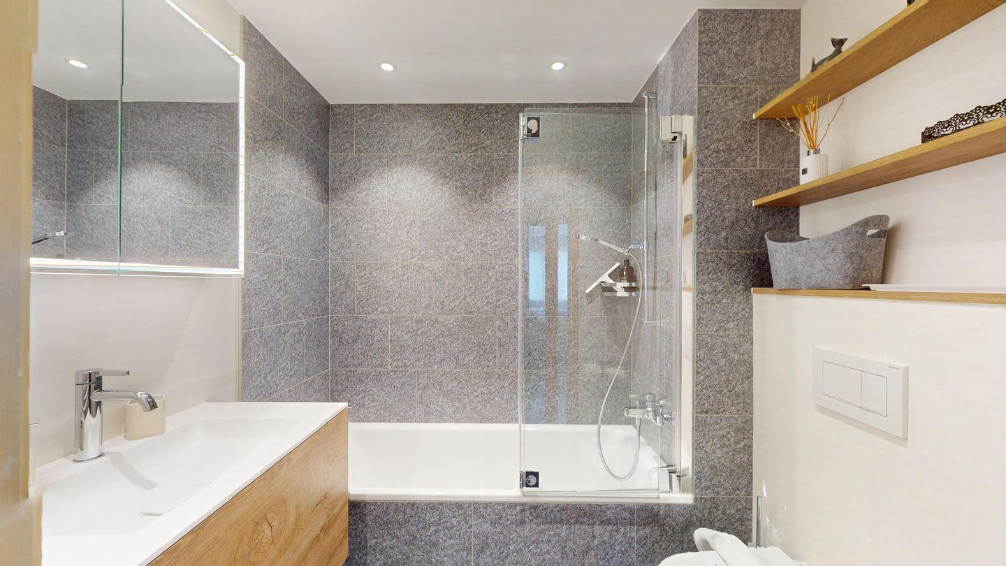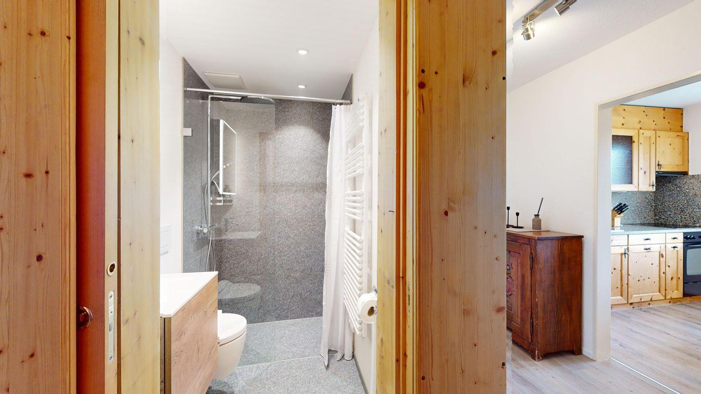 5-Zimmerwohnung im Erdgeschoss. Wohn-/Esszimmer mit Cheminee und direktem Ausgang in den Garten. TV, Internet. Geschlossene Küche mit Backofen, Kühlschrank, Geschirrspüler, Kaffeemaschine Chicco d'Oro, Racletteofen, Fondue-Set. Drei Doppelzimmer und ein Schlafzimmer mit 2 Einzelbetten. Ein Badezimmer mit Dusche/WC/Lavabo. Ein Badezimmer mit Badewanne/WC/Lavabo. Neue, komfortable Einrichtung. Waschküche und Skiraum zur gemeinsamen Benützung im Haus. Reservierter Garagenplatz. Haustiere sind nicht erlaubt.