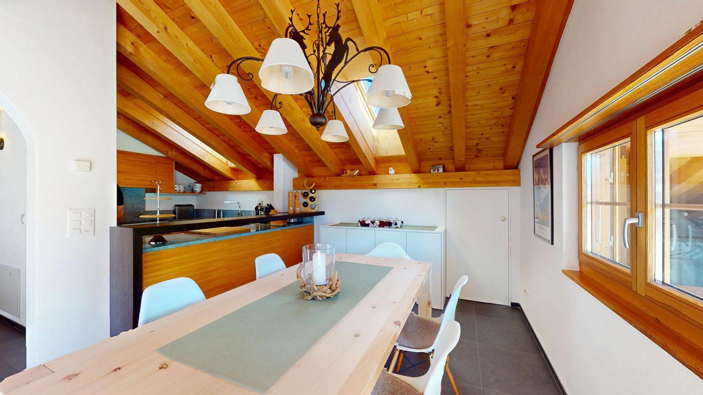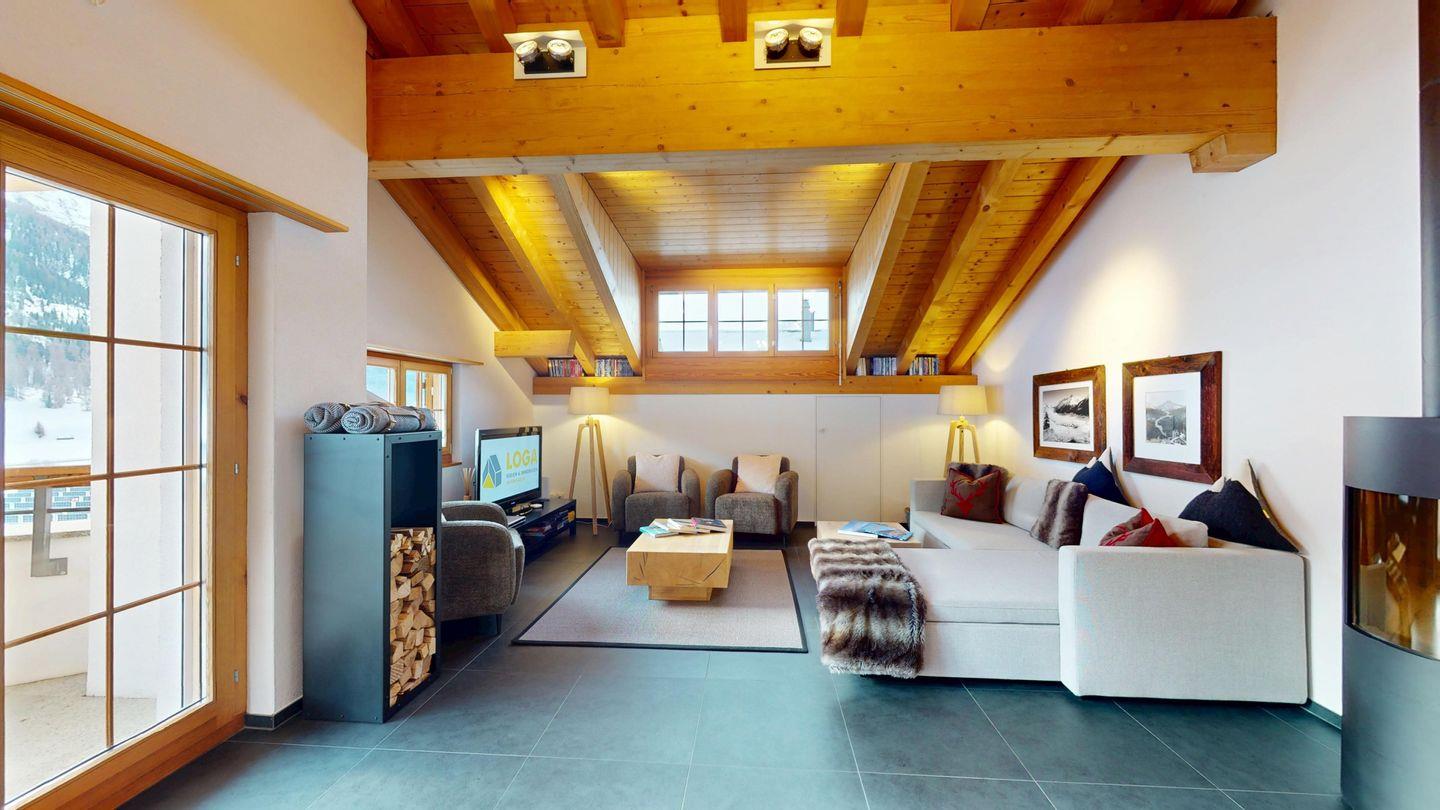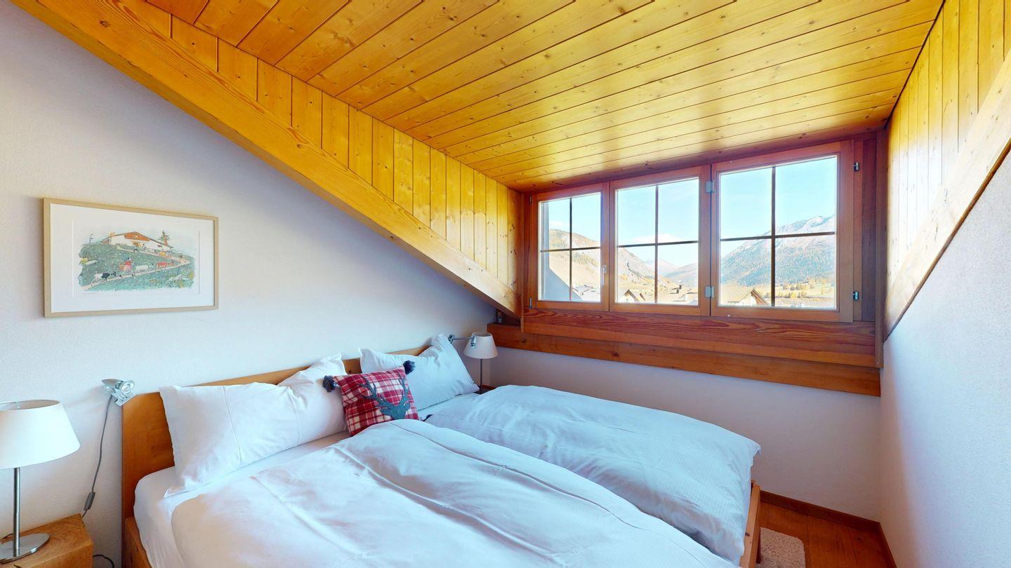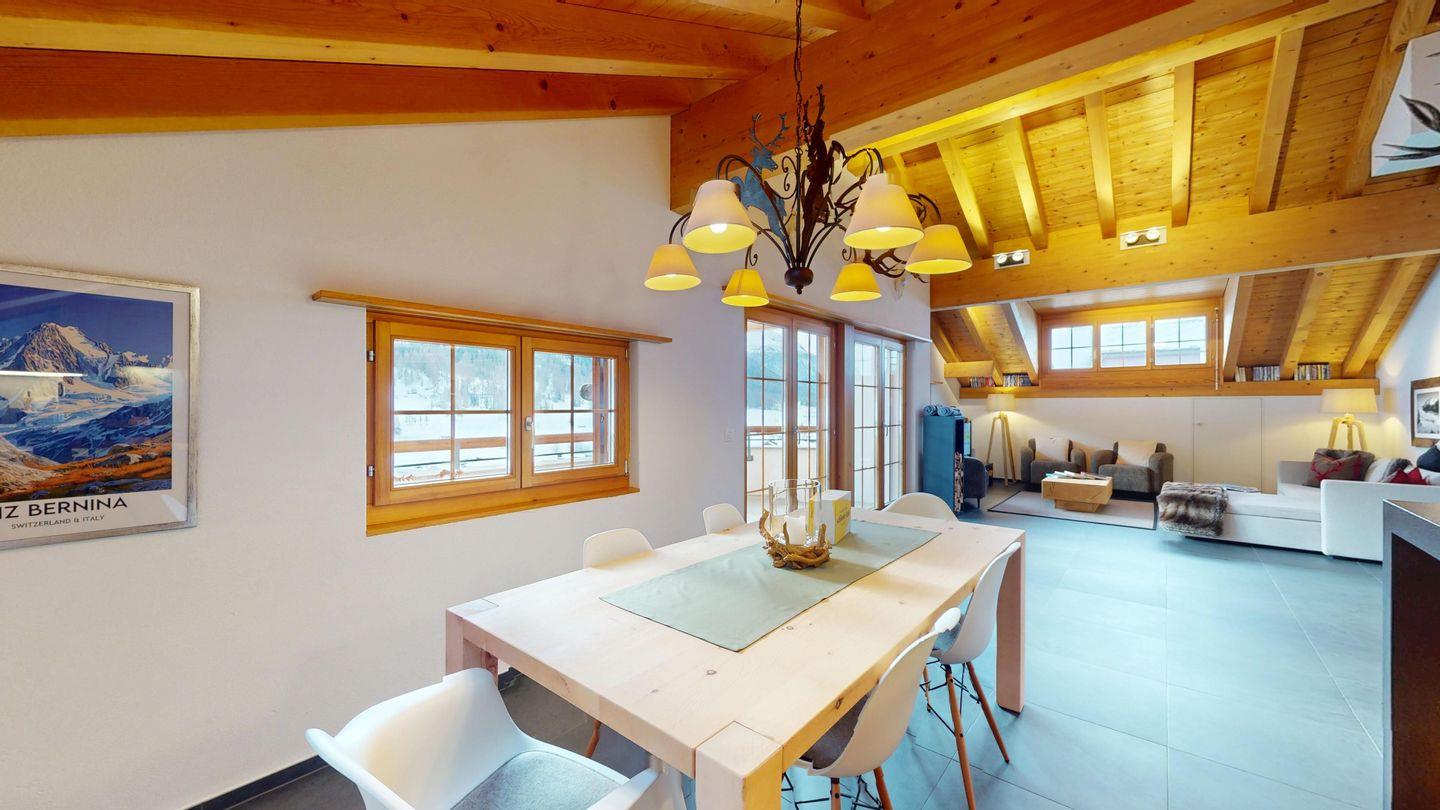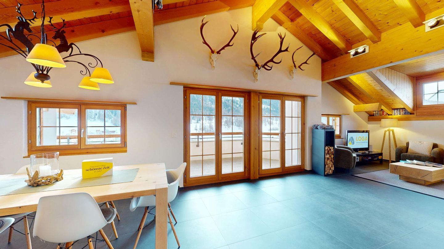 Grosszügige 4½-Zimmerwohnung im Dachgeschoss. Zutritt direkt mit Lift in die Wohnung. Eingang mit Garderobe. Sonniges Wohnzimmer mit Kaminofen, Zugang zum Südbalkon, und Essbereich. Offene Küche mit Herd, Backofen und Kühlschrank. Zwei Doppelschlafzimmer. Ein Schlafzimmer mit Etagenbett und einem Einzelbett. Ein Badezimmer mit Doppellavabo, Badewanne und WC. Zweites Badezimmer mit Dusche, Lavabo und WC. Eigene Waschmaschine/Tumbler. Zwei Parkplätze in der Garage. Haustiere sind willkommen. Nichtraucherwohnung.