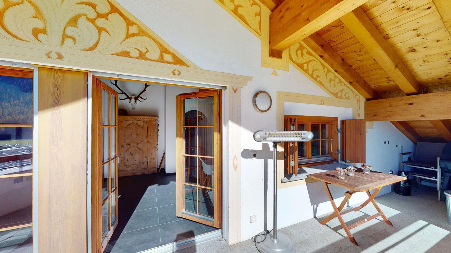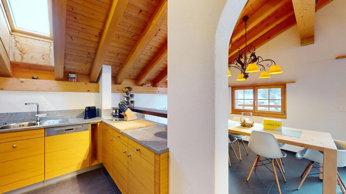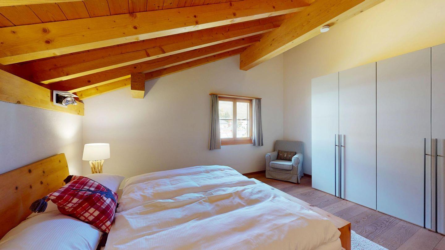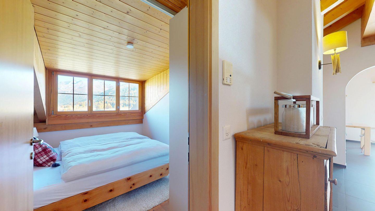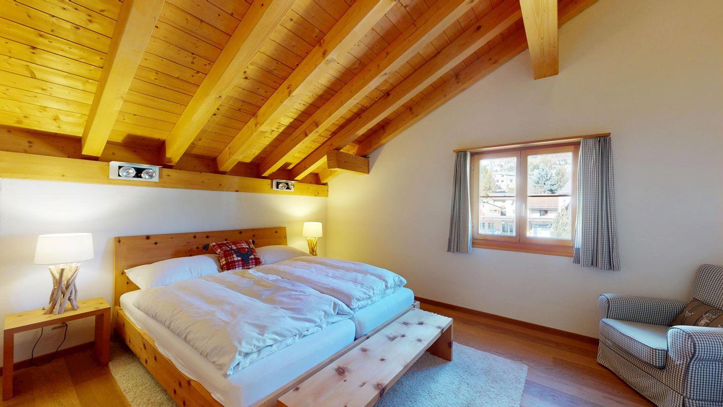 Grosszügige 4½-Zimmerwohnung im Dachgeschoss. Zutritt direkt mit Lift in die Wohnung. Eingang mit Garderobe. Sonniges Wohnzimmer mit Kaminofen, Zugang zum Südbalkon, und Essbereich. Offene Küche mit Herd, Backofen und Kühlschrank. Zwei Doppelschlafzimmer. Ein Schlafzimmer mit Etagenbett und einem Einzelbett. Ein Badezimmer mit Doppellavabo, Badewanne und WC. Zweites Badezimmer mit Dusche, Lavabo und WC. Eigene Waschmaschine/Tumbler. Zwei Parkplätze in der Garage. Haustiere sind willkommen. Nichtraucherwohnung.