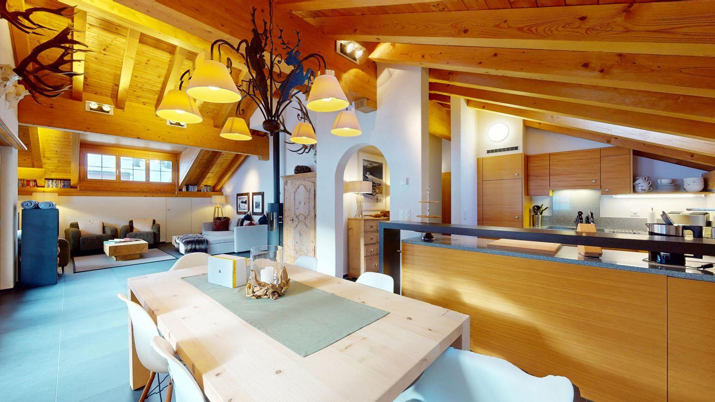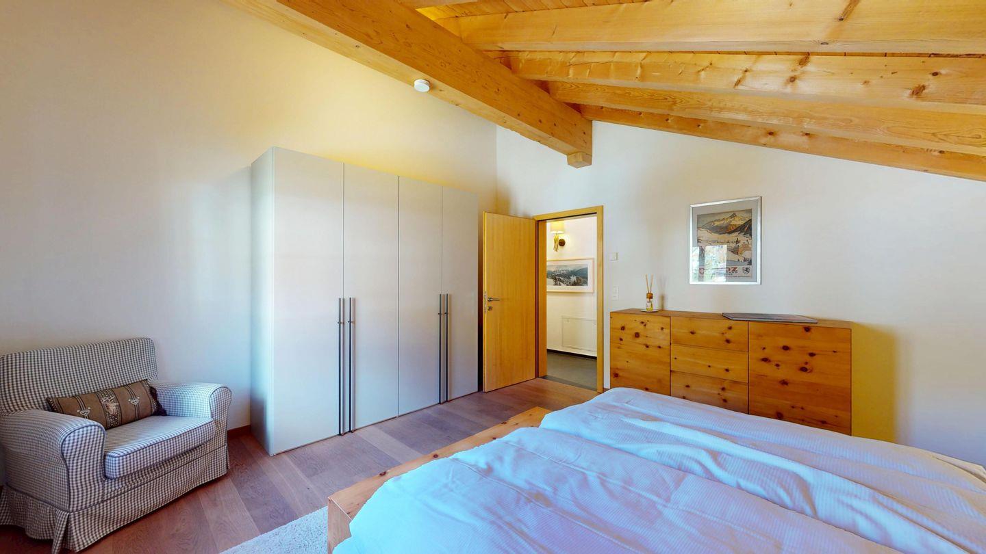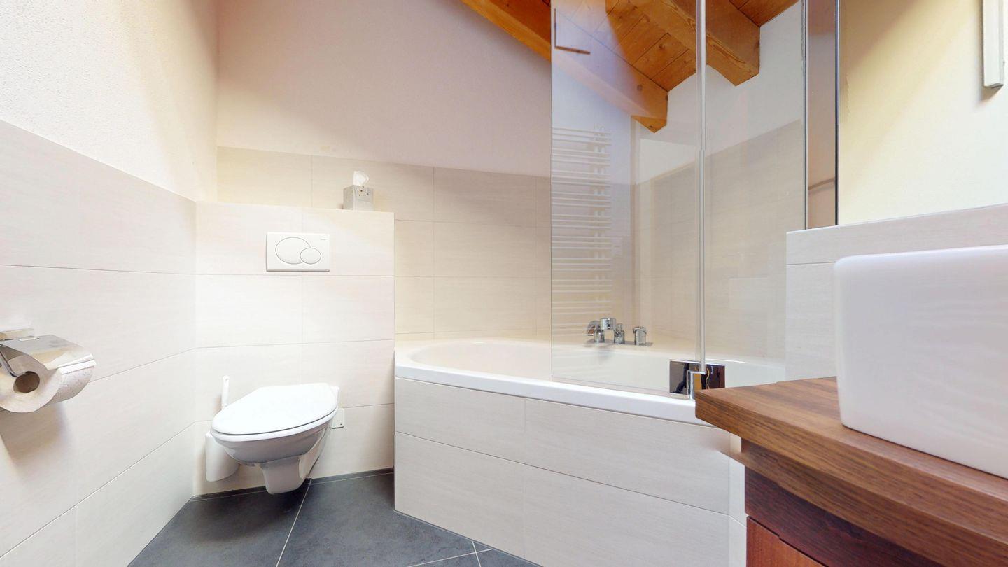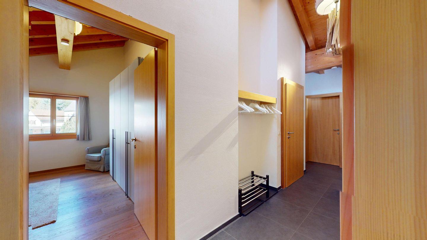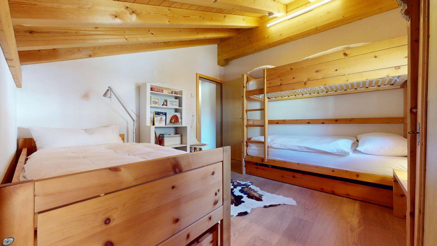 Grosszügige 4½-Zimmerwohnung im Dachgeschoss. Zutritt direkt mit Lift in die Wohnung. Eingang mit Garderobe. Sonniges Wohnzimmer mit Kaminofen, Zugang zum Südbalkon, und Essbereich. Offene Küche mit Herd, Backofen und Kühlschrank. Zwei Doppelschlafzimmer. Ein Schlafzimmer mit Etagenbett und einem Einzelbett. Ein Badezimmer mit Doppellavabo, Badewanne und WC. Zweites Badezimmer mit Dusche, Lavabo und WC. Eigene Waschmaschine/Tumbler. Zwei Parkplätze in der Garage. Haustiere sind willkommen. Nichtraucherwohnung.