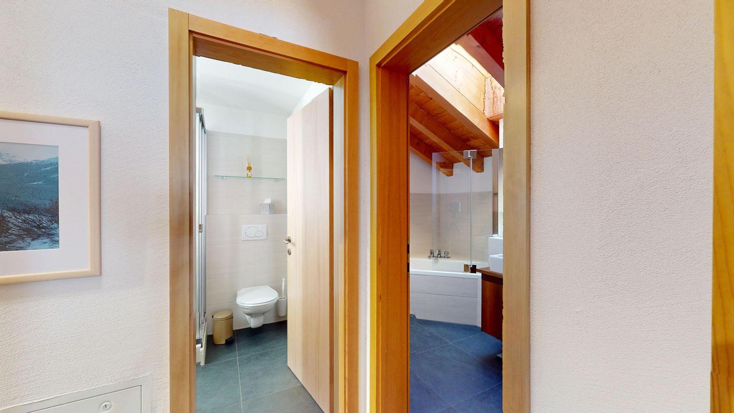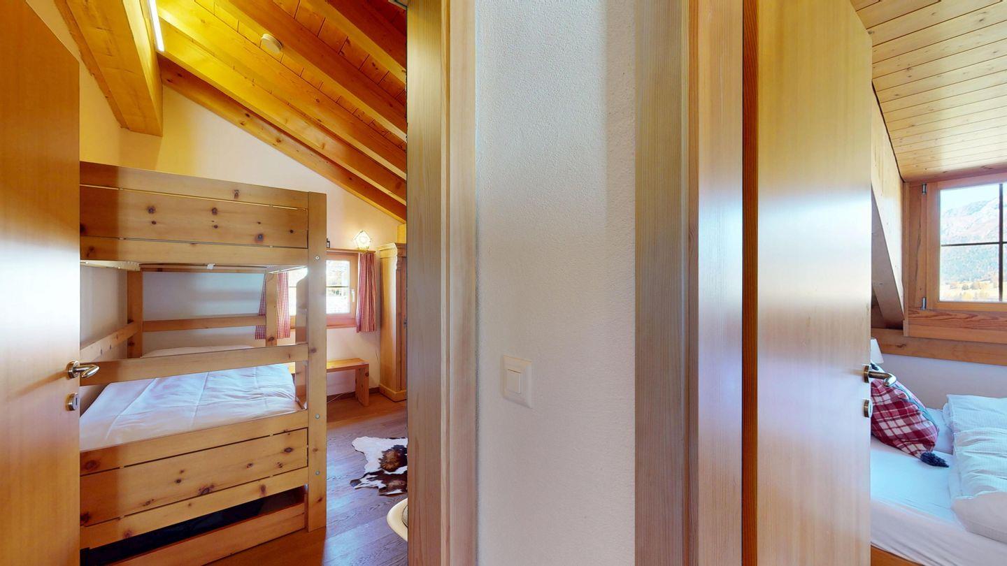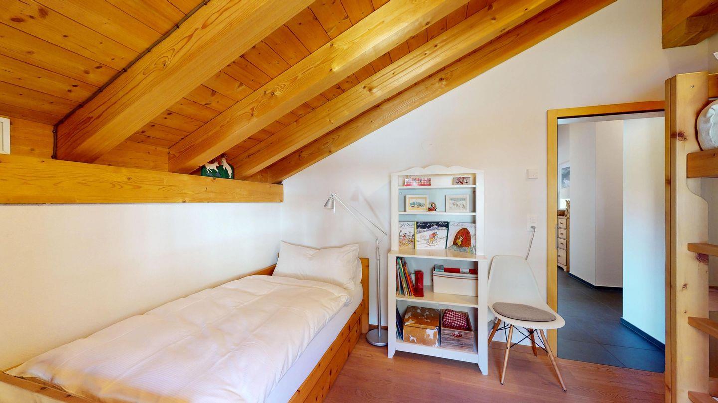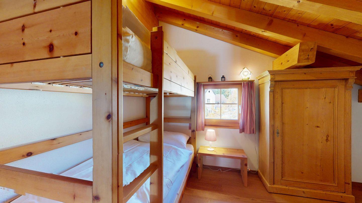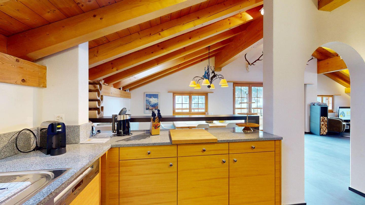 Grosszügige 4½-Zimmerwohnung im Dachgeschoss. Zutritt direkt mit Lift in die Wohnung. Eingang mit Garderobe. Sonniges Wohnzimmer mit Kaminofen, Zugang zum Südbalkon, und Essbereich. Offene Küche mit Herd, Backofen und Kühlschrank. Zwei Doppelschlafzimmer. Ein Schlafzimmer mit Etagenbett und einem Einzelbett. Ein Badezimmer mit Doppellavabo, Badewanne und WC. Zweites Badezimmer mit Dusche, Lavabo und WC. Eigene Waschmaschine/Tumbler. Zwei Parkplätze in der Garage. Haustiere sind willkommen. Nichtraucherwohnung.