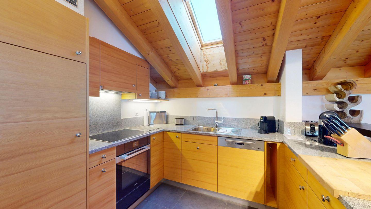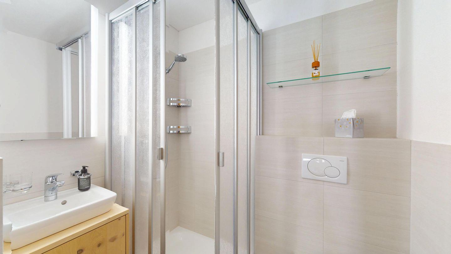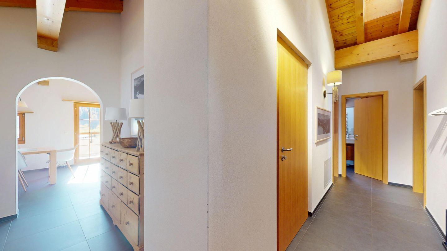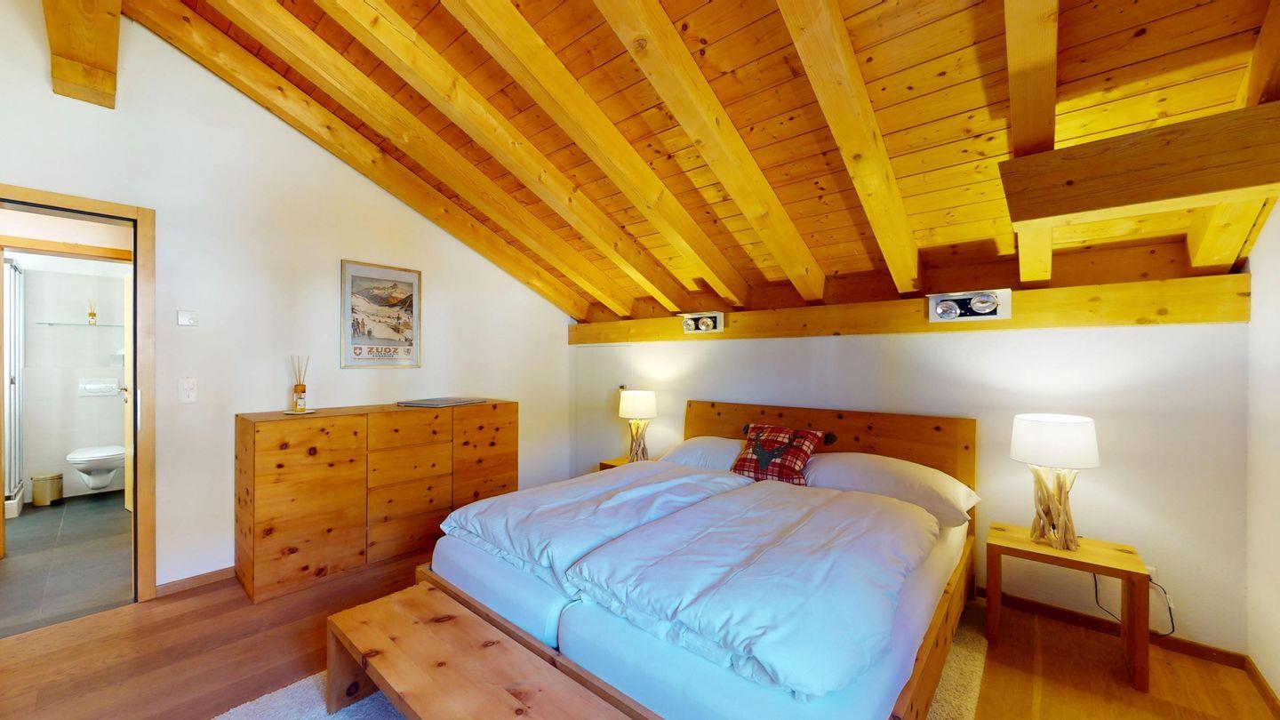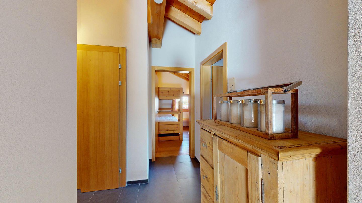 Grosszügige 4½-Zimmerwohnung im Dachgeschoss. Zutritt direkt mit Lift in die Wohnung. Eingang mit Garderobe. Sonniges Wohnzimmer mit Kaminofen, Zugang zum Südbalkon, und Essbereich. Offene Küche mit Herd, Backofen und Kühlschrank. Zwei Doppelschlafzimmer. Ein Schlafzimmer mit Etagenbett und einem Einzelbett. Ein Badezimmer mit Doppellavabo, Badewanne und WC. Zweites Badezimmer mit Dusche, Lavabo und WC. Eigene Waschmaschine/Tumbler. Zwei Parkplätze in der Garage. Haustiere sind willkommen. Nichtraucherwohnung.