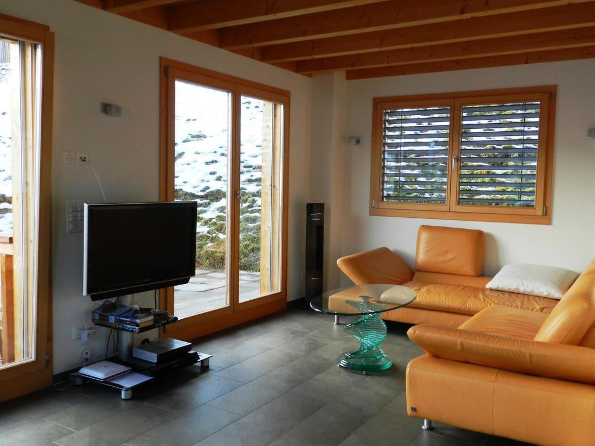 Bright and spacious 6 room chalet (approx. 200sqm). Ground floor: 2 bedrooms with double beds (2x90x190cm), wardrobe and 1 shower/toilet. 1st floor: big living room with sofa, TV, dining area, open-plan kitchen (among other things furnished with ceramic hob, oven, refrigerator with deep-freeze compartment, dishwasher, fully automatic coffee machine with capsules (Nespresso), as well as a fondue- and raclette-set), separate toilet. 1 large balcony and 2 terraces. 2nd floor: 2 bedrooms with a double bed (2x90x190cm) (one of them with TV) wardrobe, 1 small bedroom with a trundle bed (2x90x190cm), wardrobe, 1 bathroom with bathtub/toilet, 1 bathroom with shower/toilet. Store room for skis, shoes and clothes. Baby cot (65x130cm) incl. bed linen and highchair available.